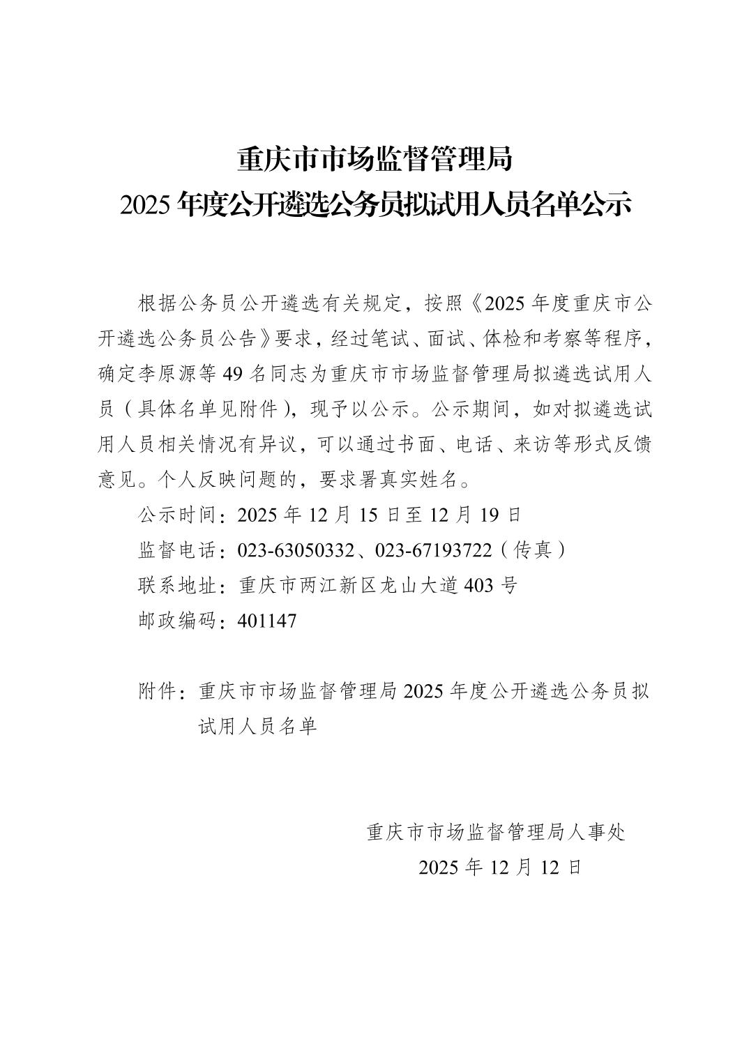 重庆市市场监督管理局2025年度公开遴选公务员拟试用人员名单公示