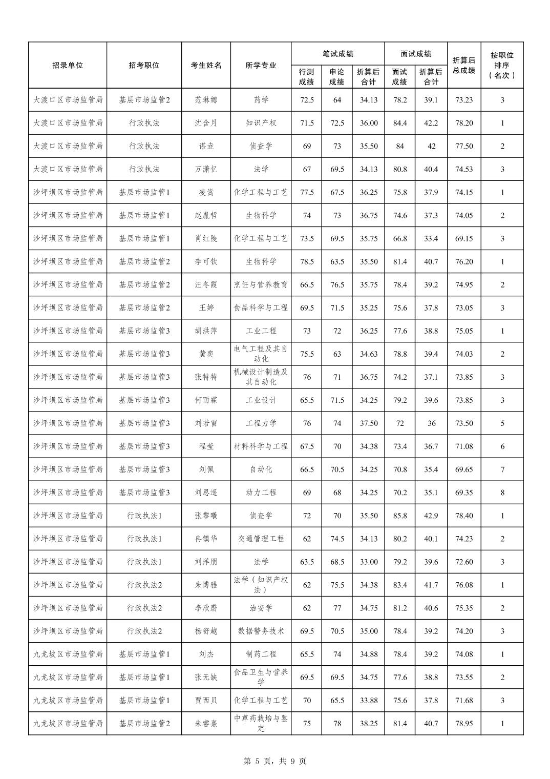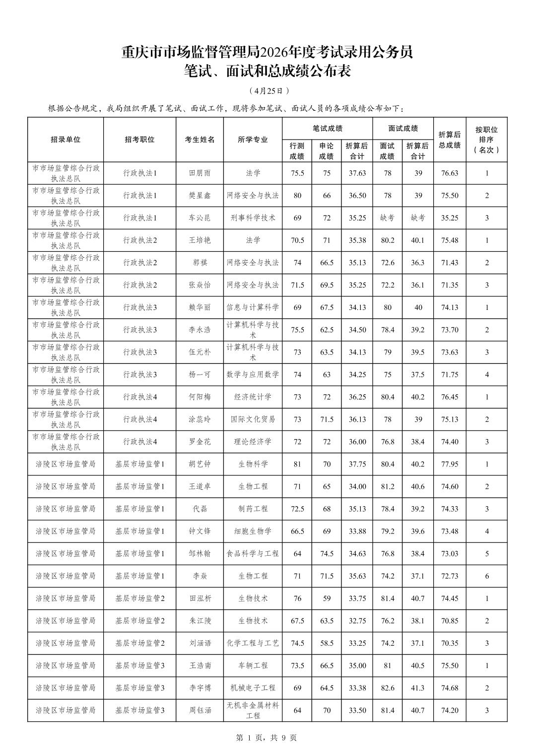 重庆市市场监督管理局2026年考试录用公务员成绩及参加体检人员公布(4月25日面试)