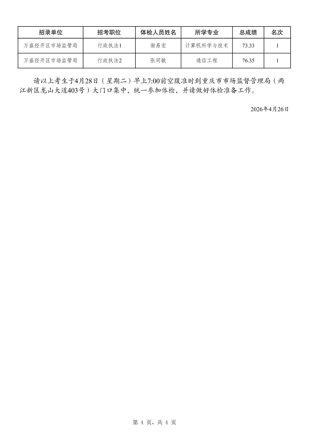 重庆市市场监督管理局2026年考试录用公务员成绩及参加体检人员公布(4月26日面试)