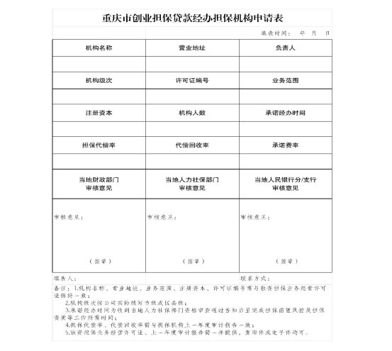 (二)申办流程。符合申报条件的担保机构如实填写《重庆市创业担保贷款经办担保机构申请表》(附件2),向属地区县财政部门提出申请,区县财政部门会同相关部门初审后报市财政局复审。符合申办条件的市级担保机构,直接向市财政局提出申请。