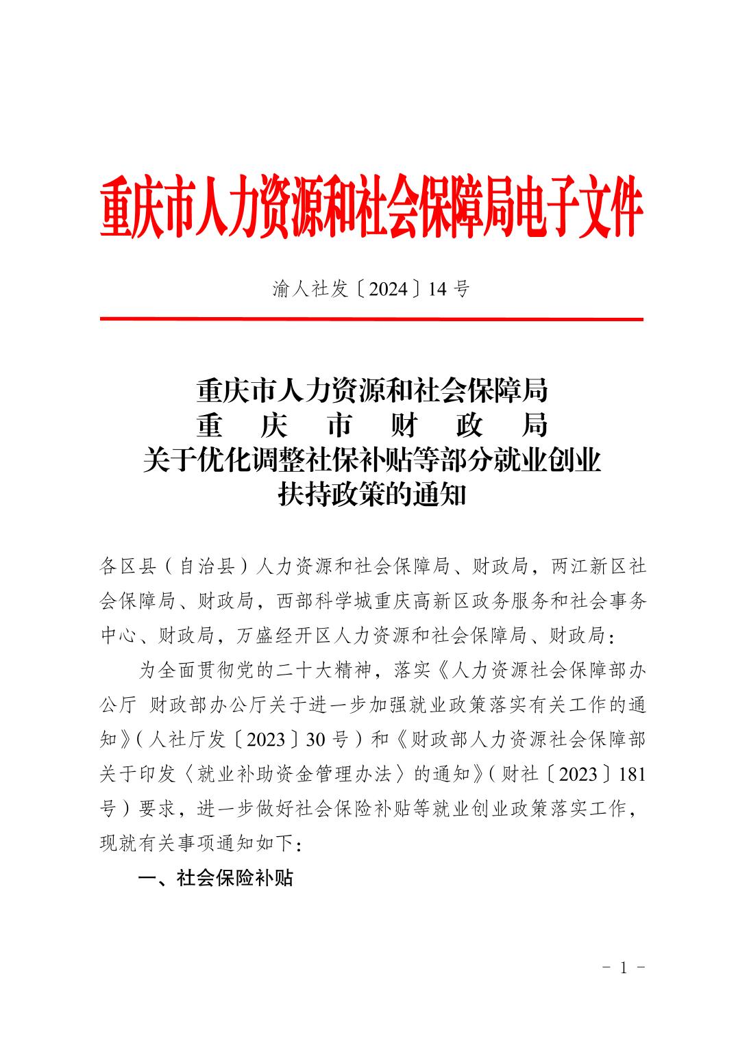 重庆市人力资源和社会保障局重庆市财政局关于优化调整社保补贴等部分就业创业 扶持政策的通知