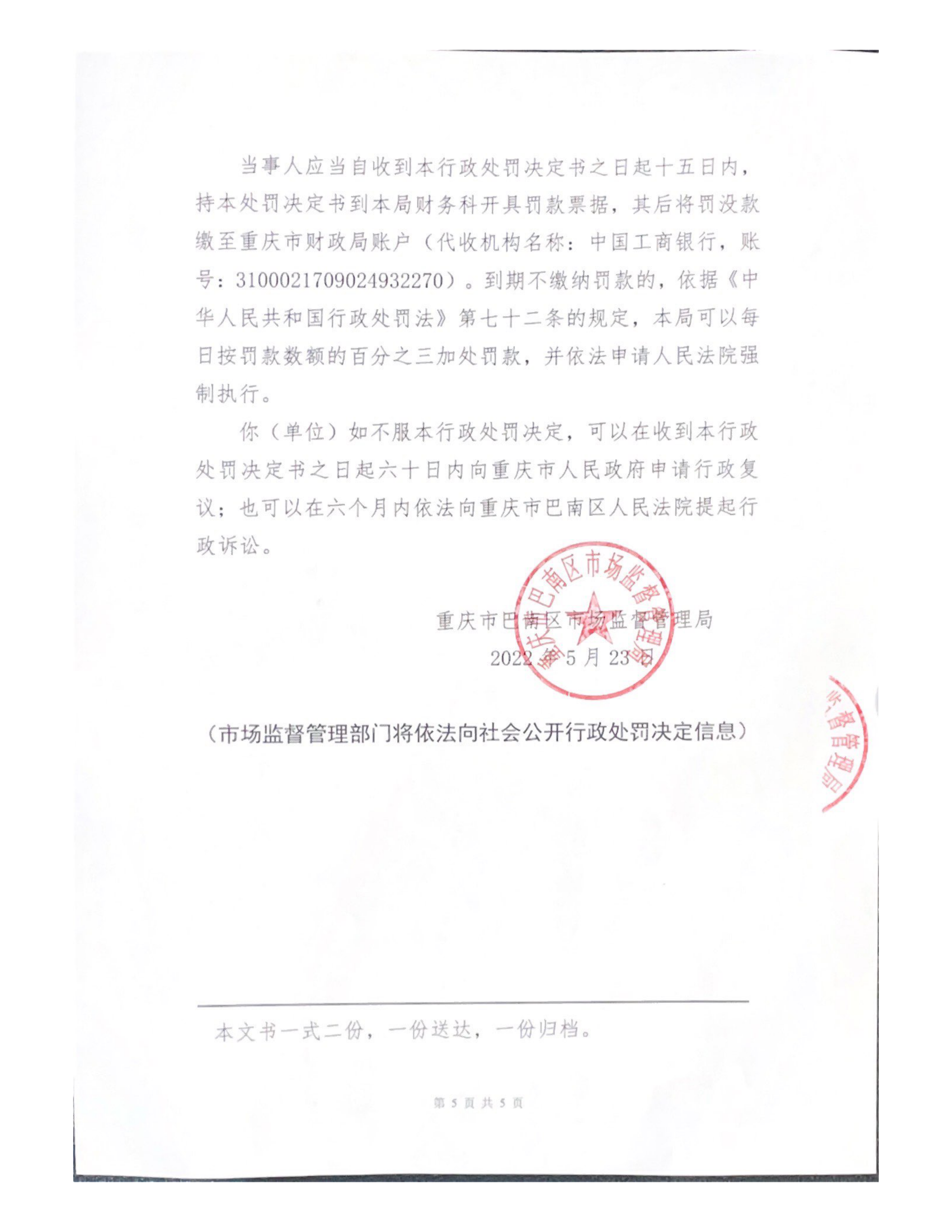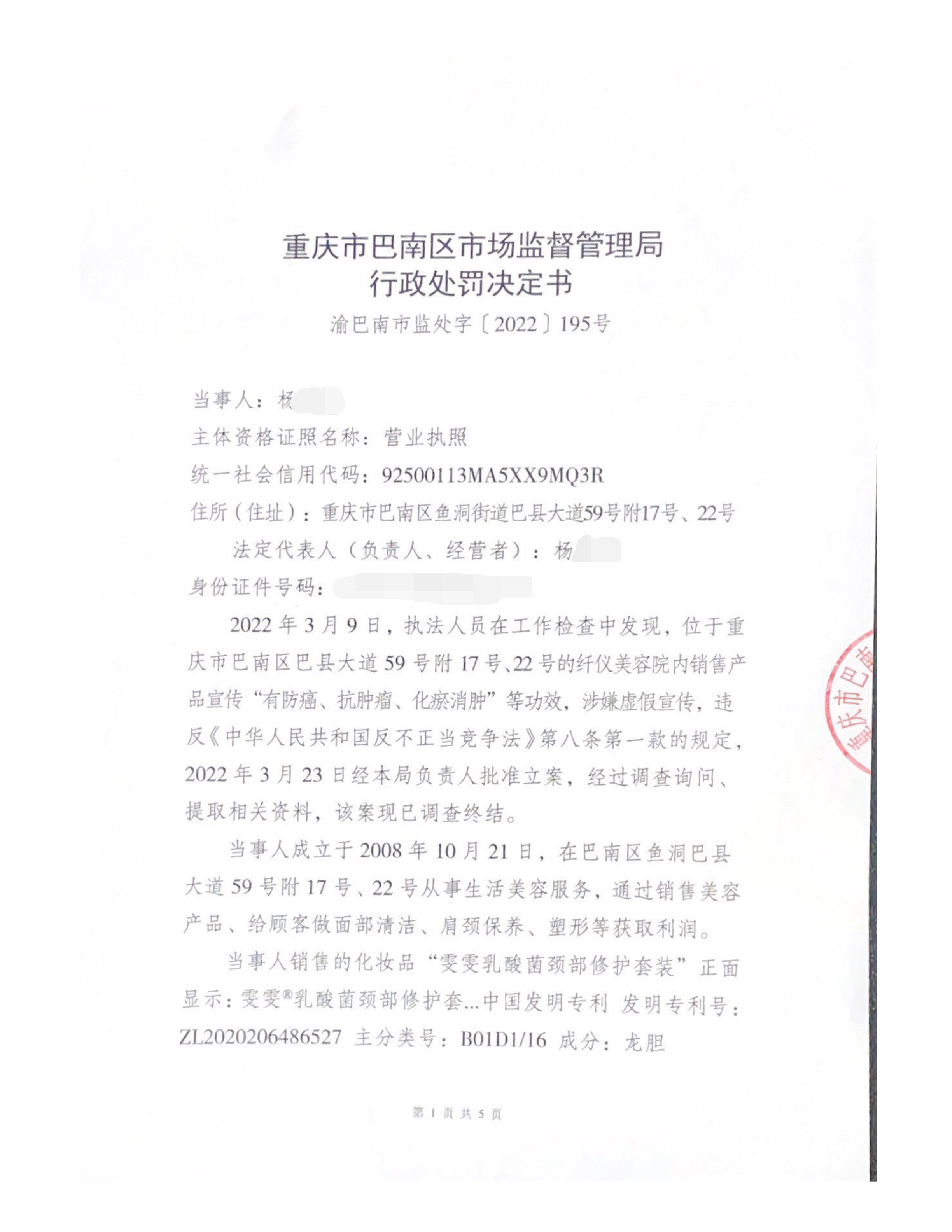 重庆市巴南区市场监督管理局行政处罚决定书(纤仪美容院)