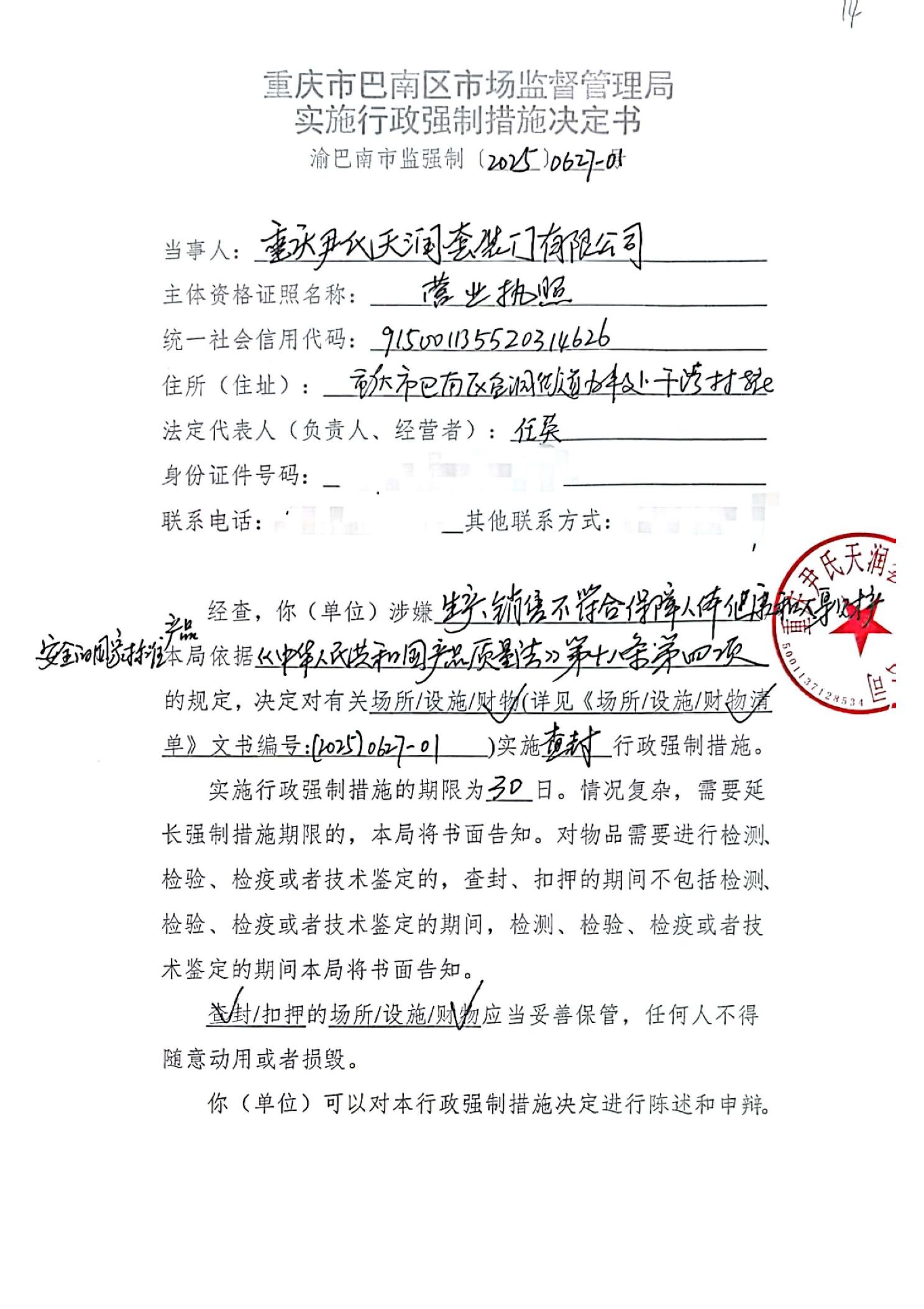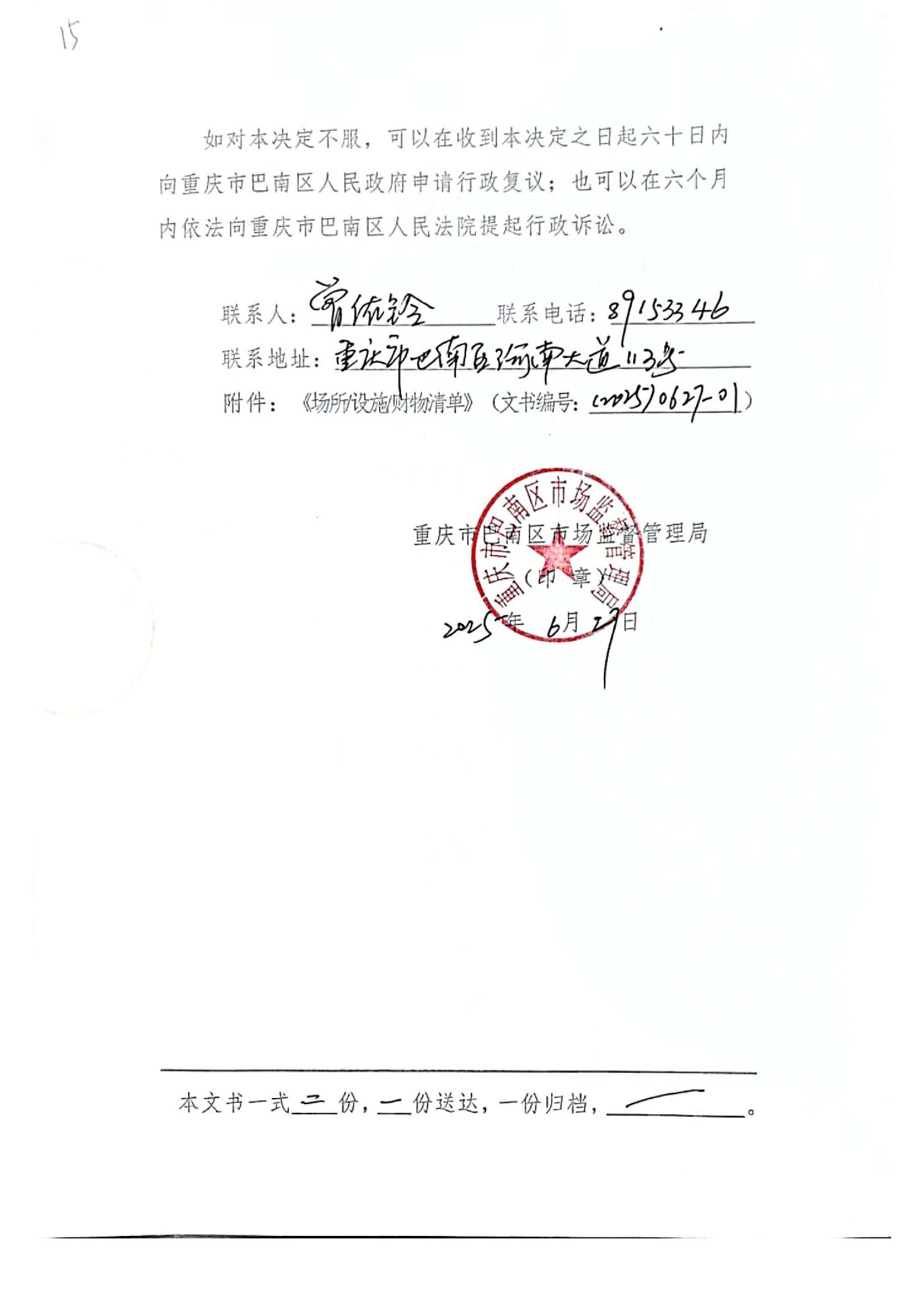 渝巴南市监强制【2025】0627-1号