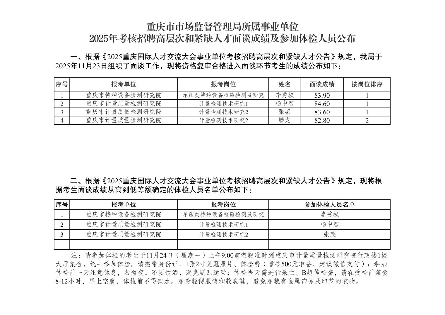 重庆市市场监督管理局所属事业单位2025年考核招聘高层次和紧缺人才面谈成绩及参加体检人员公布
