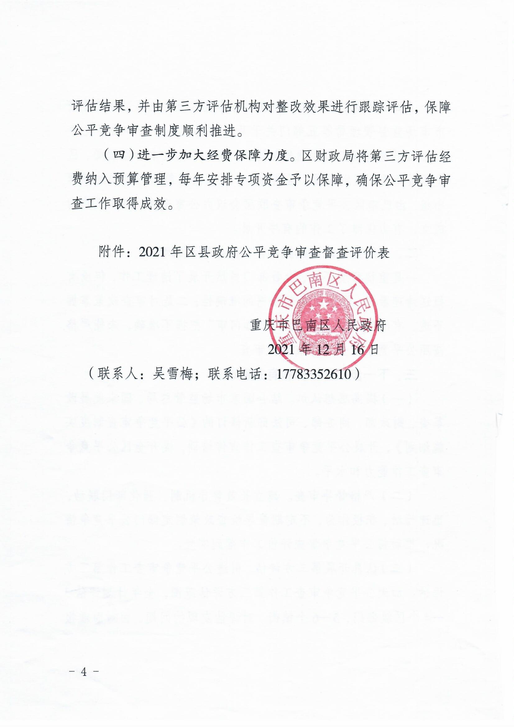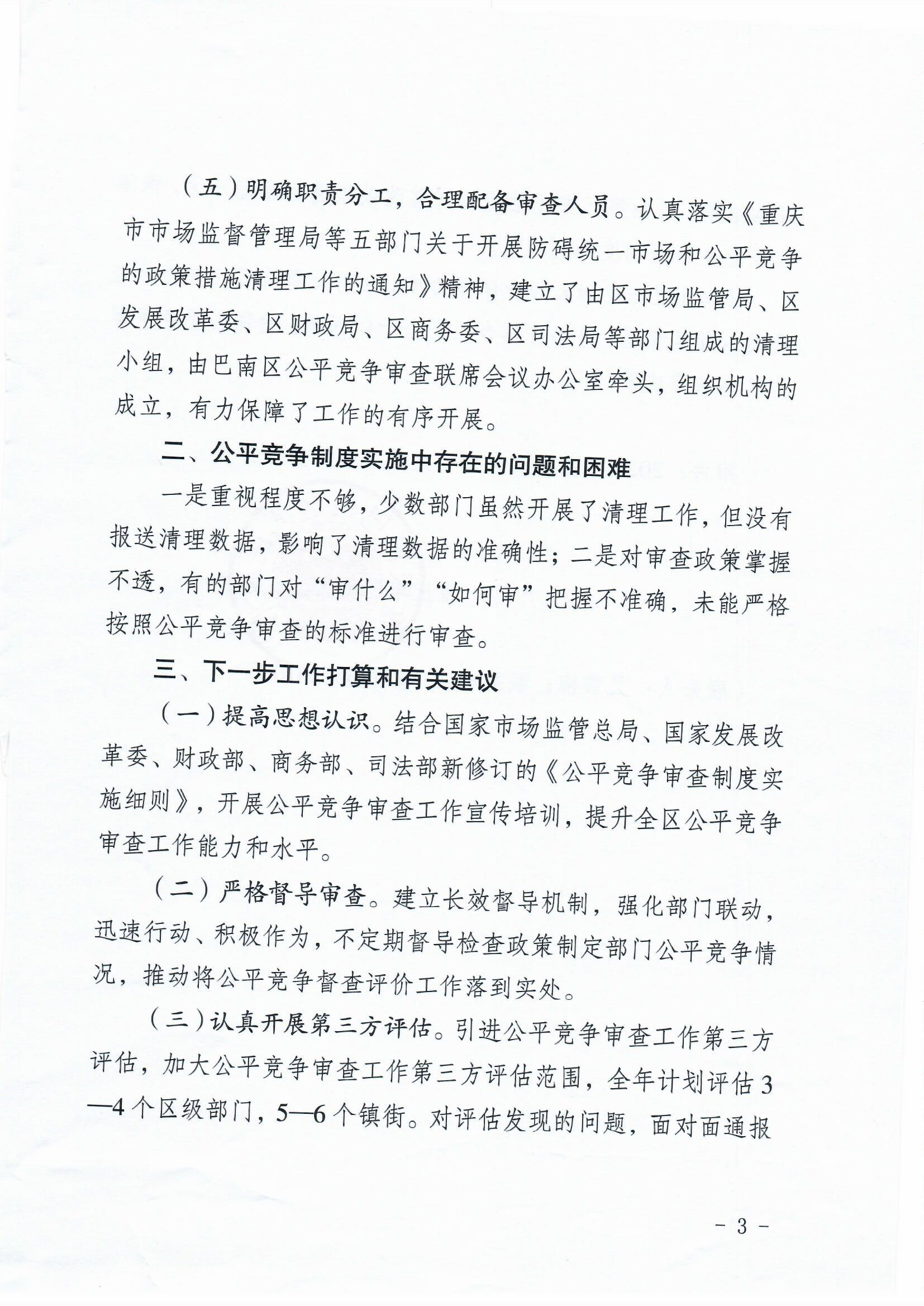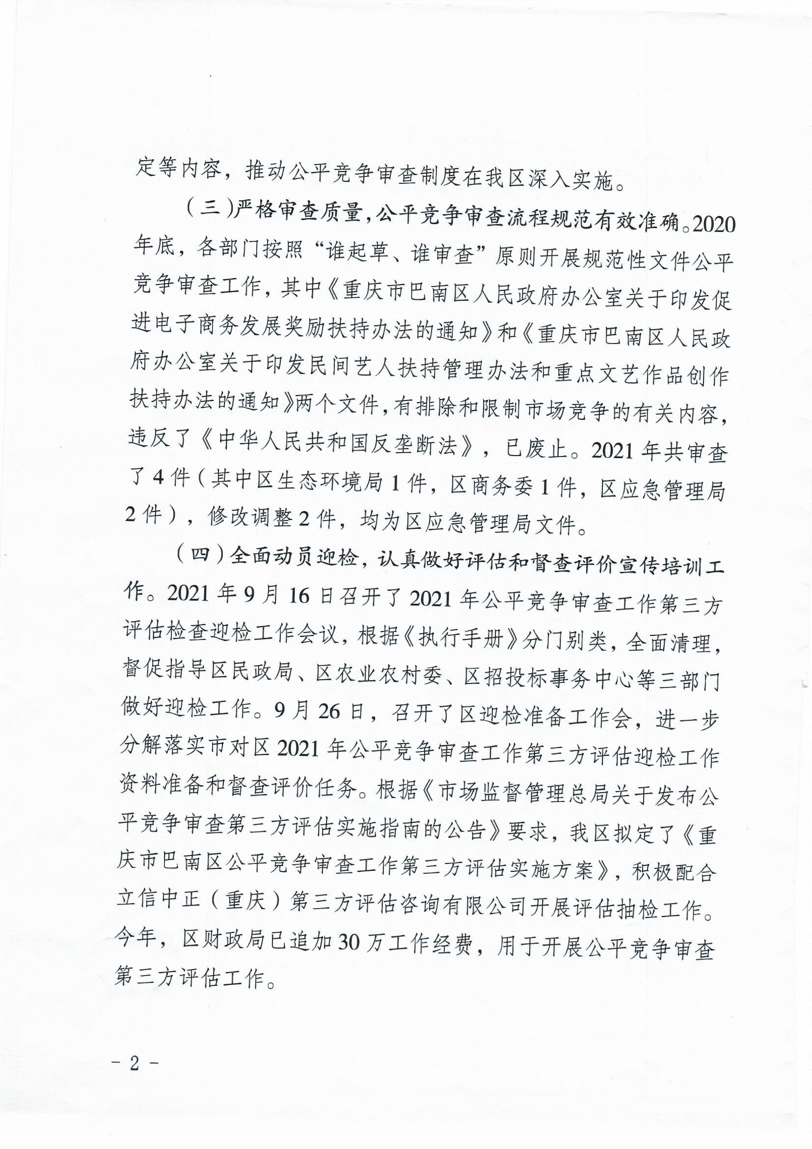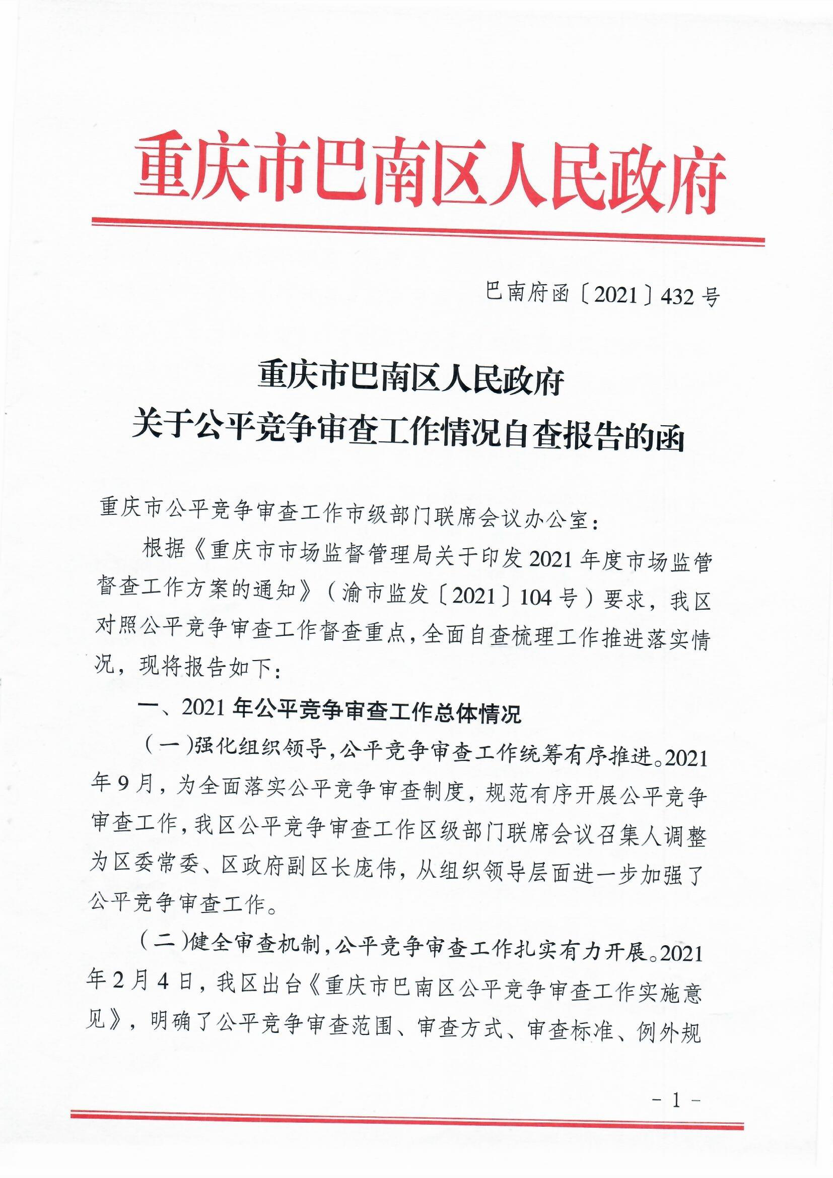 关于公平竞争审查工作情况自查报告的函巴南府函〔2021〕432号