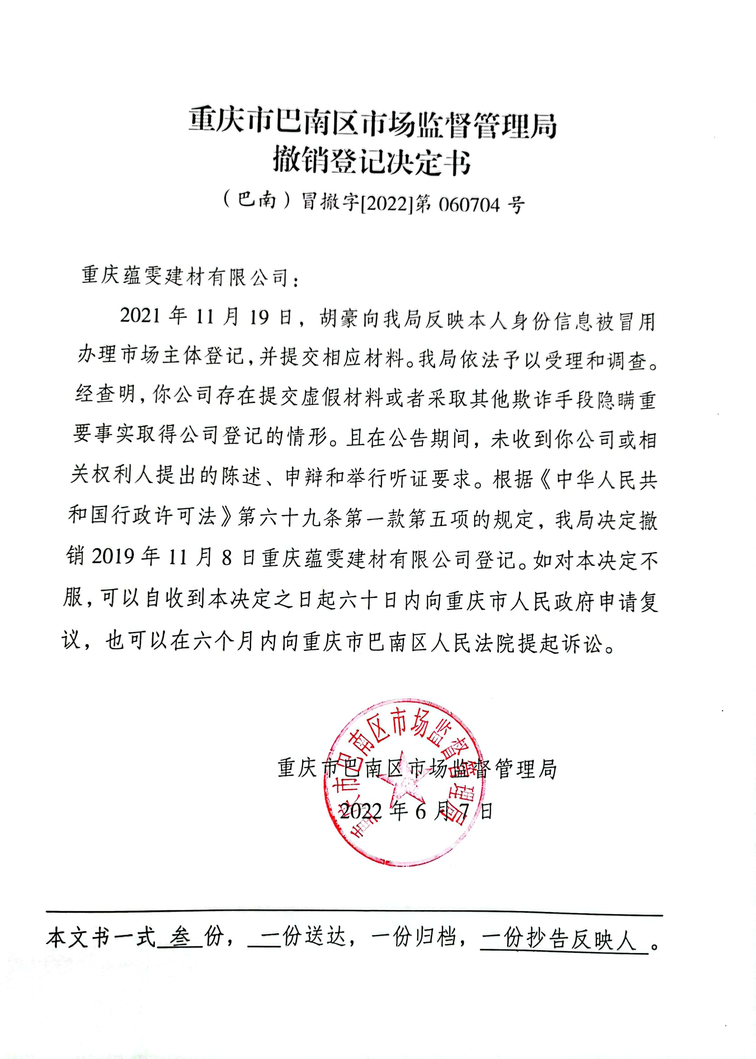 重庆市巴南区市场监督管理局关于重庆蕴雯建材有限公司撤销登记决定书及公告
