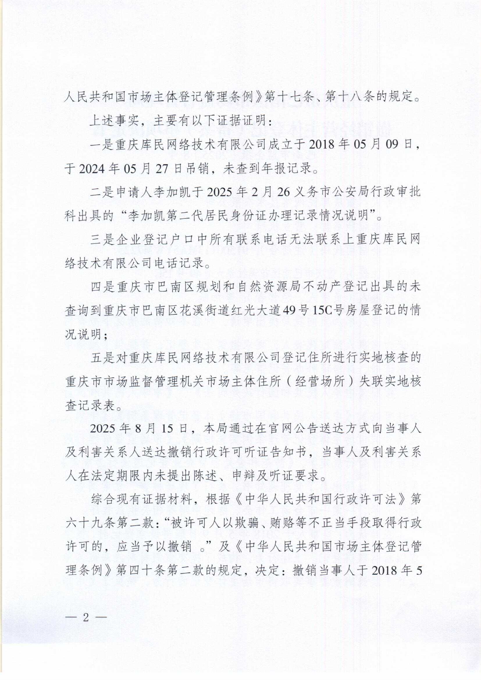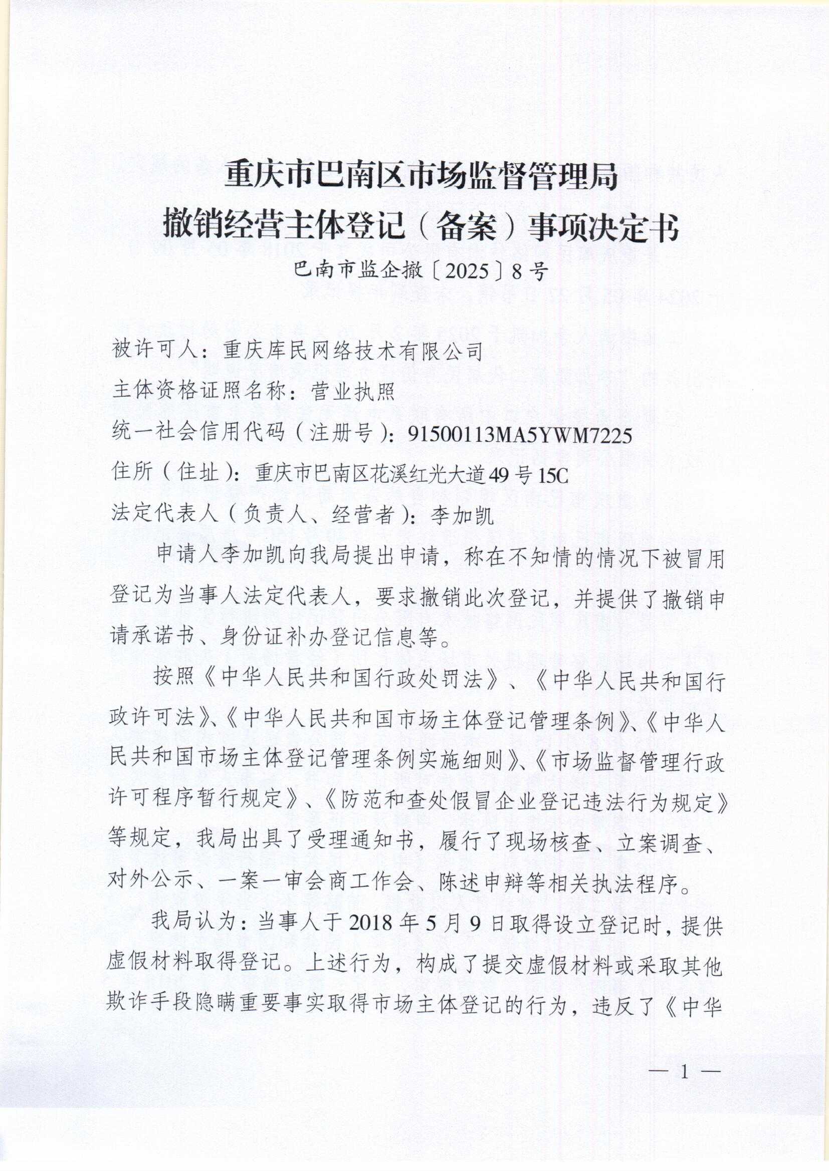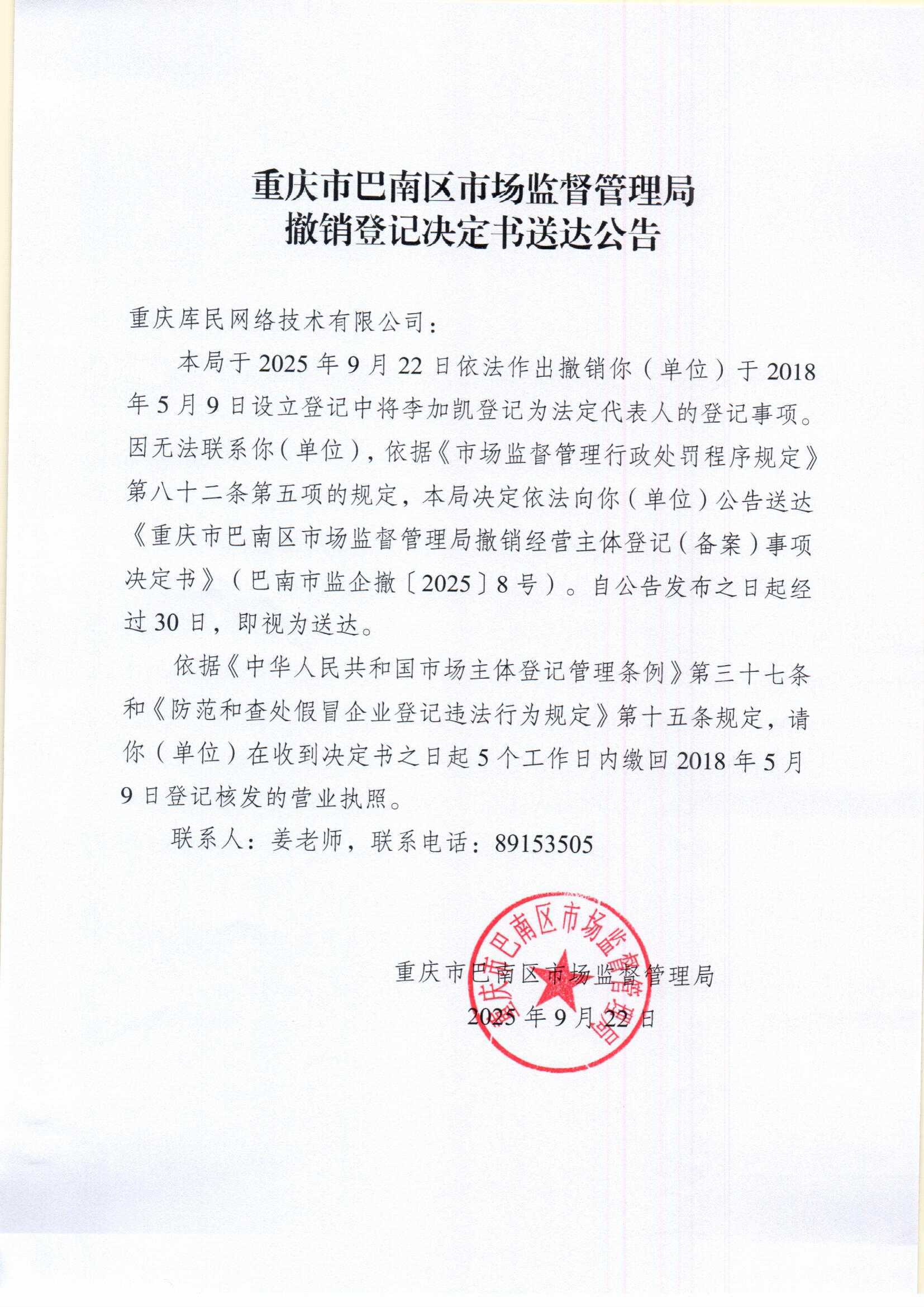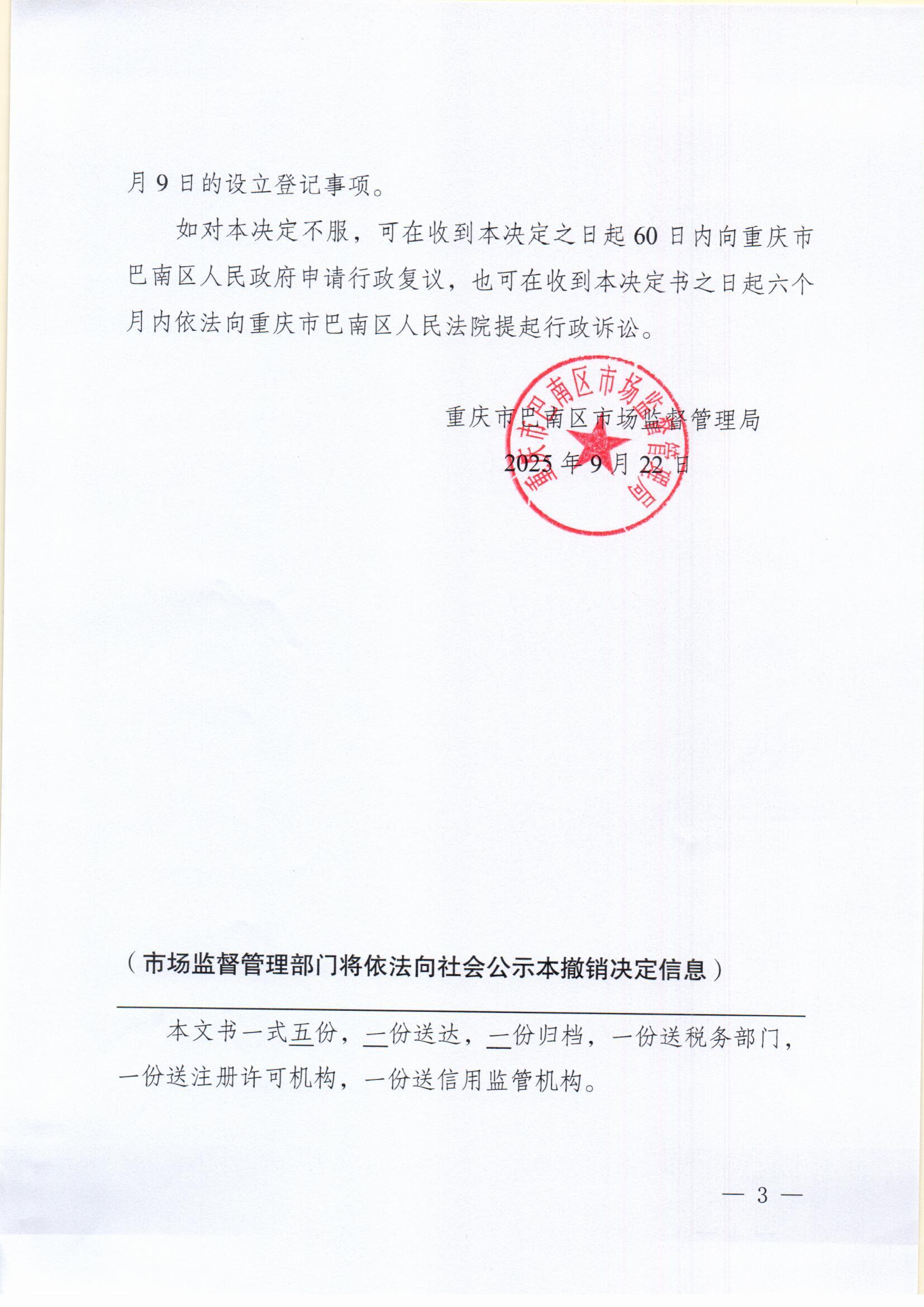 重庆市巴南区市场监督管理局撤销经营主体登记(备案)事项决定书(巴南市监企撤〔2025〕8号)及送达公告