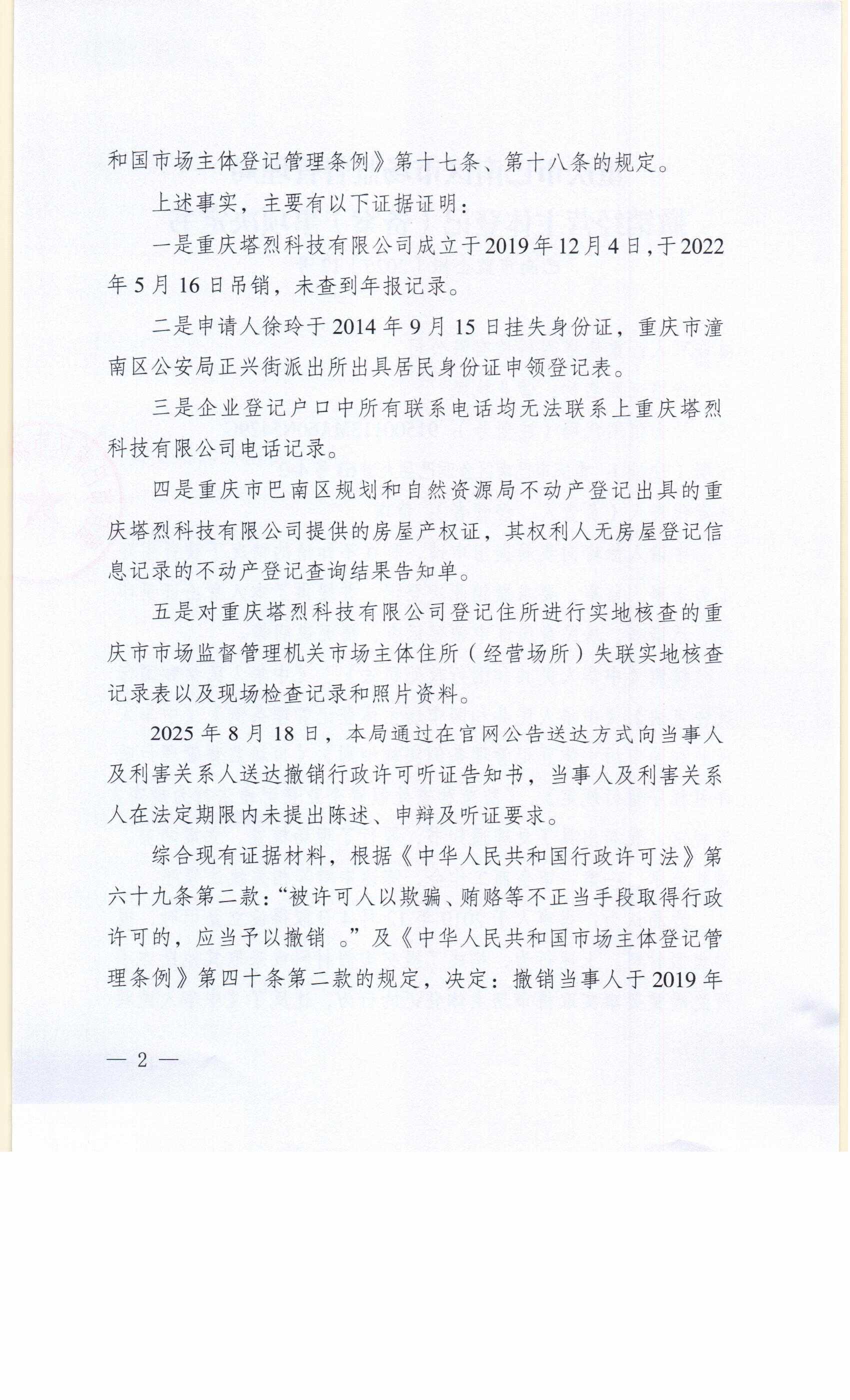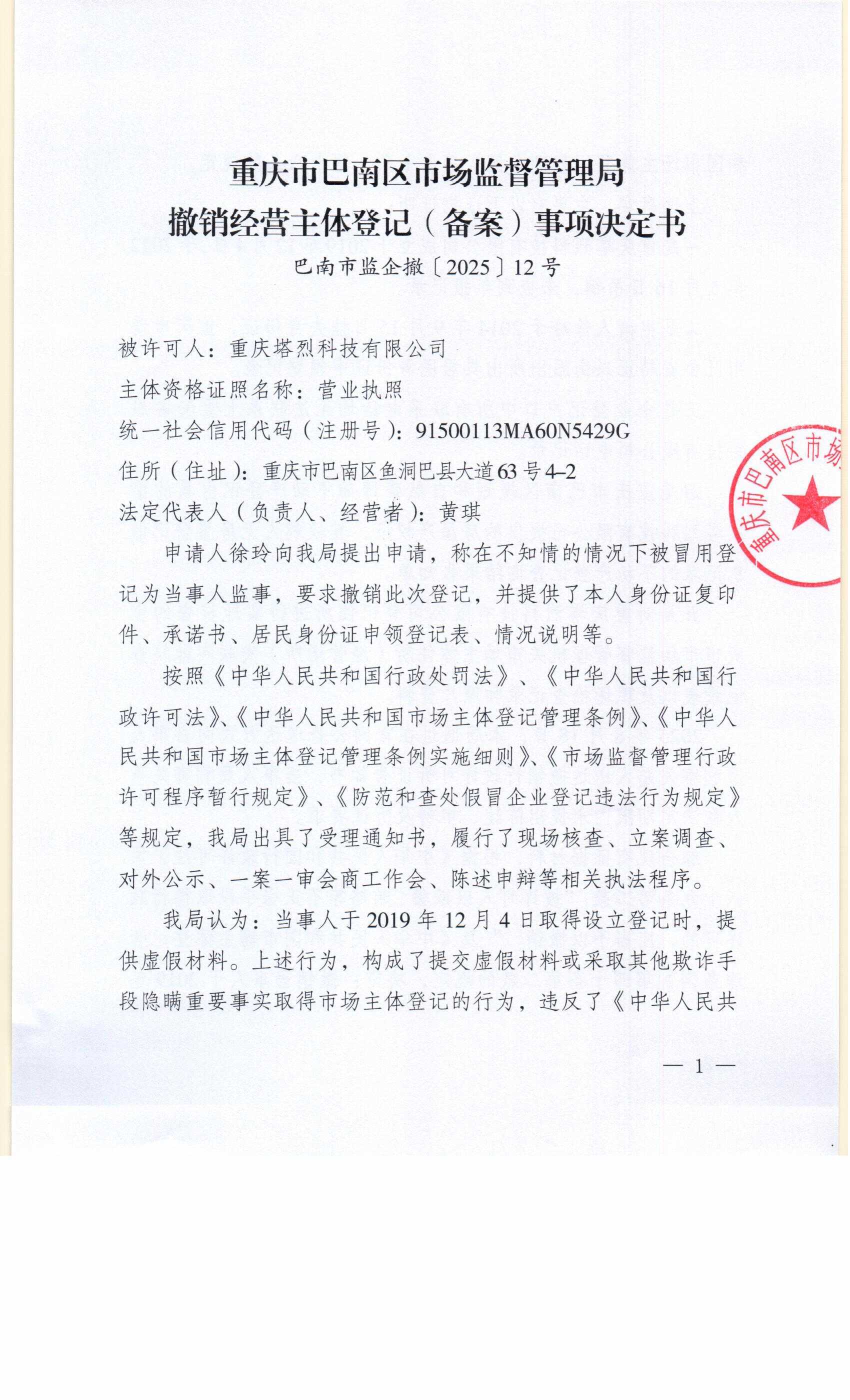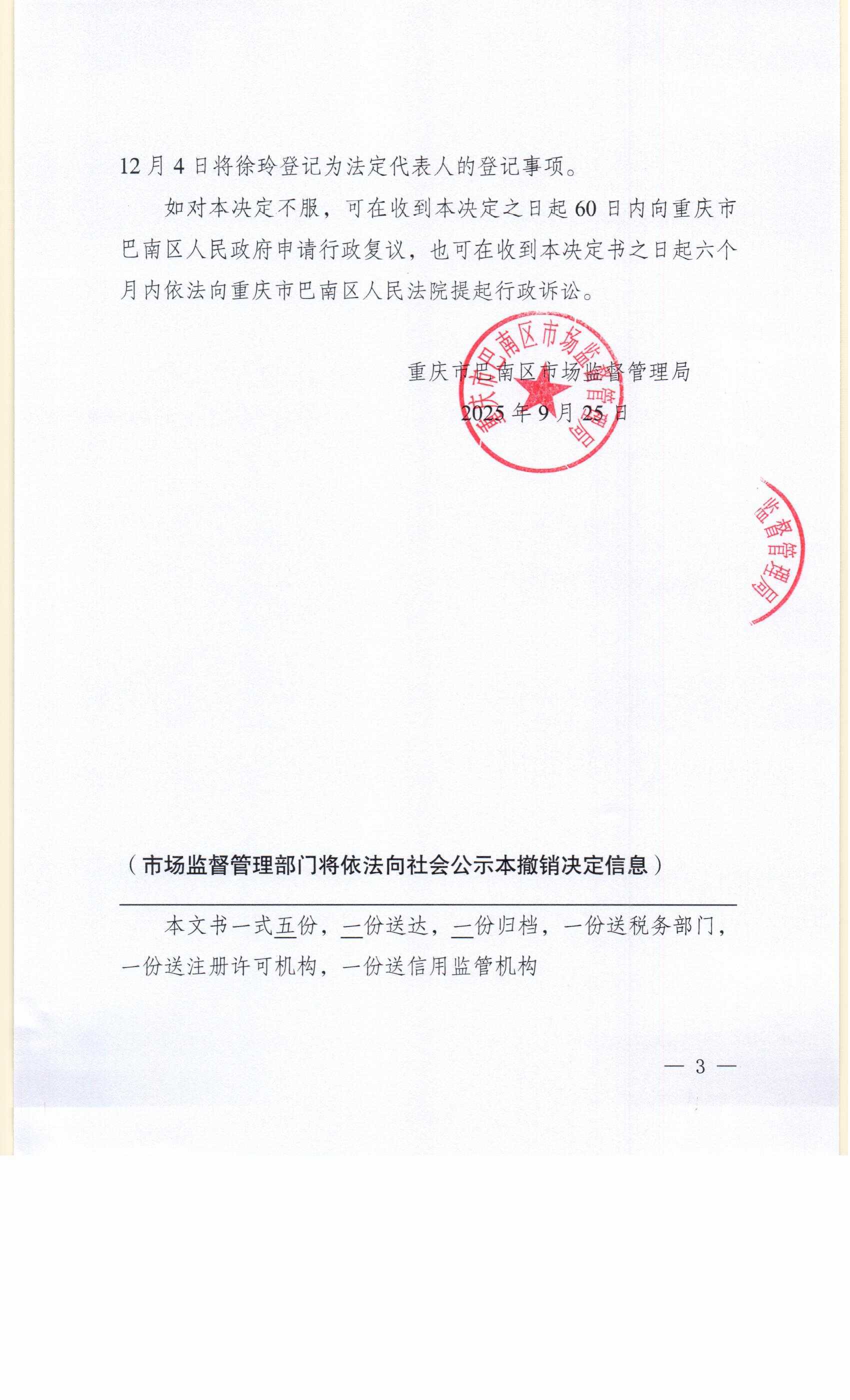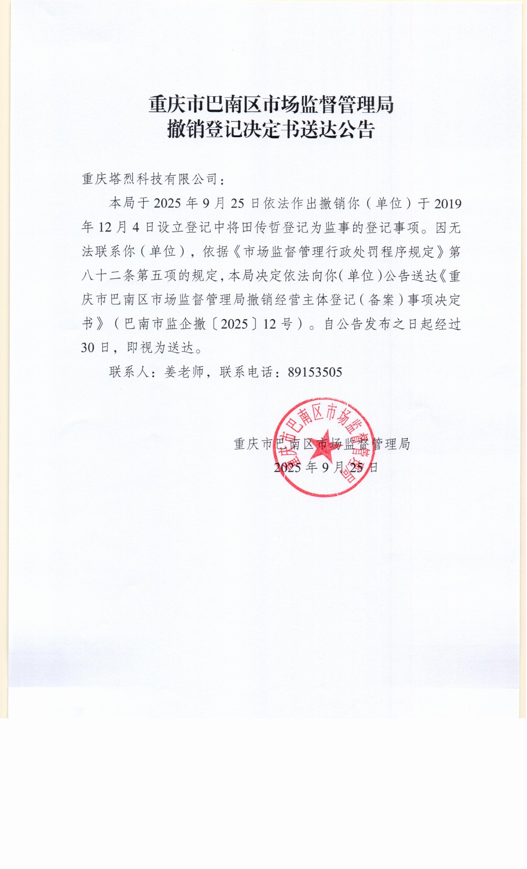 重庆市巴南区市场监督管理局撤销经营主体登记(备案)事项决定书(巴南市监企撤〔2025〕12号)及送达公告