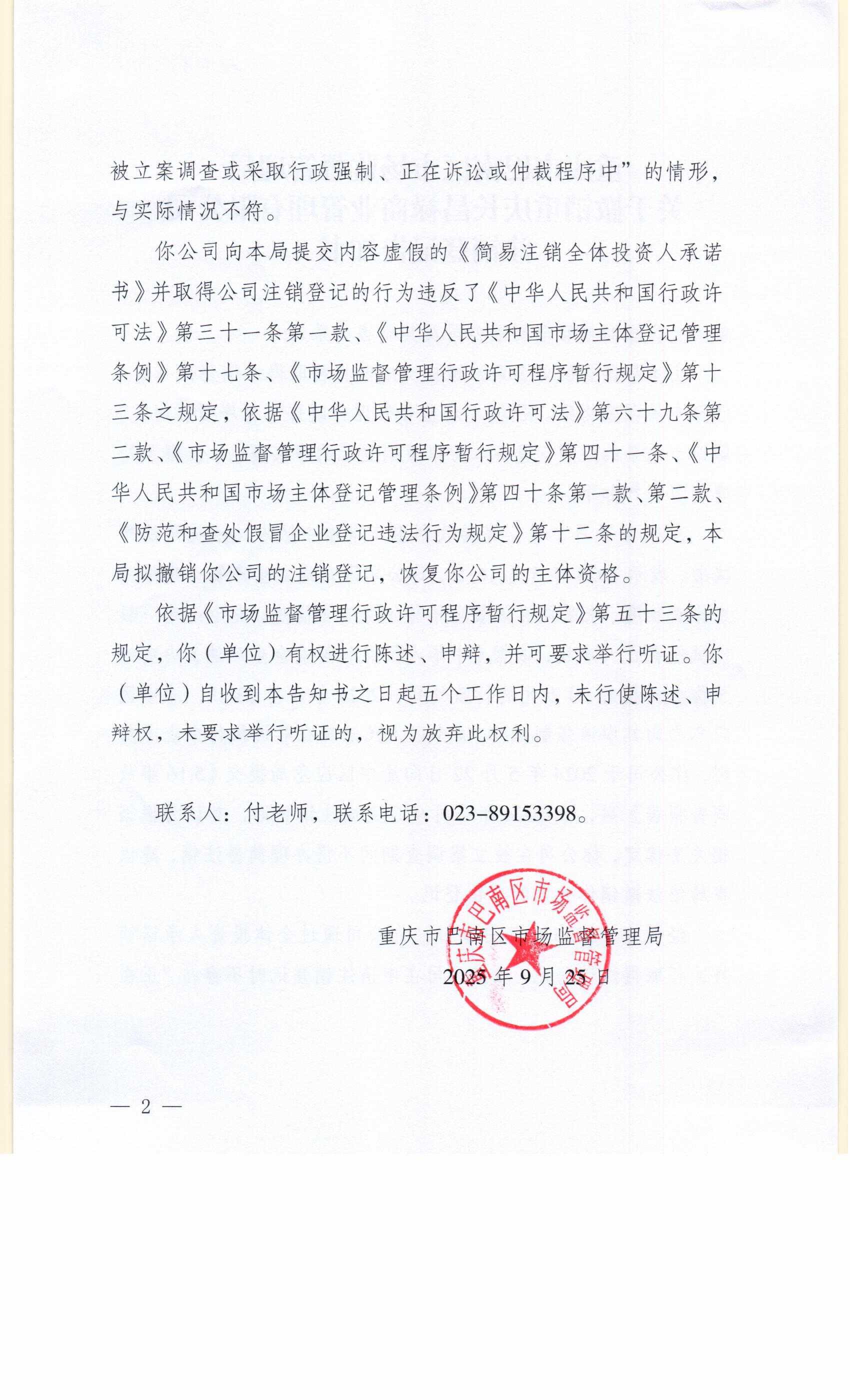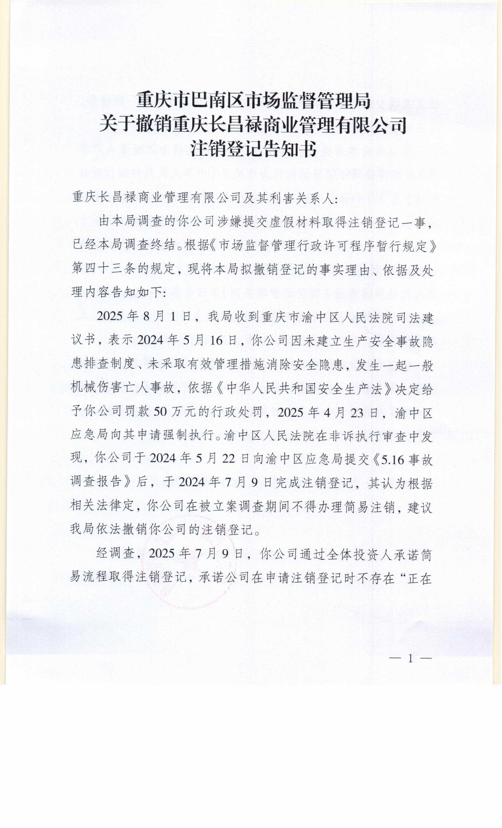 关于撤销重庆长昌禄商业管理有限公司注销登记告知书