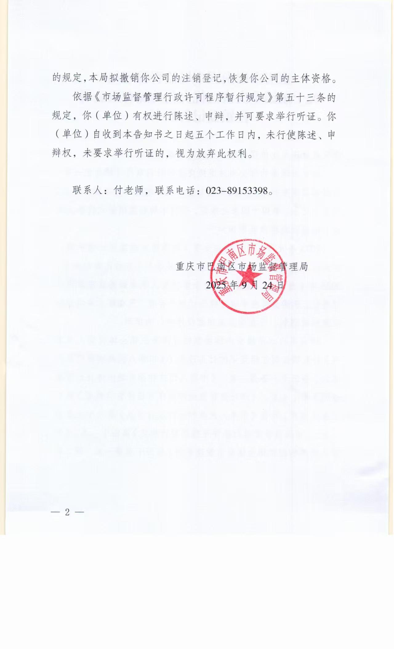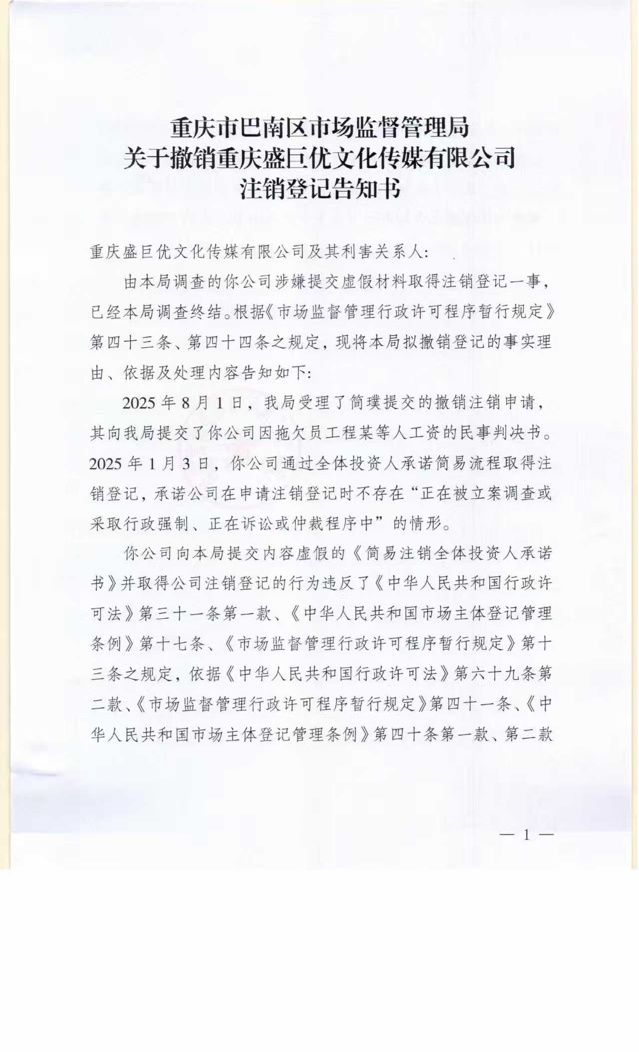 重庆市巴南区市场监督管理局关于撤销盛巨优文化传媒有限公司注销登记告知书