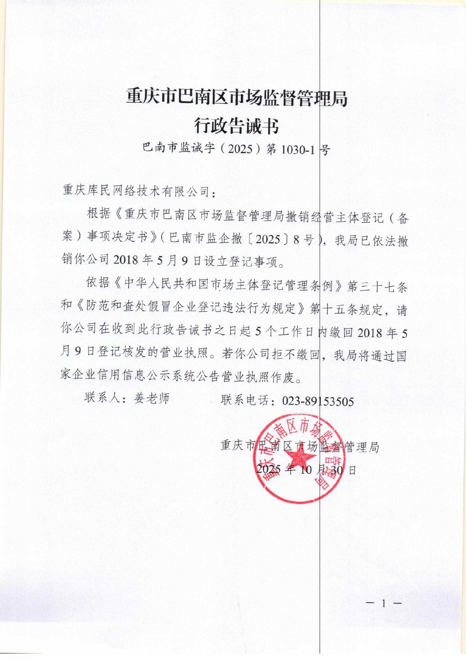 重庆市巴南区市场监督管理局行政告诫书 (巴南市监诫字〔2025〕第1030-1号)