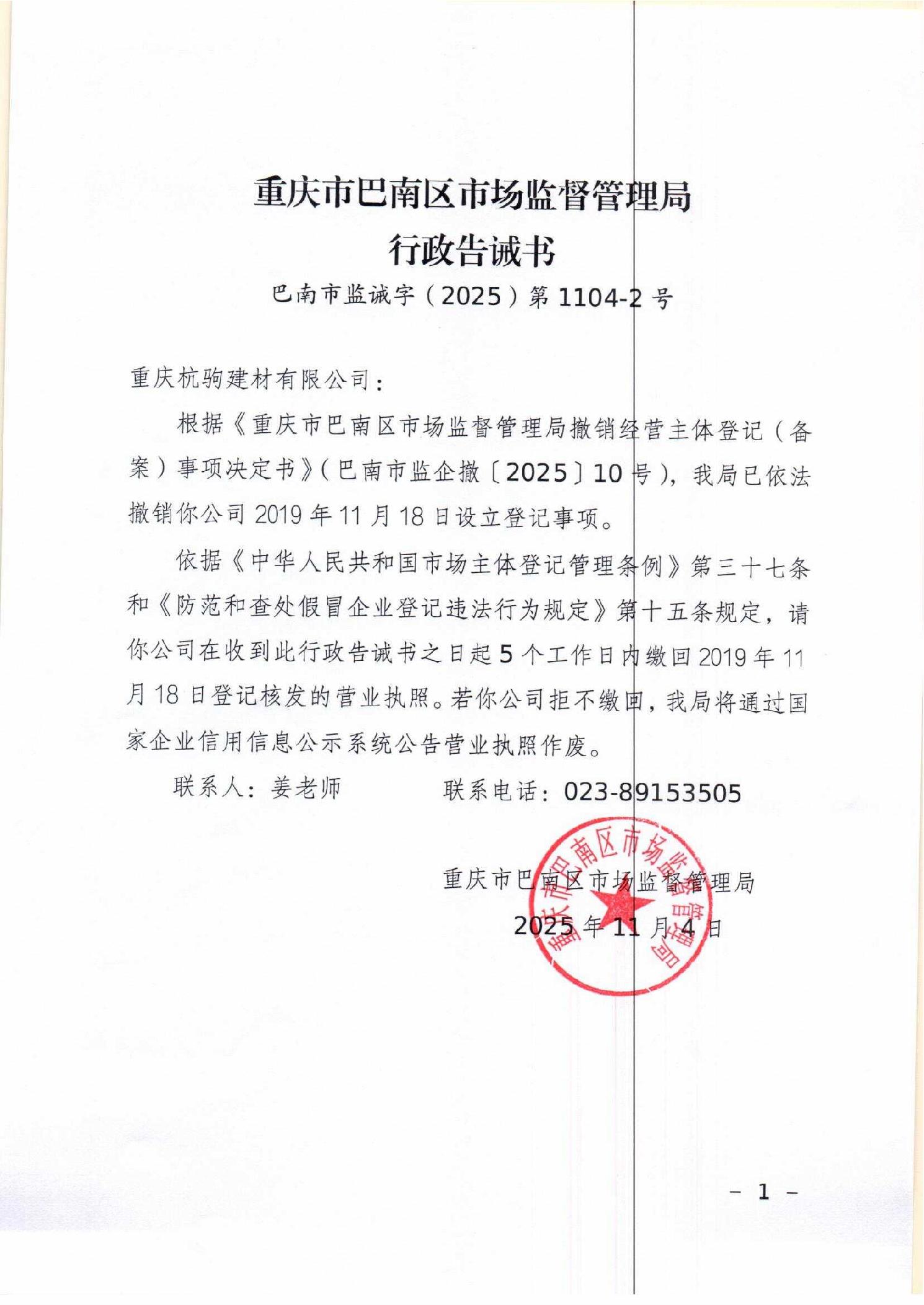 重庆市巴南区市场监督管理局行政告诫书 (巴南市监诫字〔2025〕第1104-2号)