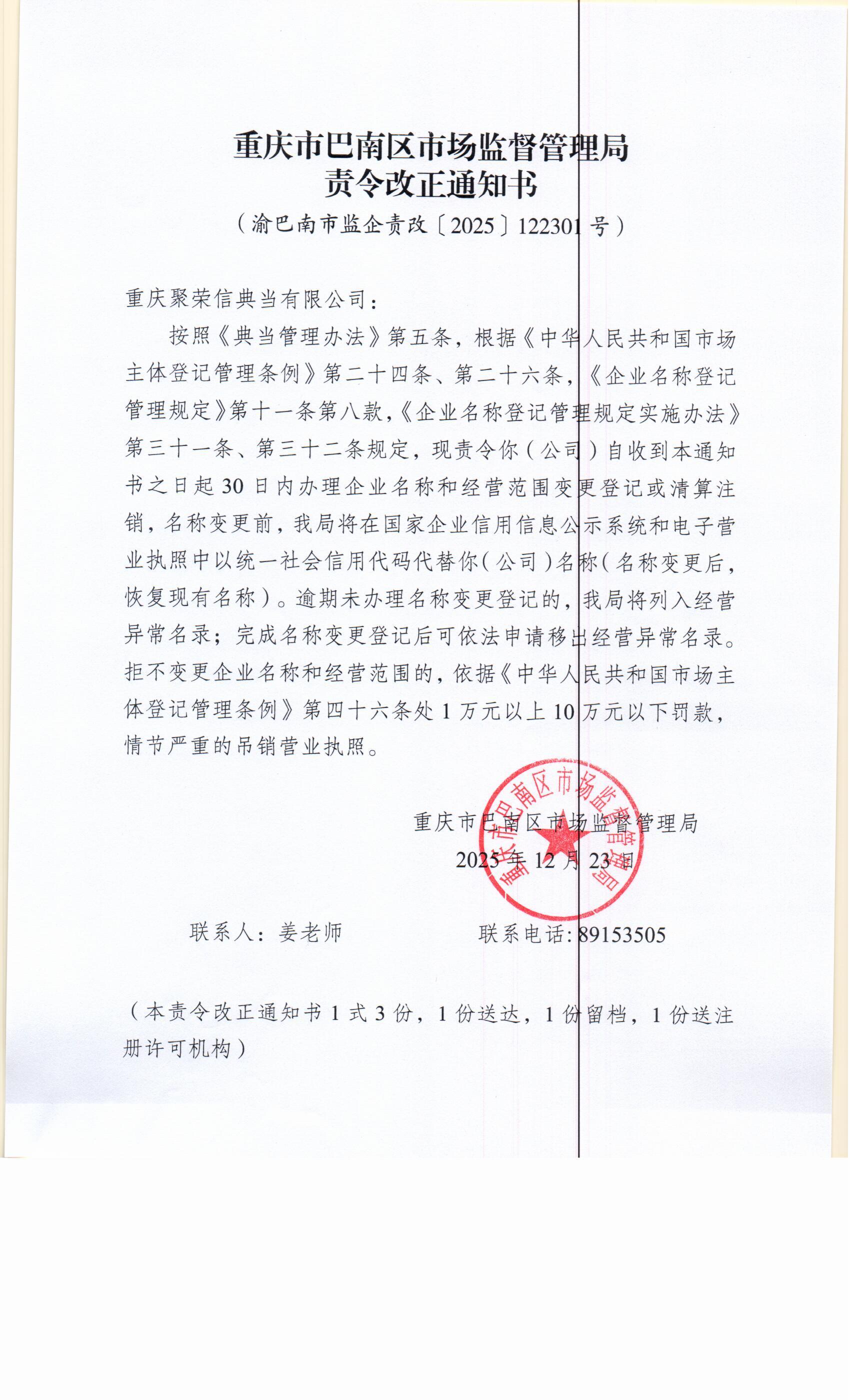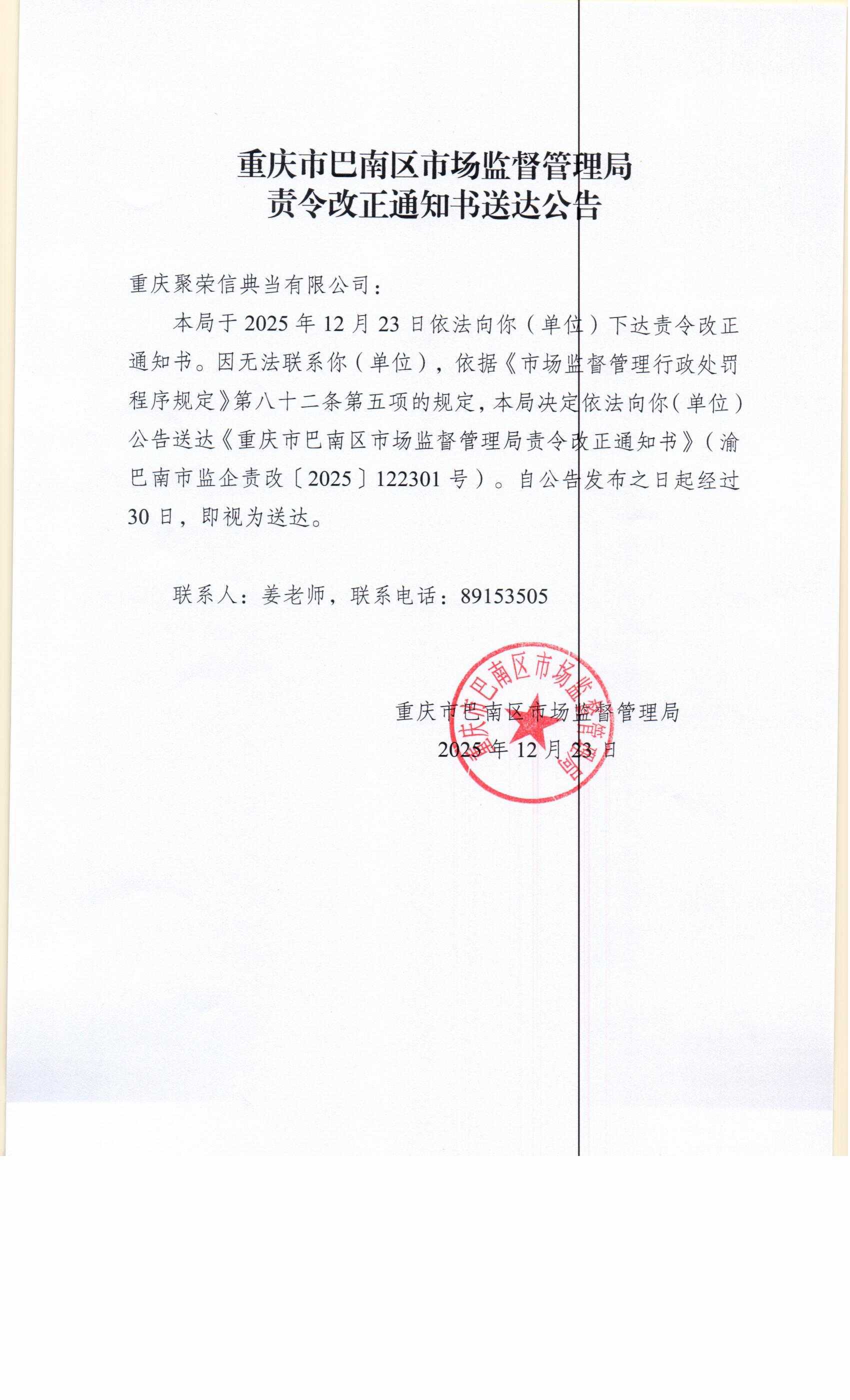 责令改正通知书(渝巴南市监企责改[2025]122301号)及送达公告