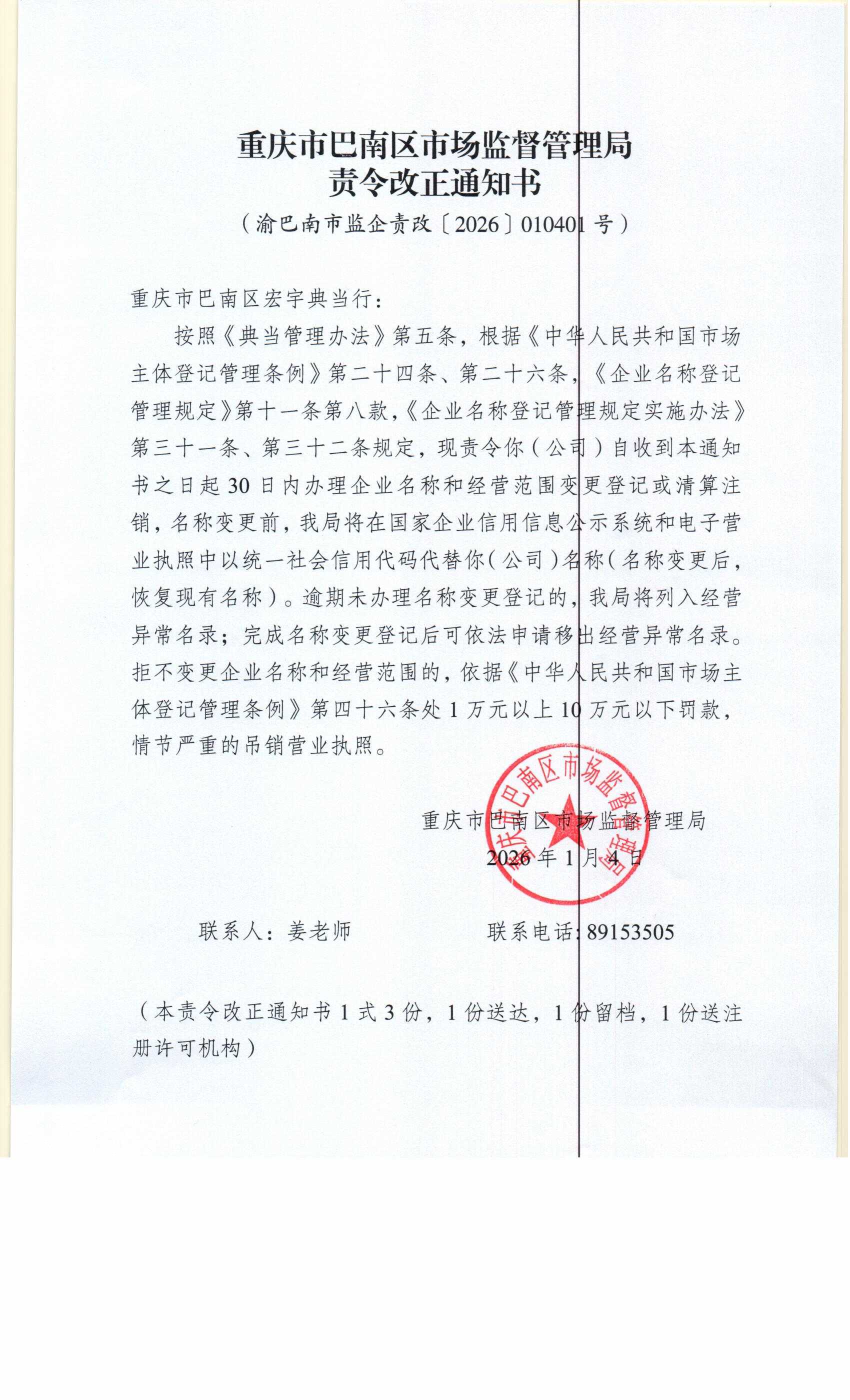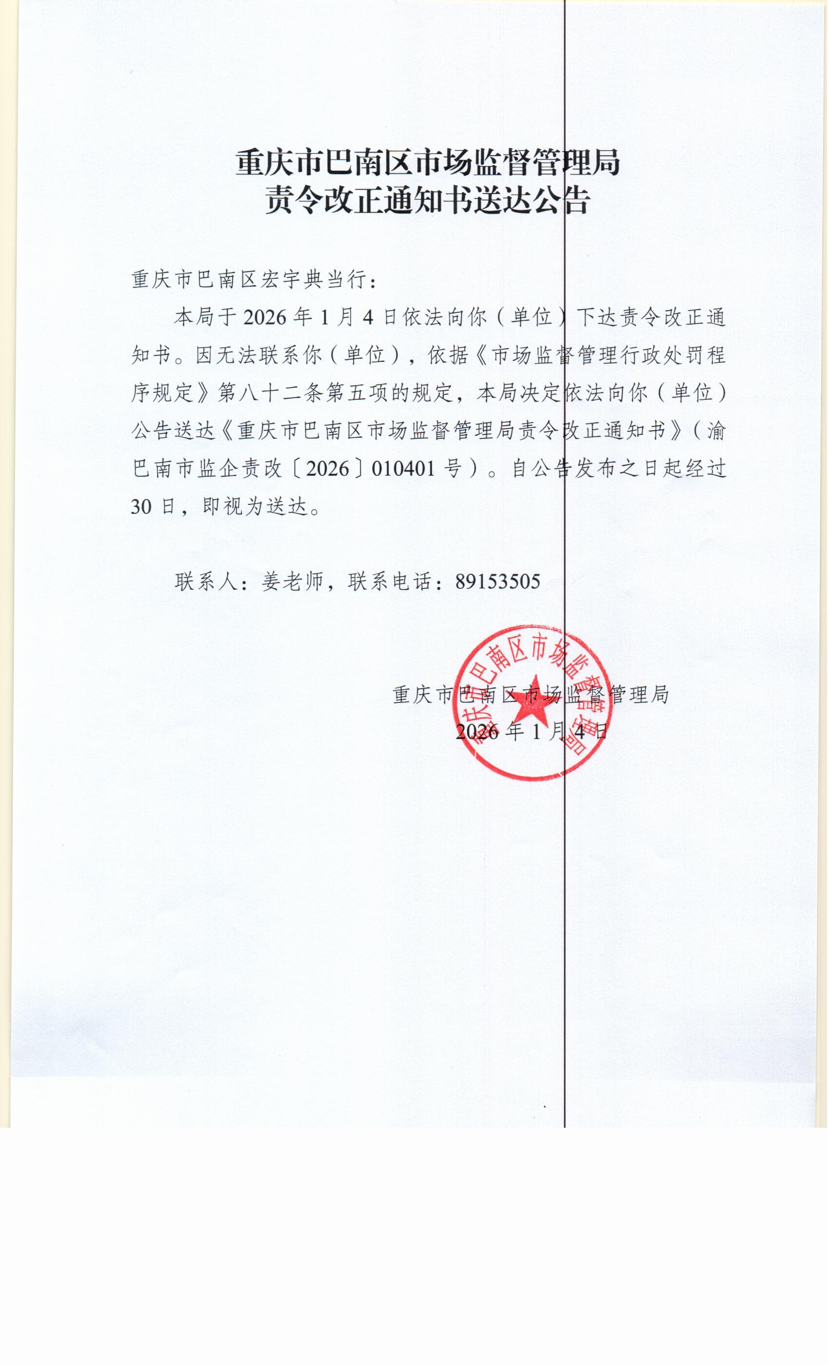 | [ 发文字号 ] | 渝巴南市监责改[2026]010401号 |