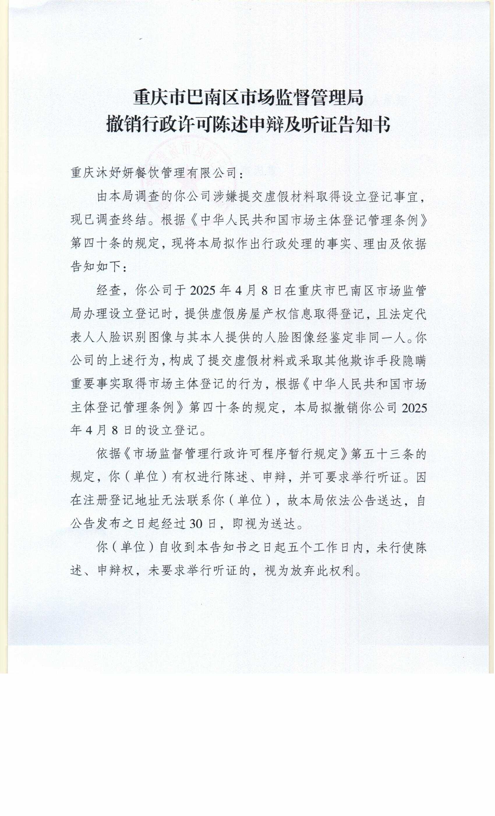 撤销行政许可陈述申辩及听证告知书(沐妤餐饮管理有限公司)