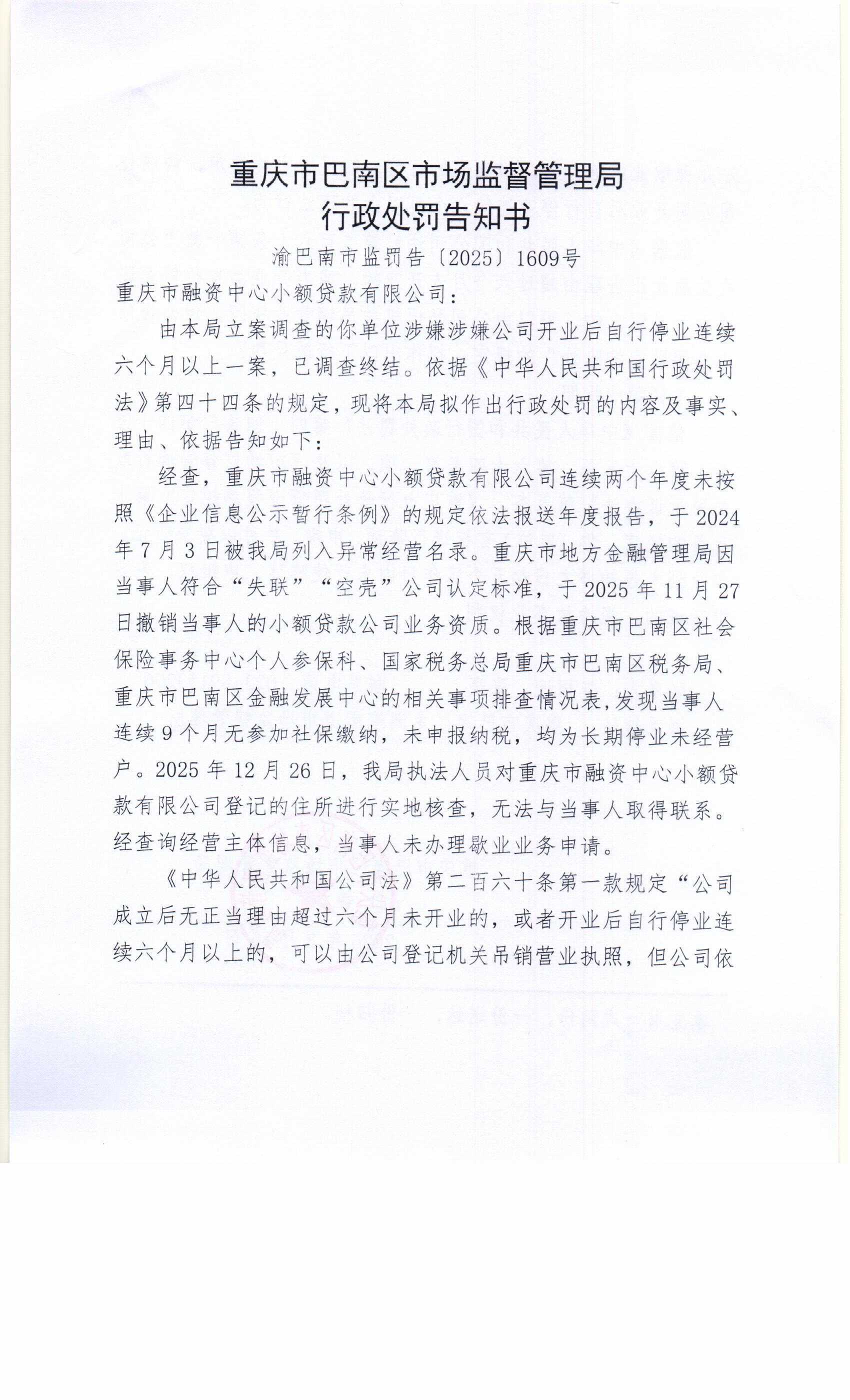 行政处罚告知书(重庆市融资中心小额贷款有限公司)