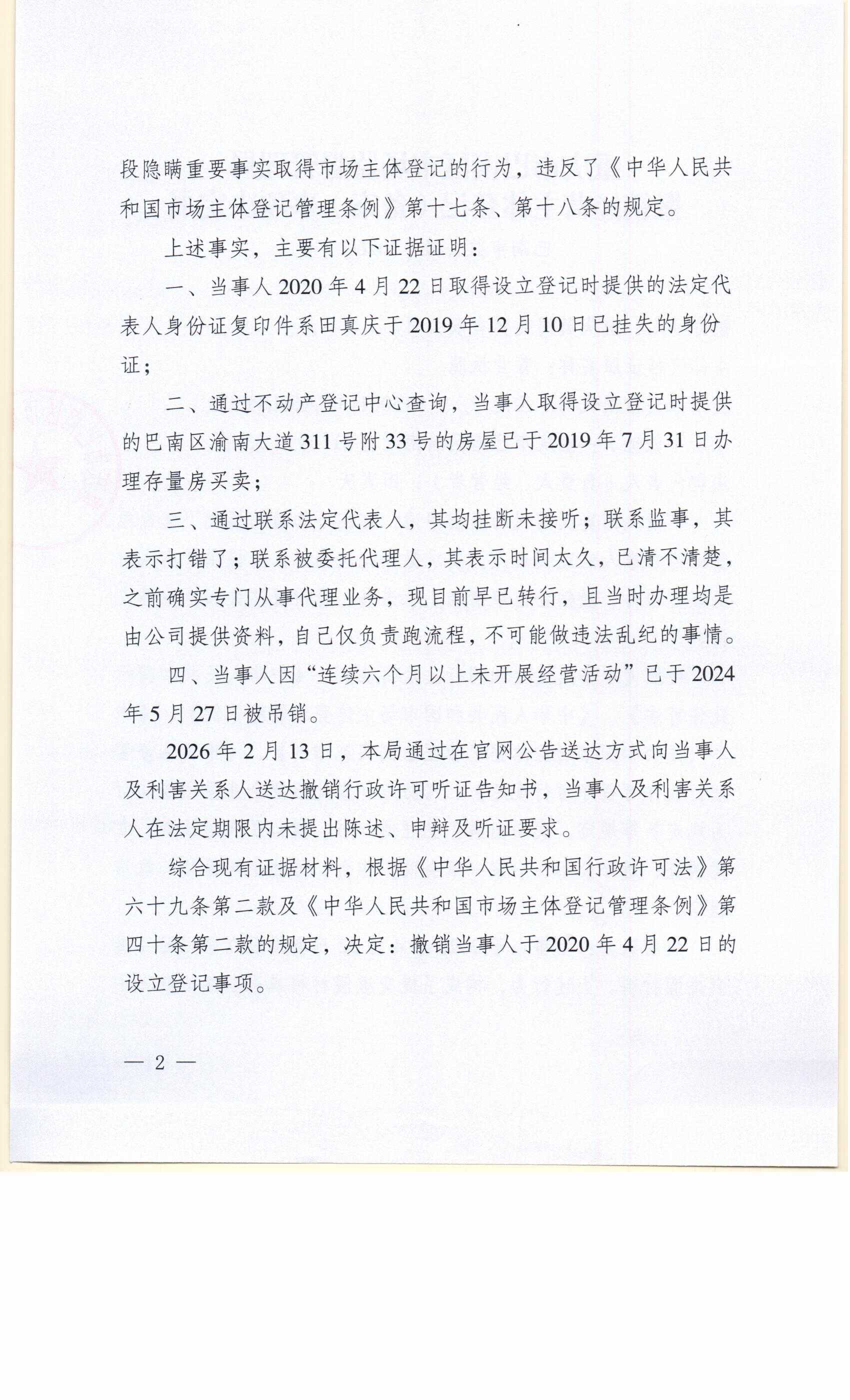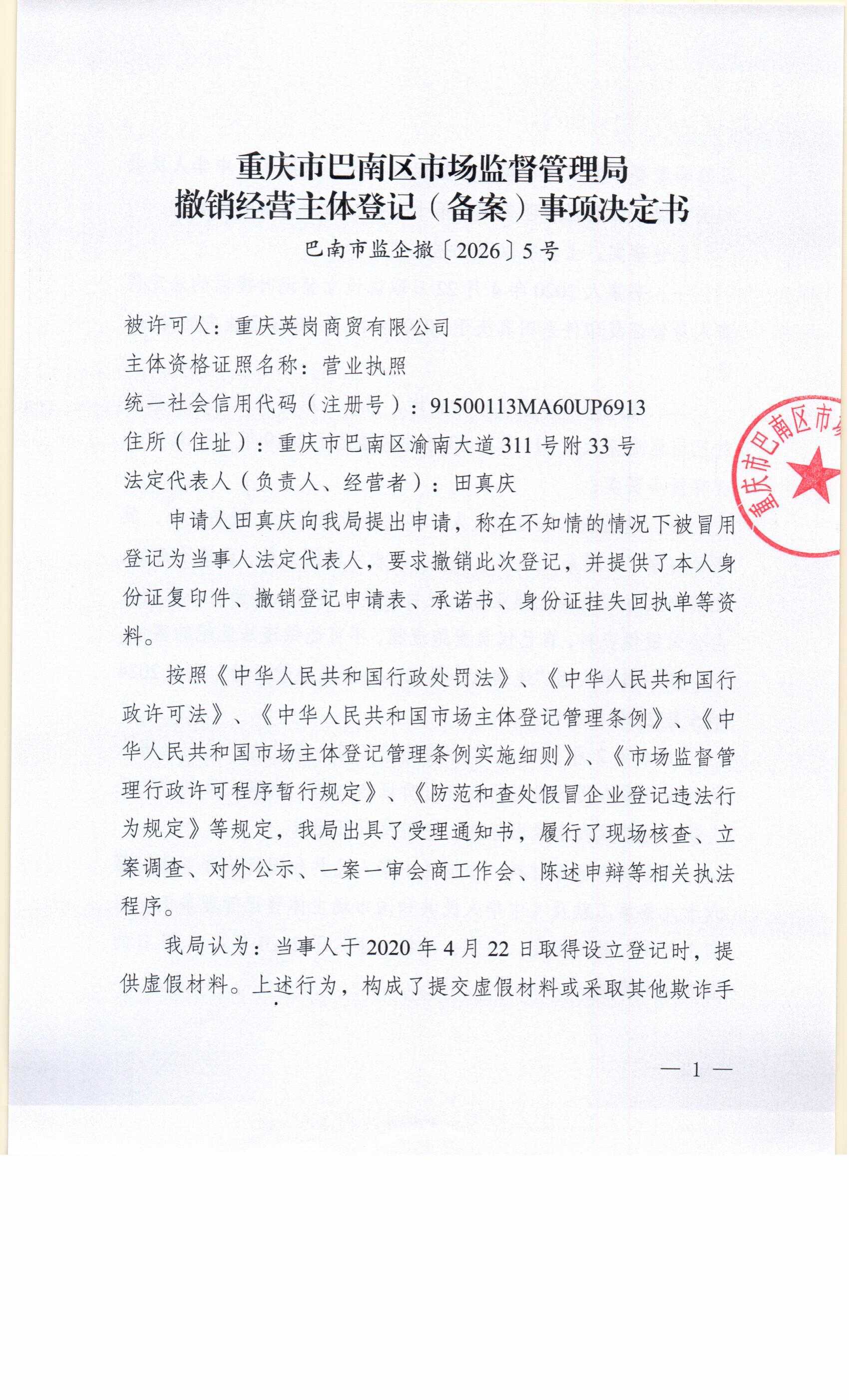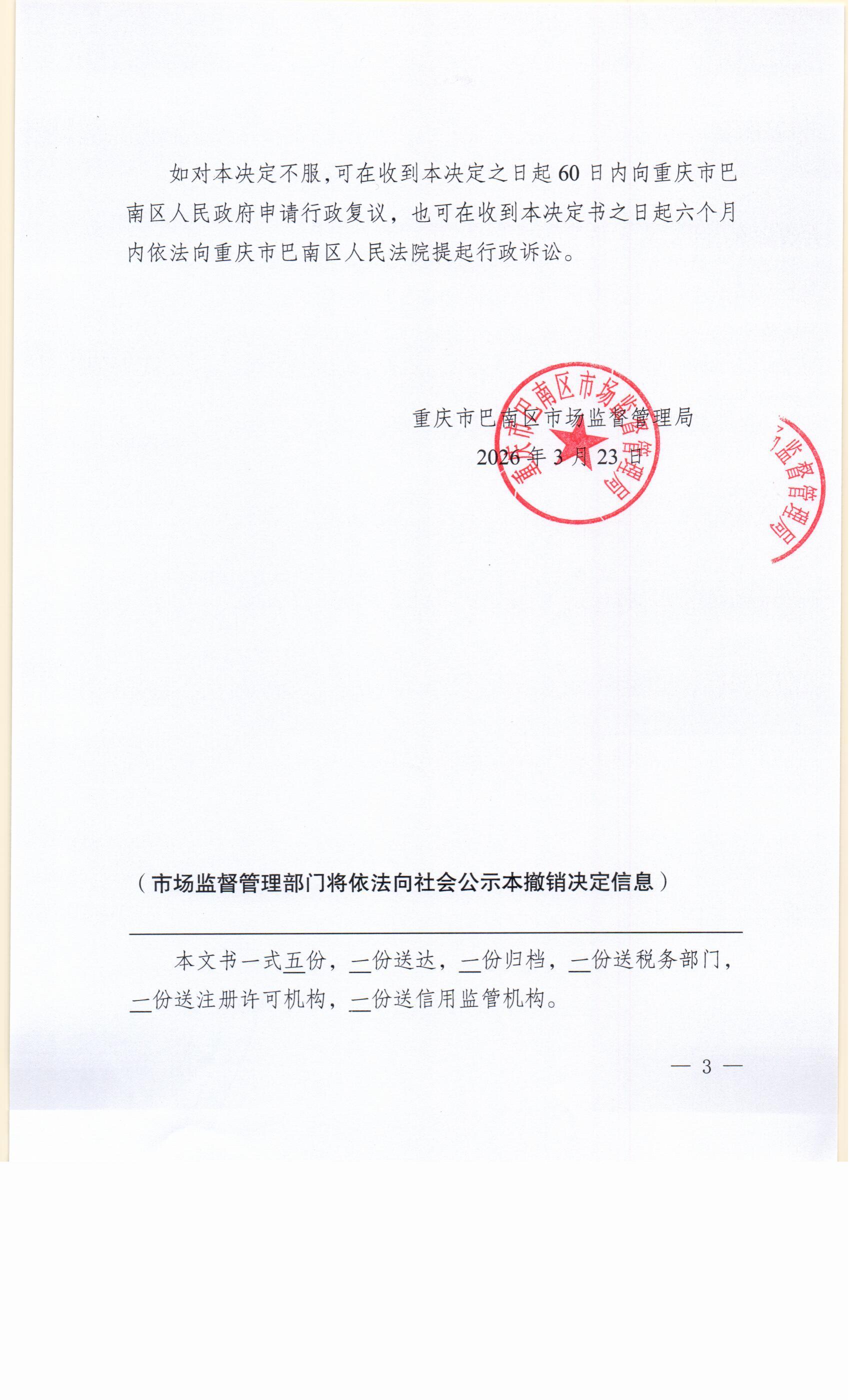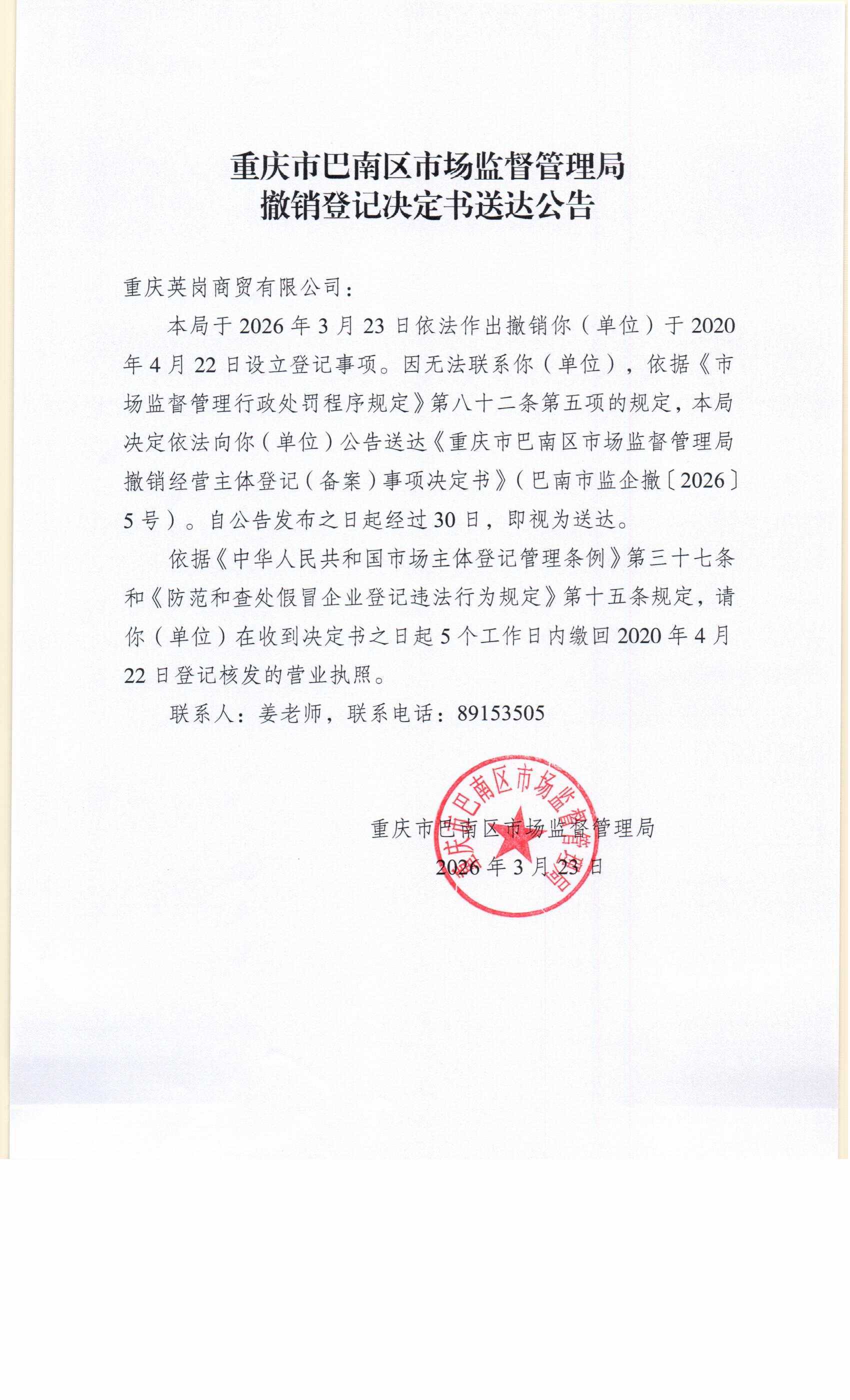 撤销登记决定书及送达公告(重庆英岗商贸有限公司)