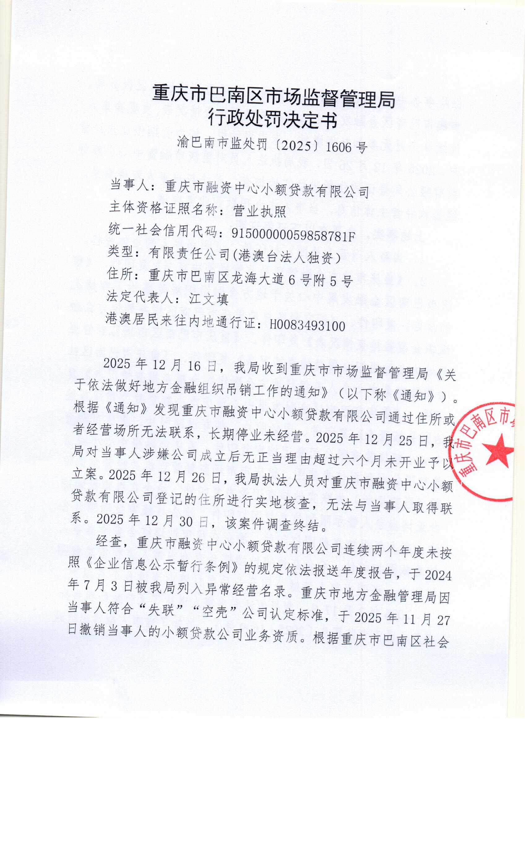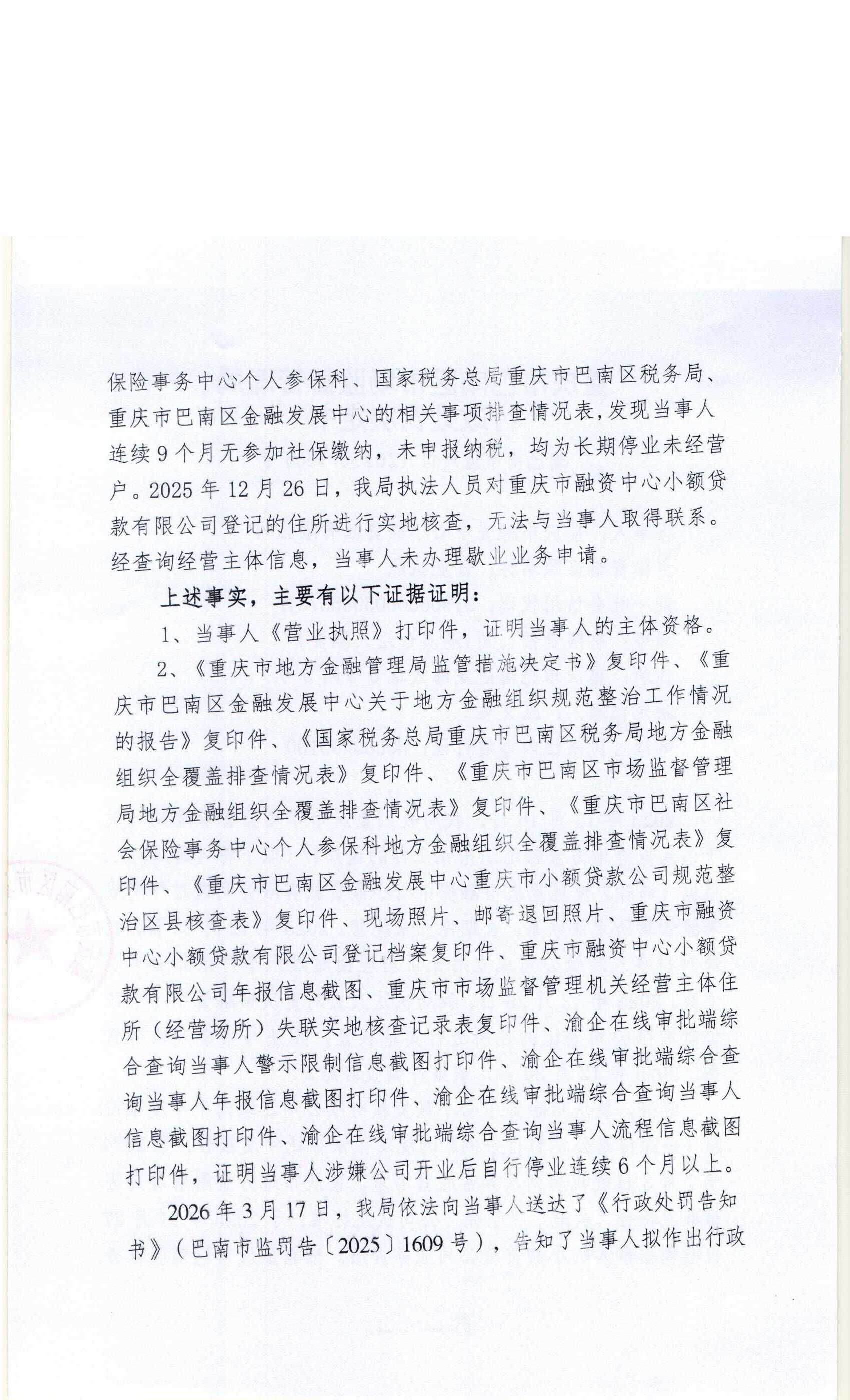 行政处罚决定书(重庆市融资中心小额贷款有限公司)