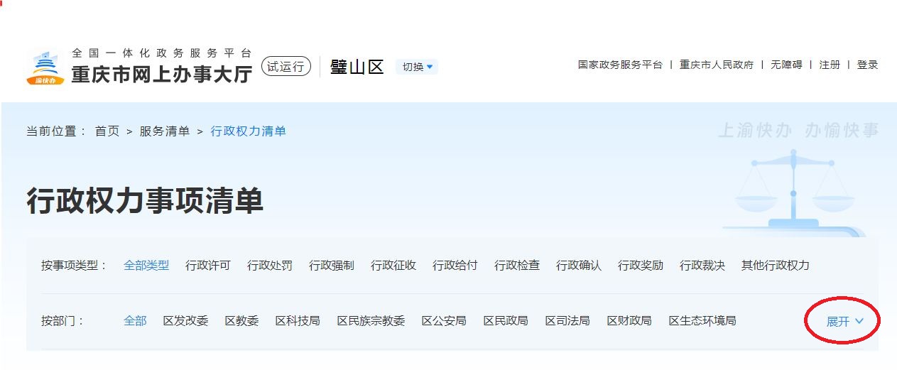 1.点击网址:https://zwykb.cq.gov.cn/qxzz/bsq/fwqd/xzqlqd/。在“部门”处点击“展开”。如图一所示。