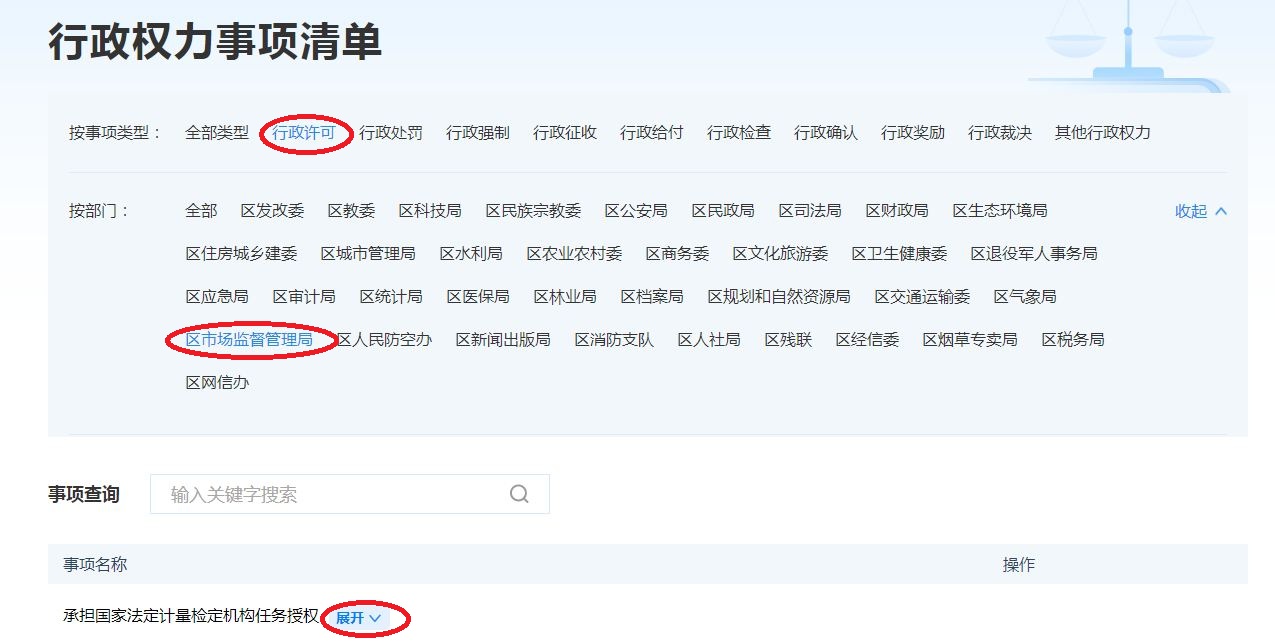 2.“按部门”选择“区市场监管局”,“事项类型”选择“行政许可”,在清单列表的具体服务事项右侧点击“展开”。如图二所示。
