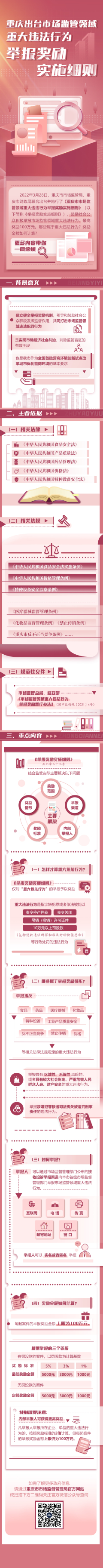 为鼓励社会公众积极举报市场监管领域重大违法行为,推动社会共治,市市场监管局、市财政局共同研究制定了《重庆市市场监管领域重大违法行为举报奖励实施细则》,现印发给你们,请遵照执行。