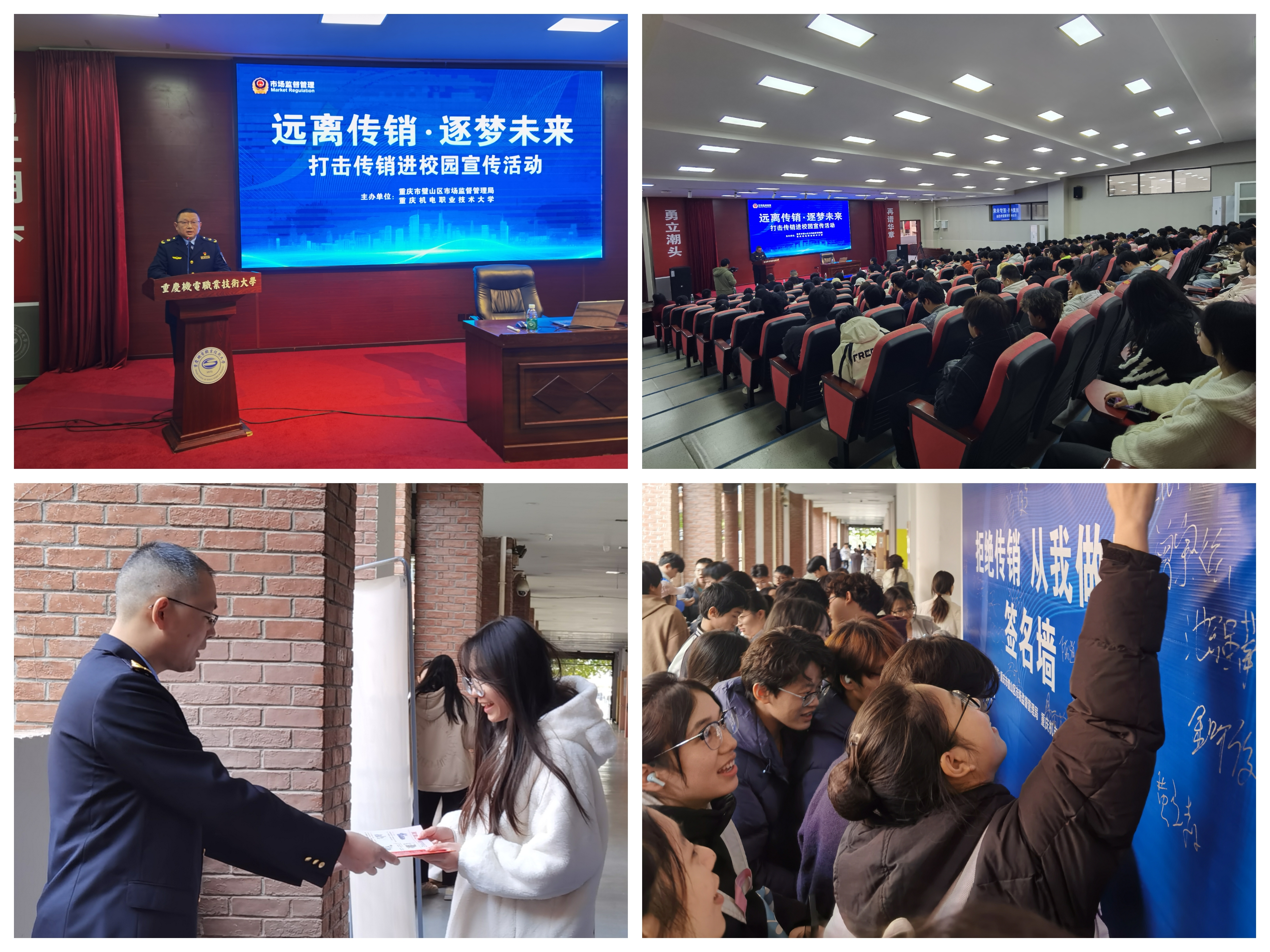 为进一步增强高校师生对传销的识别能力与防范意识,筑牢校园反传销安全防线。11月19日下午,璧山区市场监管局组织开展“远离传销,逐梦未来”打击传销进校园宣传活动,走进重庆机电职业技术大学,200余名师生代表现场参与。