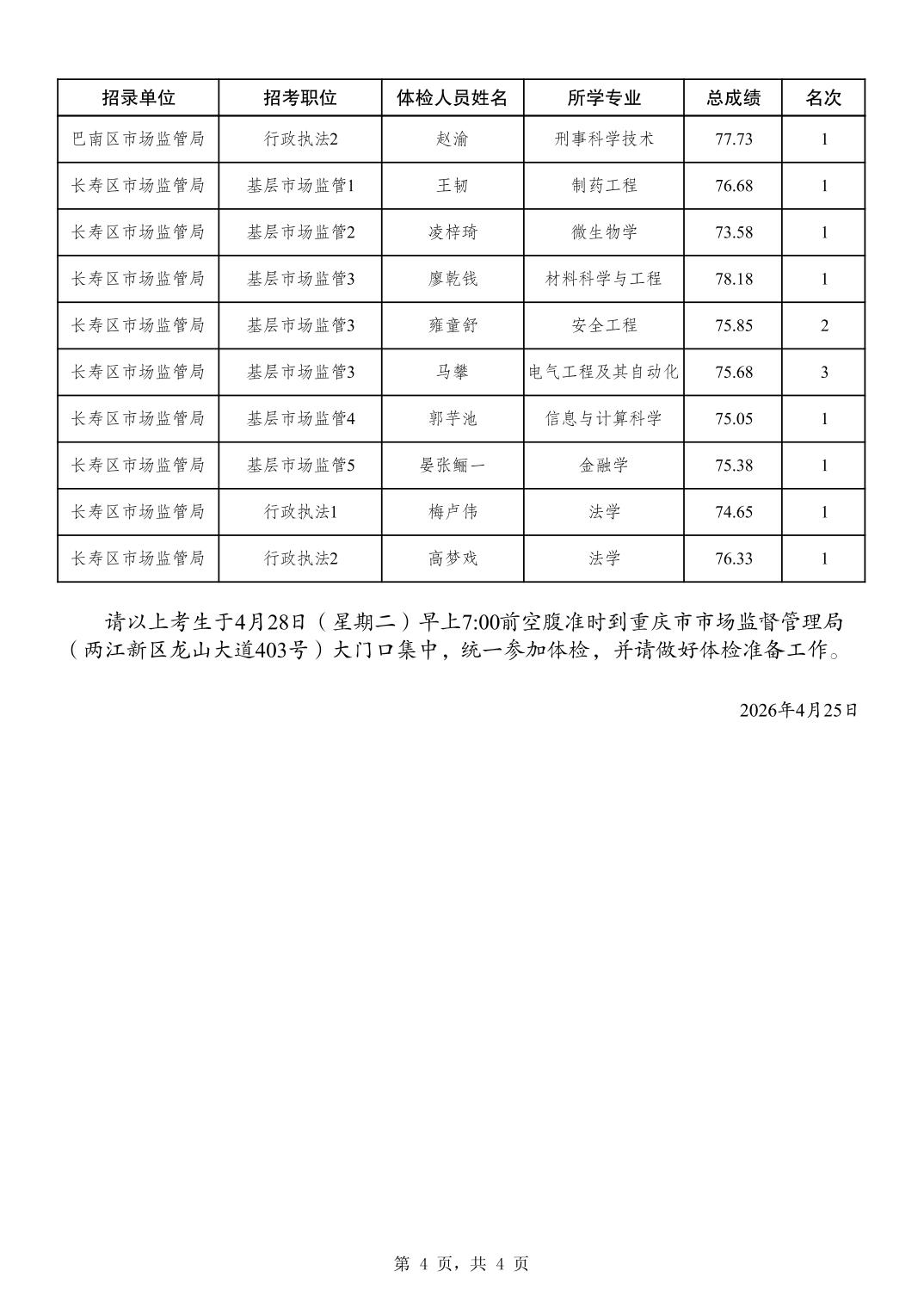 重庆市市场监督管理局2026年考试录用公务员成绩及参加体检人员公布(4月25日面试)