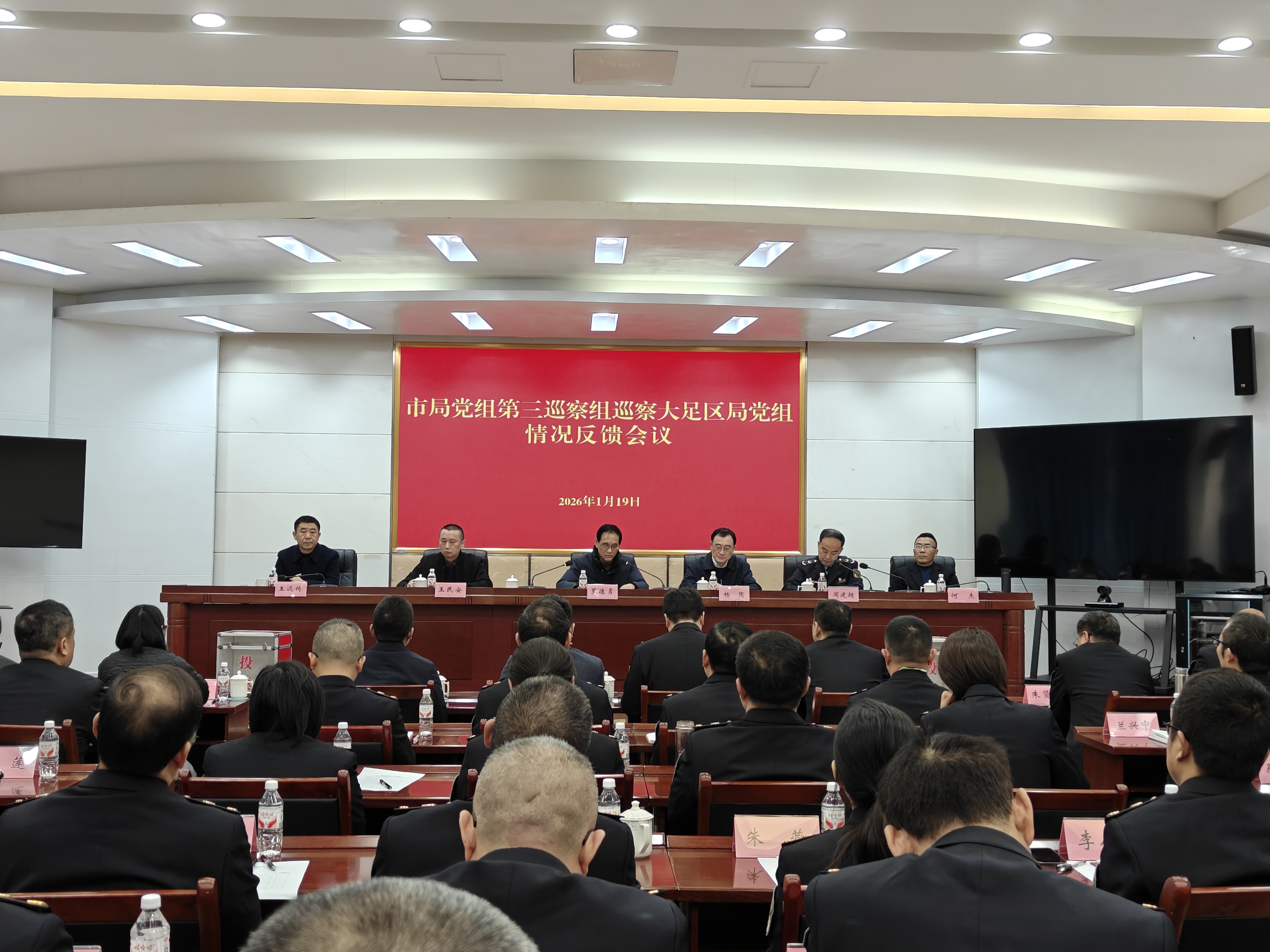 市局党组第三巡察组副组长及联络员,驻市局纪检监察组,市局人事处、巡察办、机关党办有关同志,大足区局领导班子成员出席会议;大足区局改非领导干部、全体中层干部列席会议。