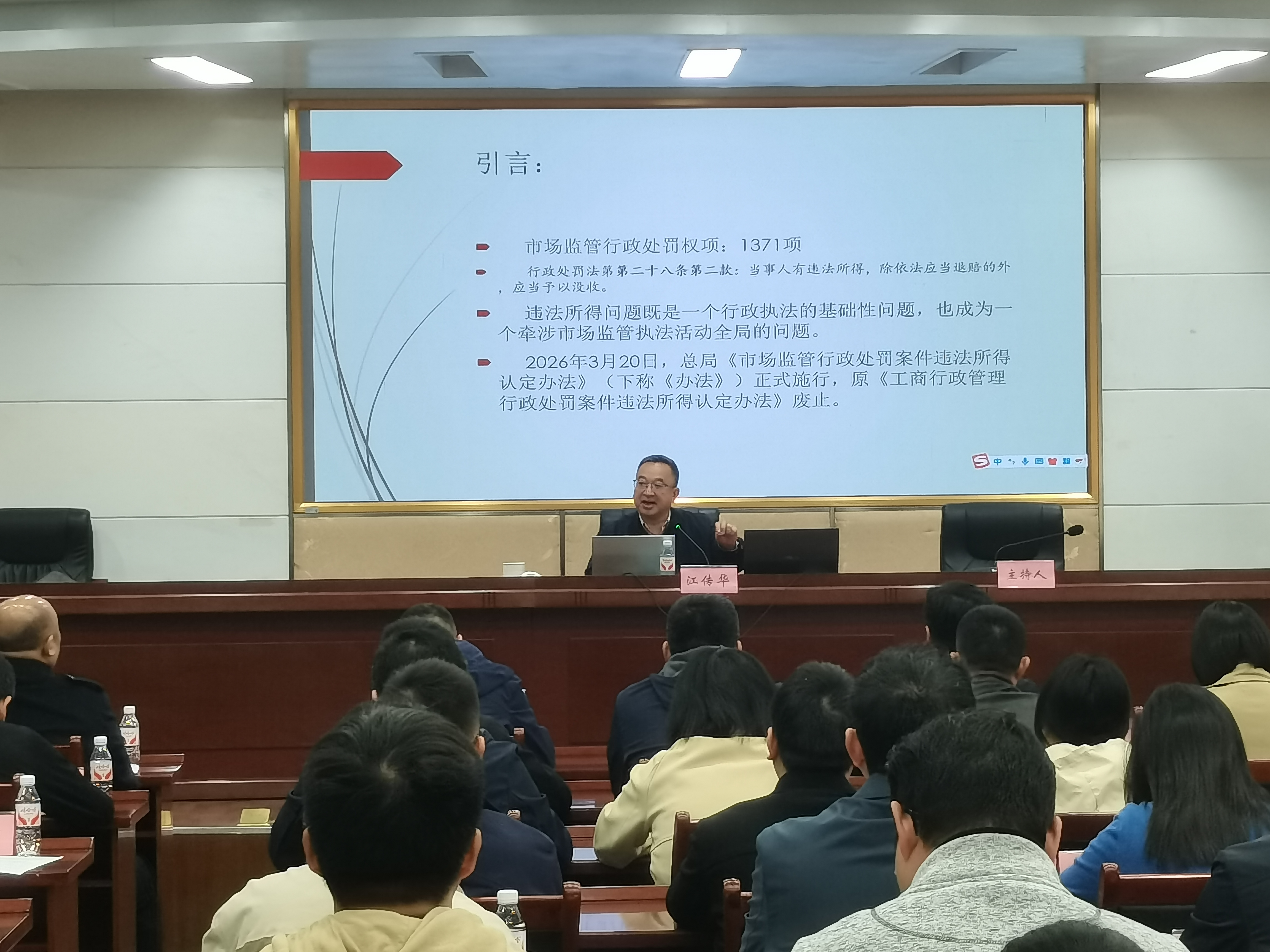 本次培训特邀市市场监管局二级巡视员江传华作专题授课。江传华巡视员长期从事市场监管法制工作,理论功底深厚、实务经验丰富。他从《办法》的制定背景与过程入手,深入剖析了立法过程中的主要争议点,系统阐述了制度设计确立的基本原则,重点围绕“扣除说”的法理基础、成本扣除的操作难点、回转规则与举证责任倒置的适用情形,以及其他若干关键实务问题等六个方面,进行了生动详实、深入浅出的讲解。整场培训既有理论高度,又有实践深度,为执法人员全面理解、准确把握、正确运用《办法》厘清了思路、指明了方向、提供了遵循。