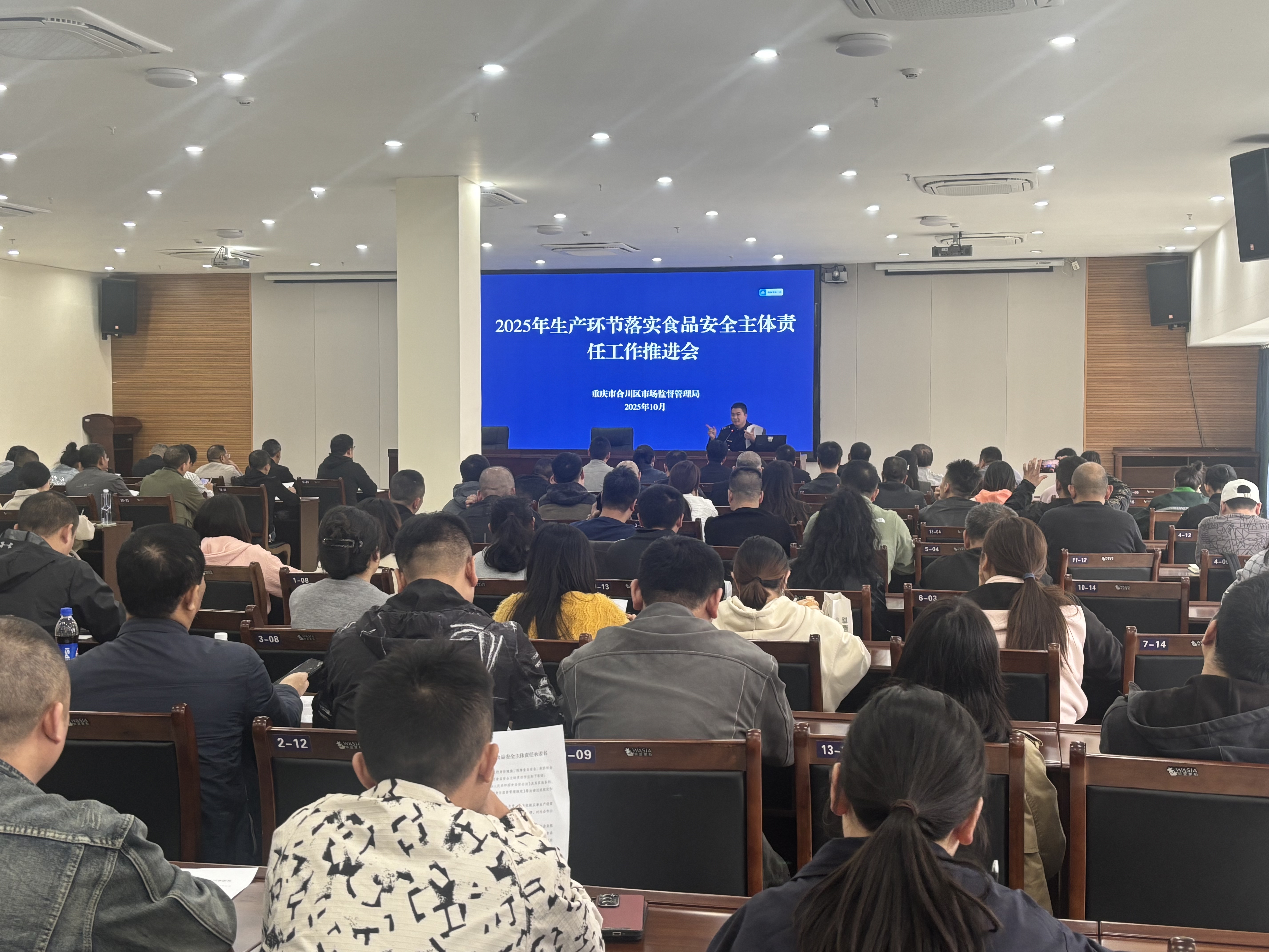 为用好数字化、信息化手段,强化食品生产环节食品安全风险防控能力,进一步保障人民群众“舌尖上的安全”,2025年10月22日,合川区市场监管局组织全区160余家食品生产企业,召开了生产环节落实食品安全主体责任工作推进会,切实部署推进食品生产安全监管数字化建设工作。与会的160余家食品生产企业代表签订了《食品生产者落实食品安全主体责任承诺书》。