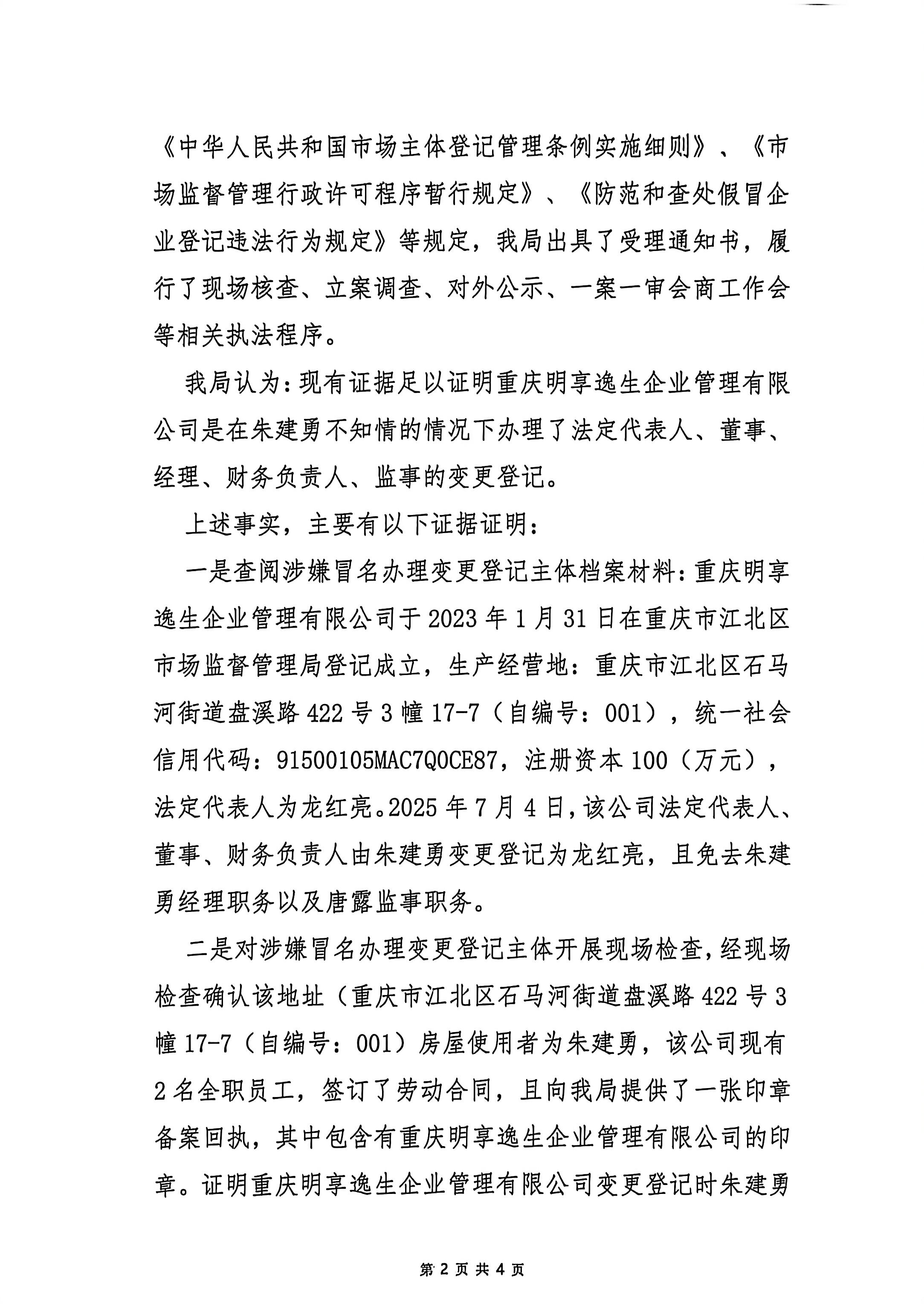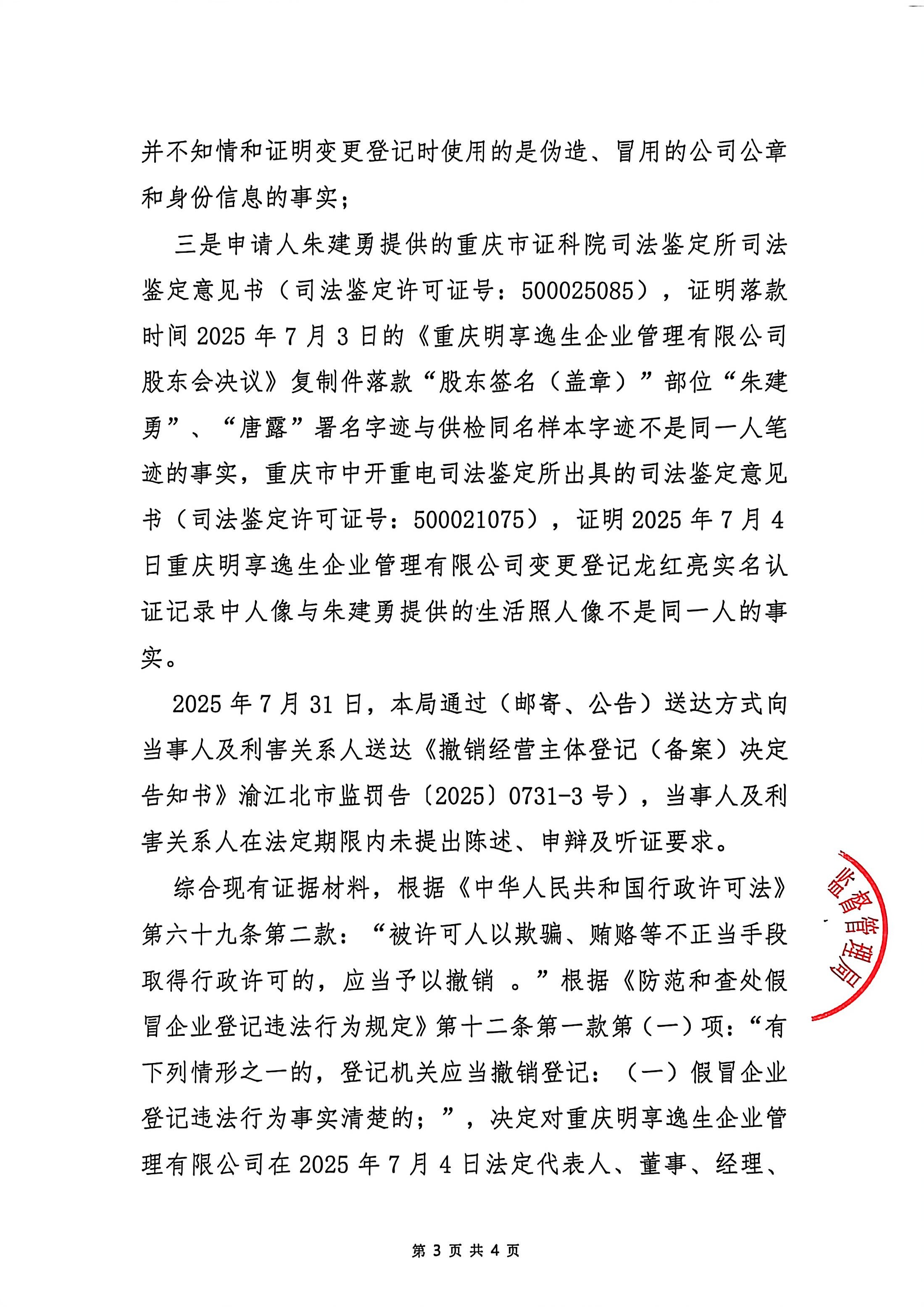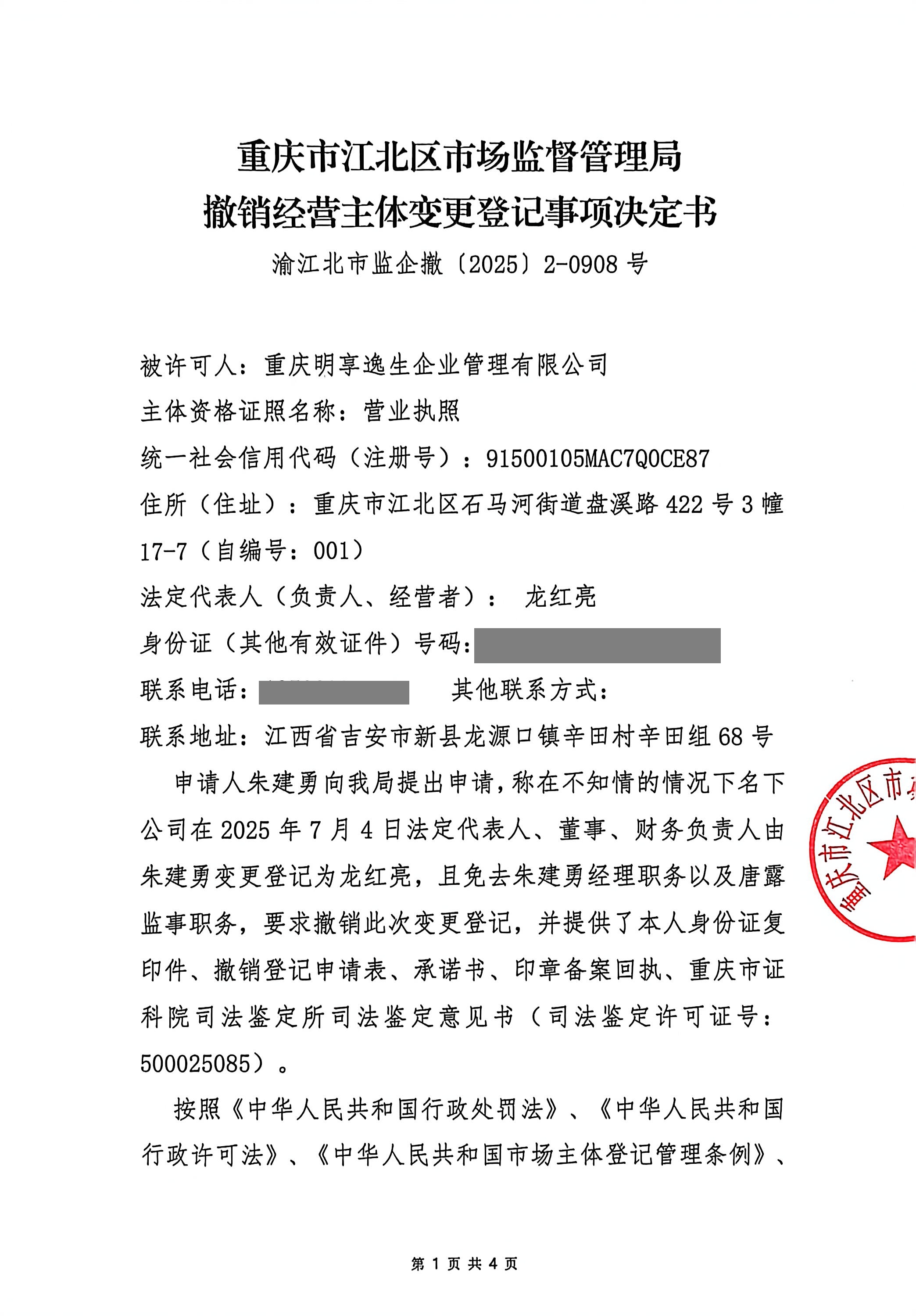 重庆市江北区市场监督管理局撤销经营主体变更登记事项决定书(重庆明享逸生企业管理有限公司)