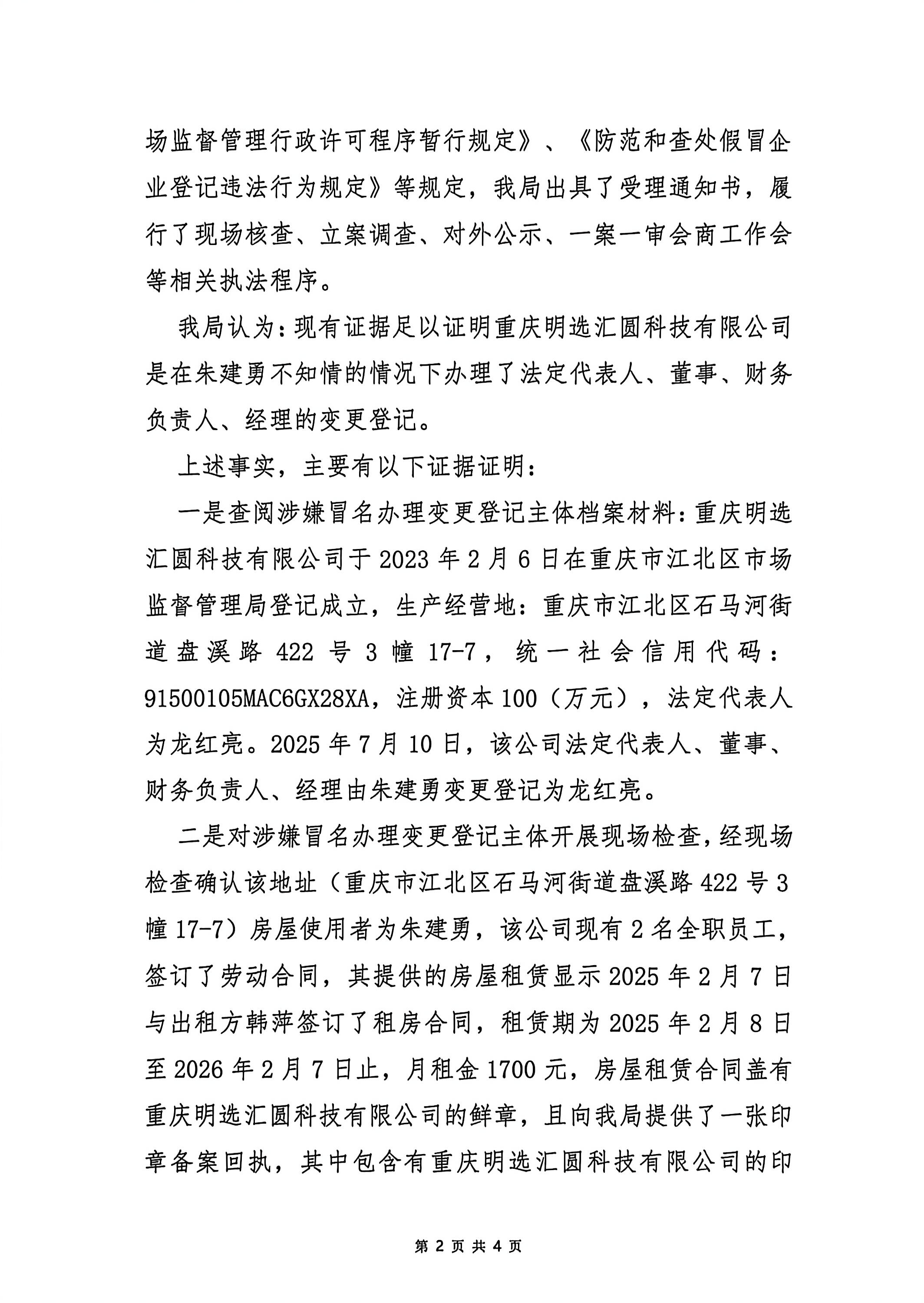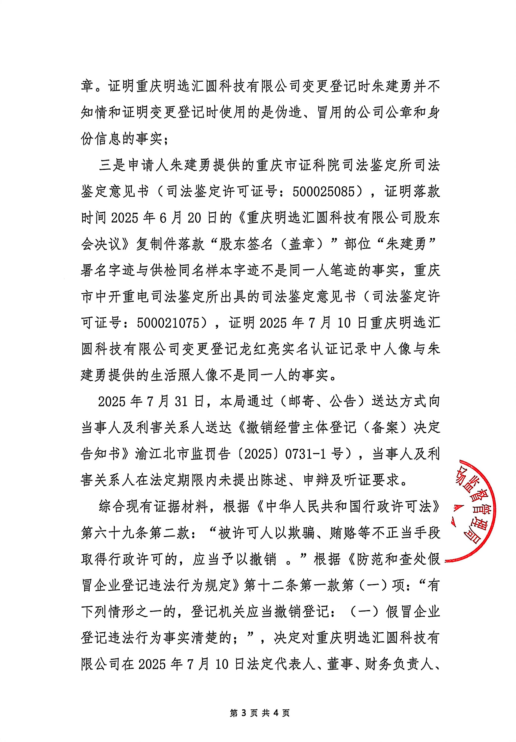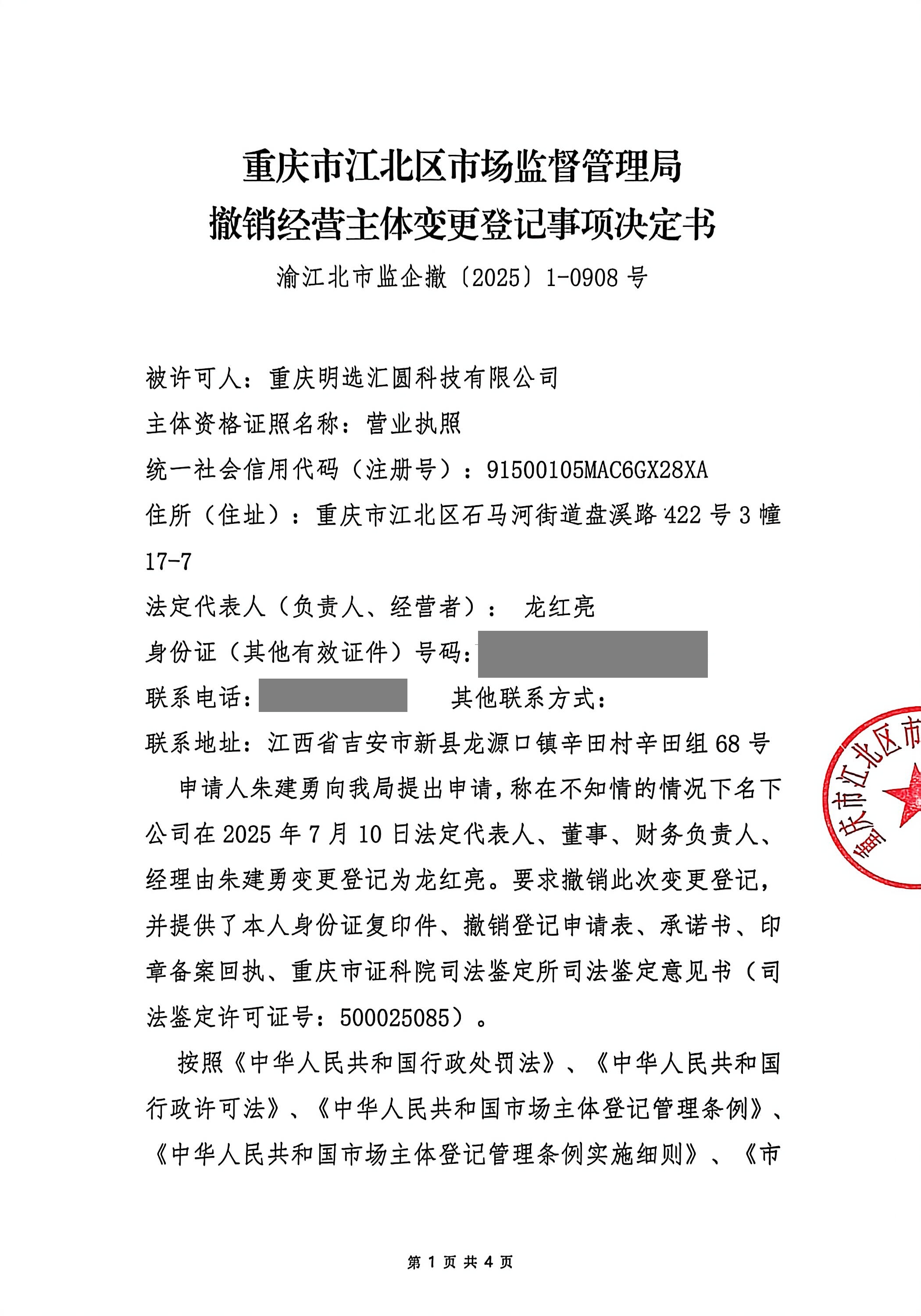 重庆市江北区市场监督管理局撤销经营主体变更登记事项决定书(重庆明选汇圆科技有限公司)