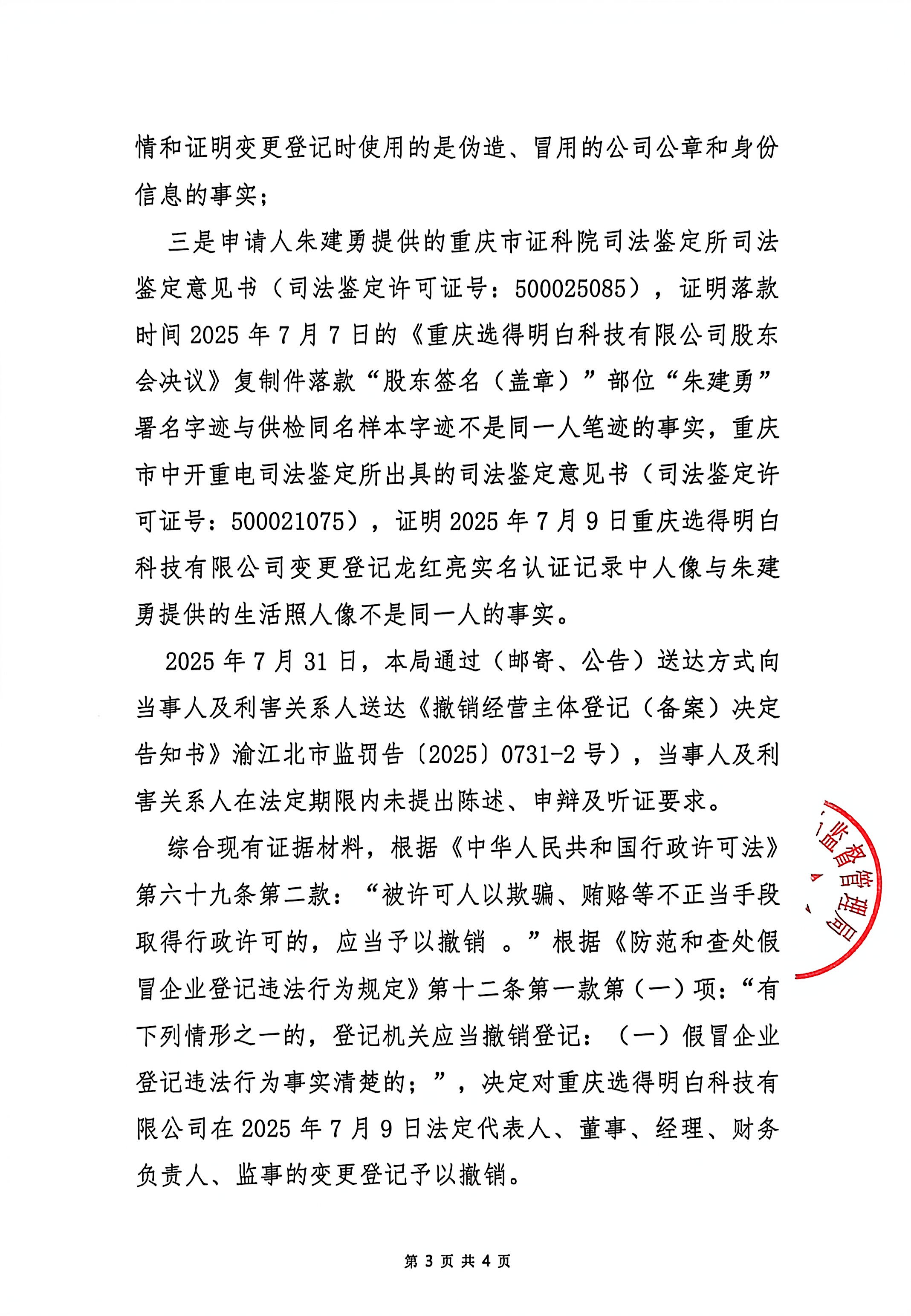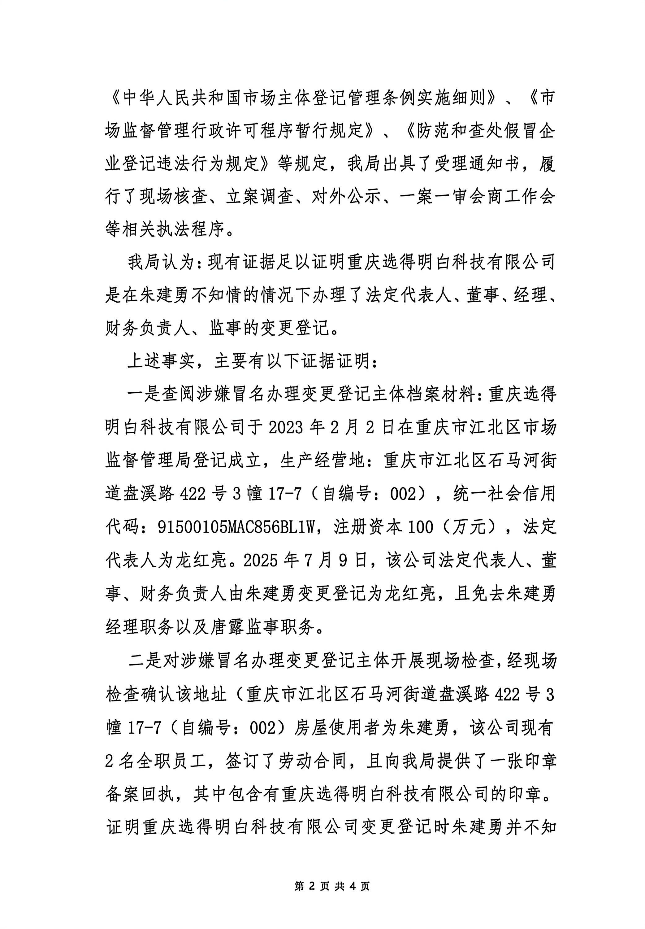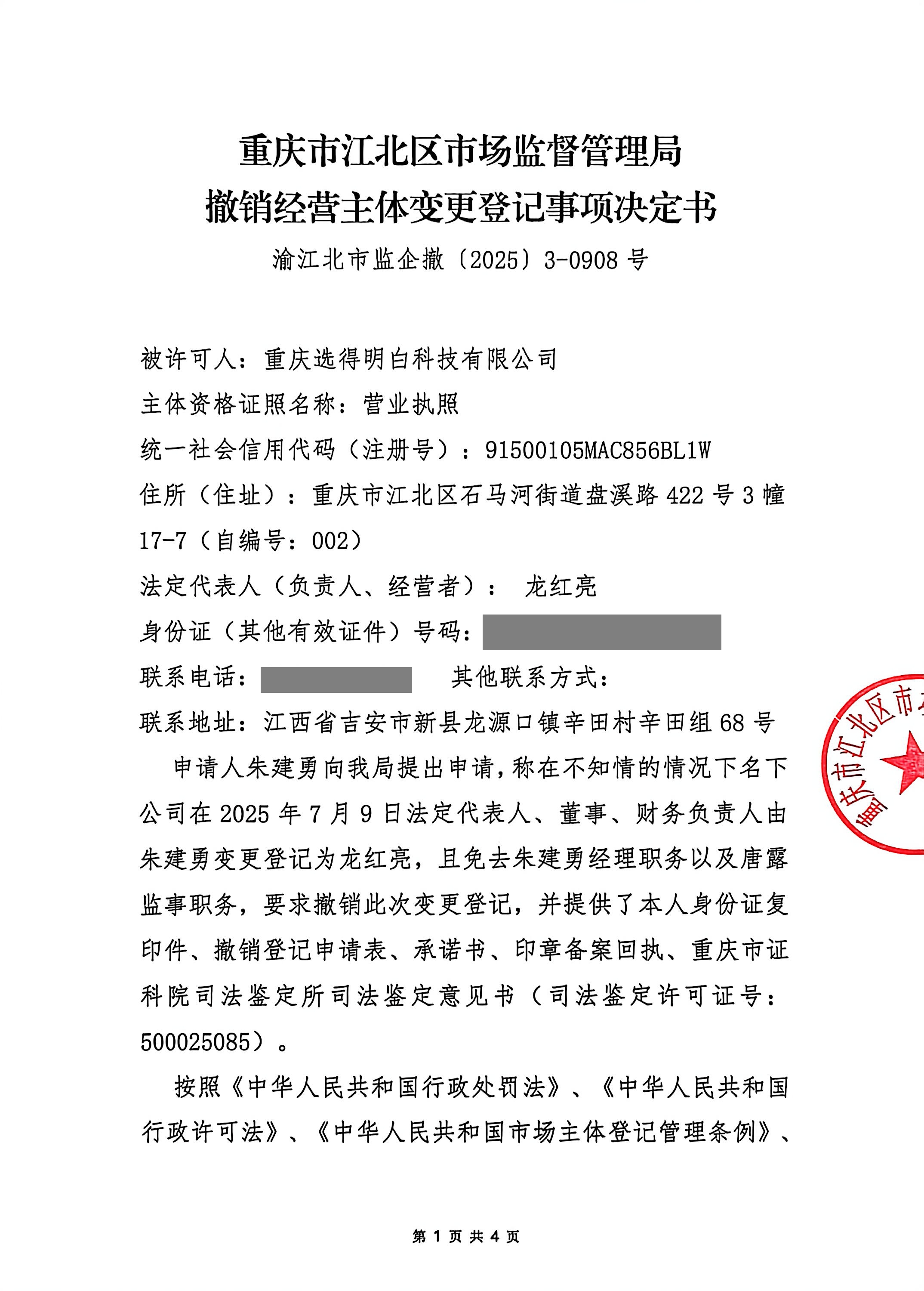重庆市江北区市场监督管理局撤销经营主体变更登记事项决定书(重庆选得明白科技有限公司)