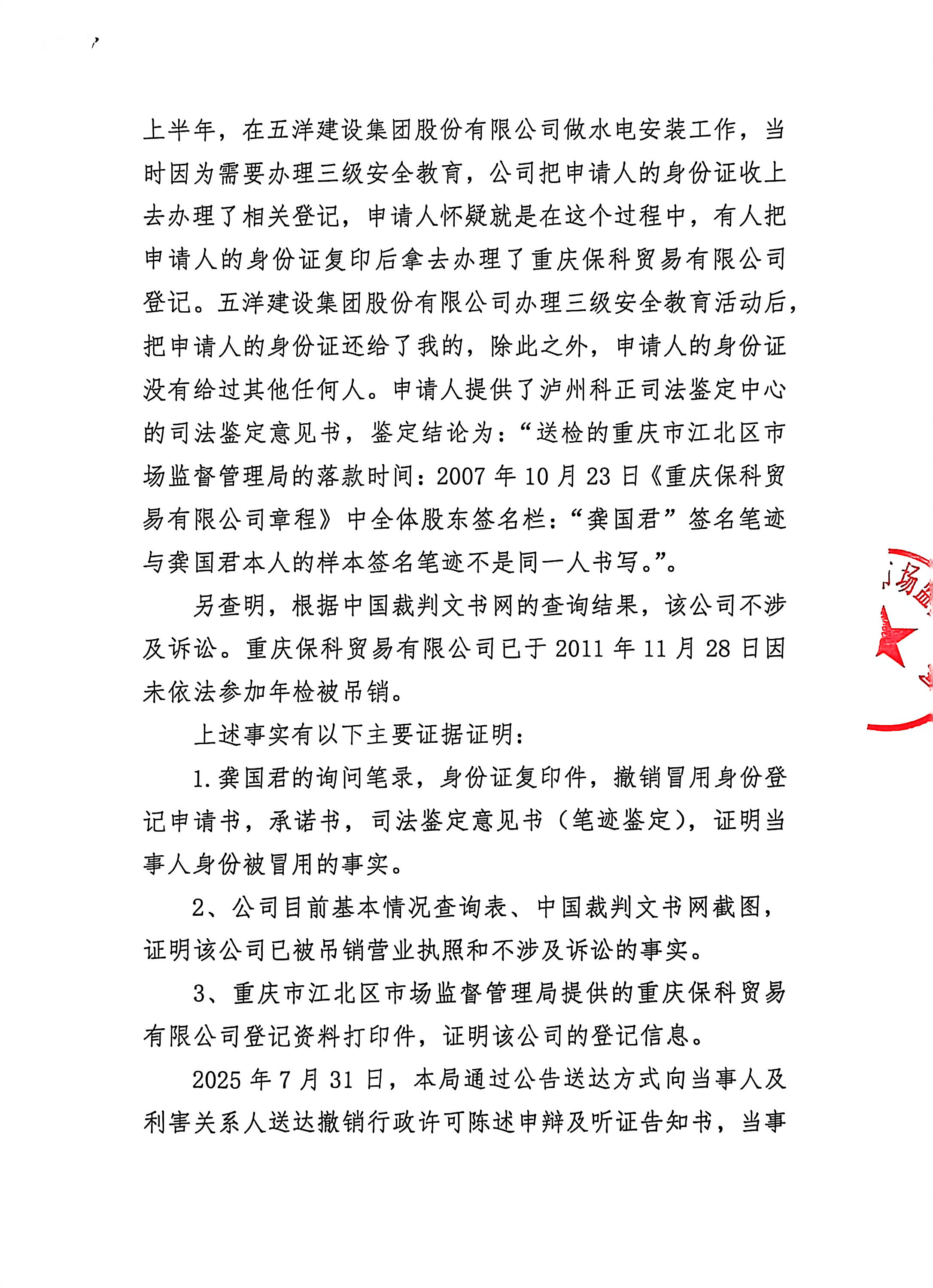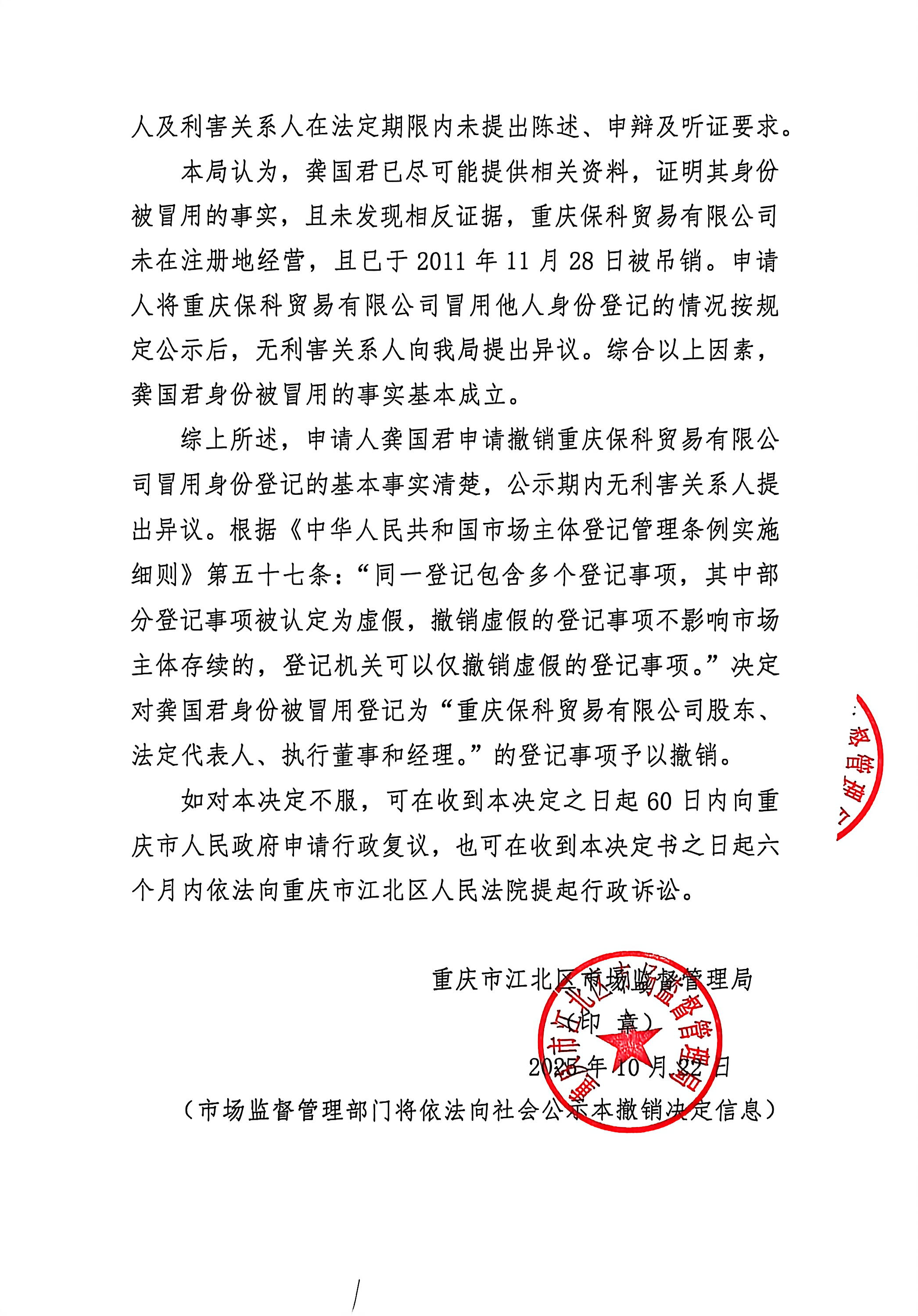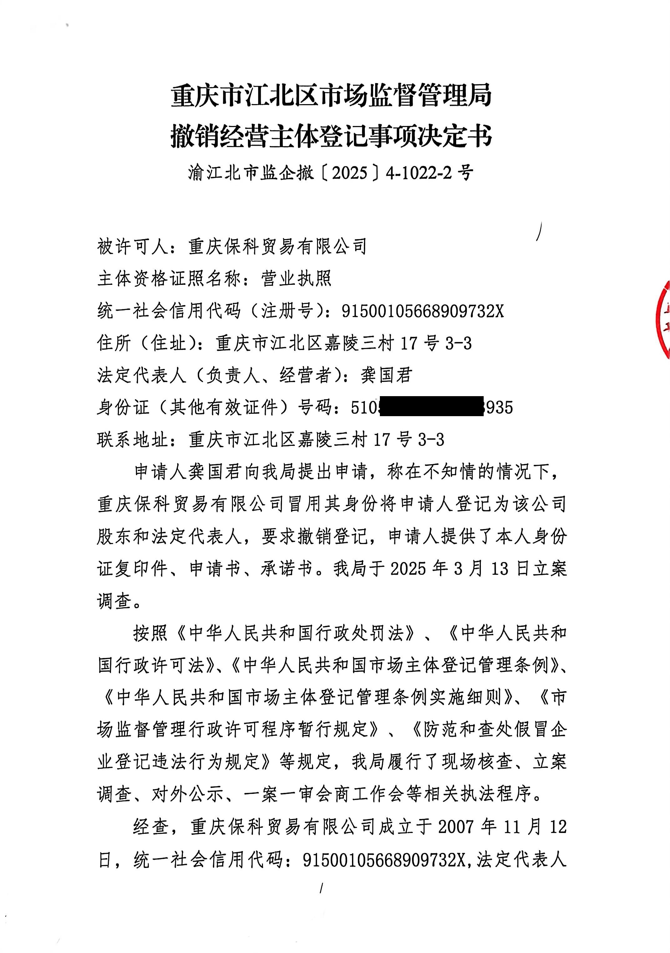 重庆市江北区市场监督管理局撤销经营主体登记事项决定书(重庆保科贸易有限公司)