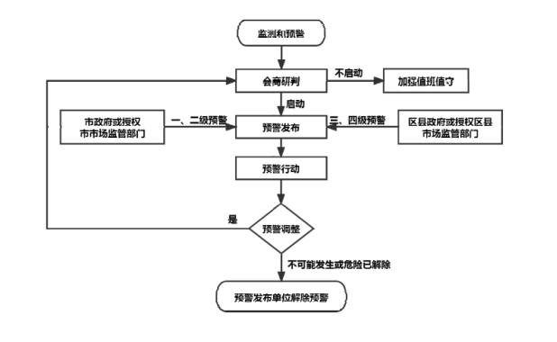 一级或二级预警由市市场监管部门组织有关部门和机构、专业技术人员及专家进行会商研判,预估可能的影响范围和危害程度,向市政府提出预警级别建议。一级或二级预警信息由市政府或授权市市场监管部门发布。三级或四级预警由区县市场监管部