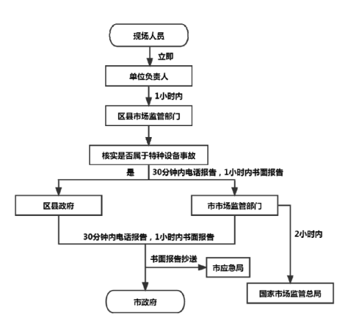 区县市场监管部门接到有关特种设备事故报告后,应当立即组织查证核实。属于特种设备事故的,应当在接到报告后30分钟内电话报告、1小时内书面报告本级政府和市市场监管部门。