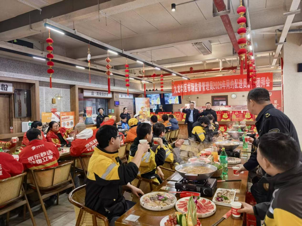 团年饭不仅是一顿餐,更是一座城的温情。2月14日中午,九龙坡区市场监管局以一场别开生面的新春团拜会,将辖区的未返乡外卖小哥请进民主村社区食堂。大家围坐一堂,面对面唠家常、听心声、解难题,用真诚的关怀抚慰了游子的乡愁,让城市“奔跑者”在异乡也能温暖过年。