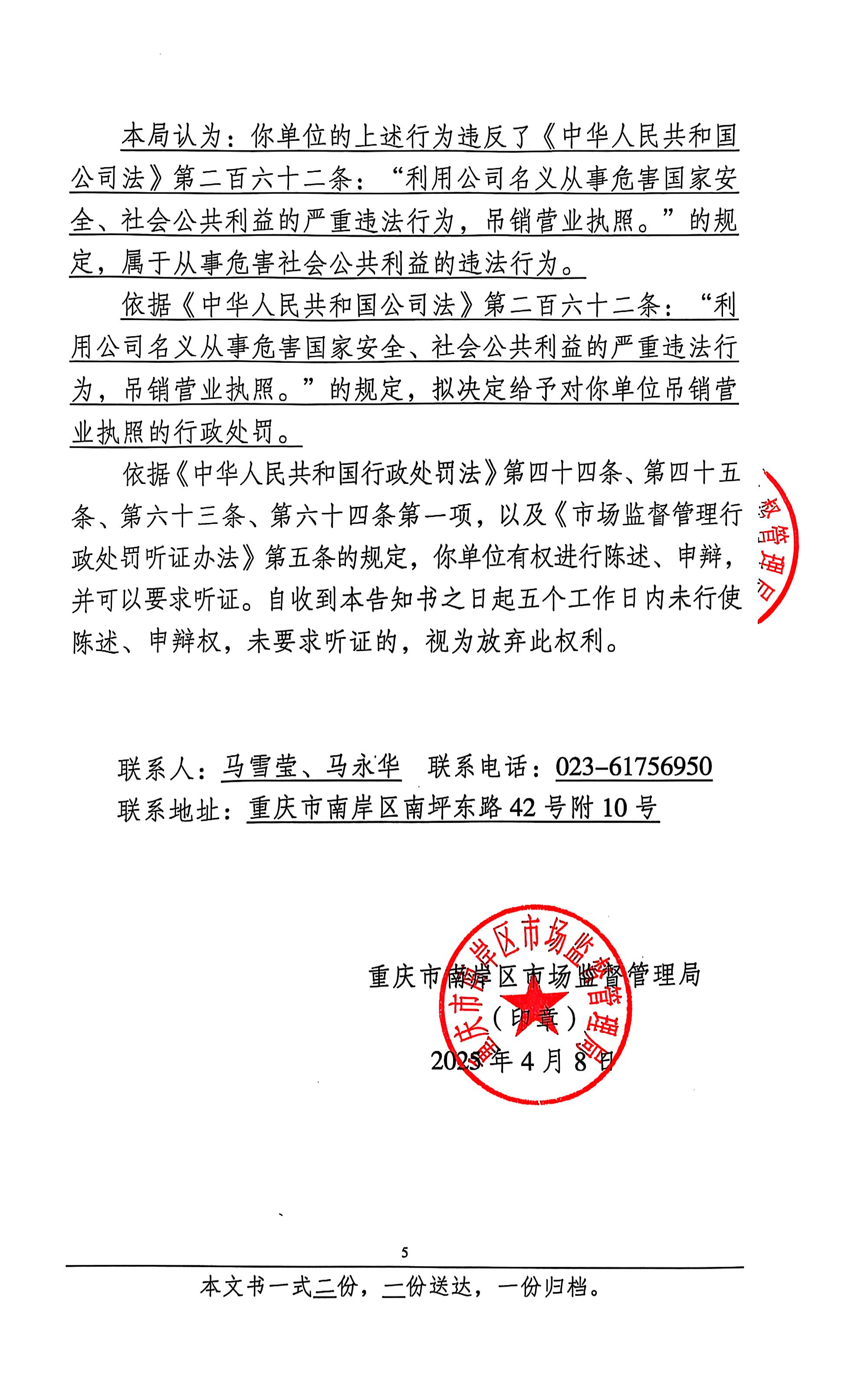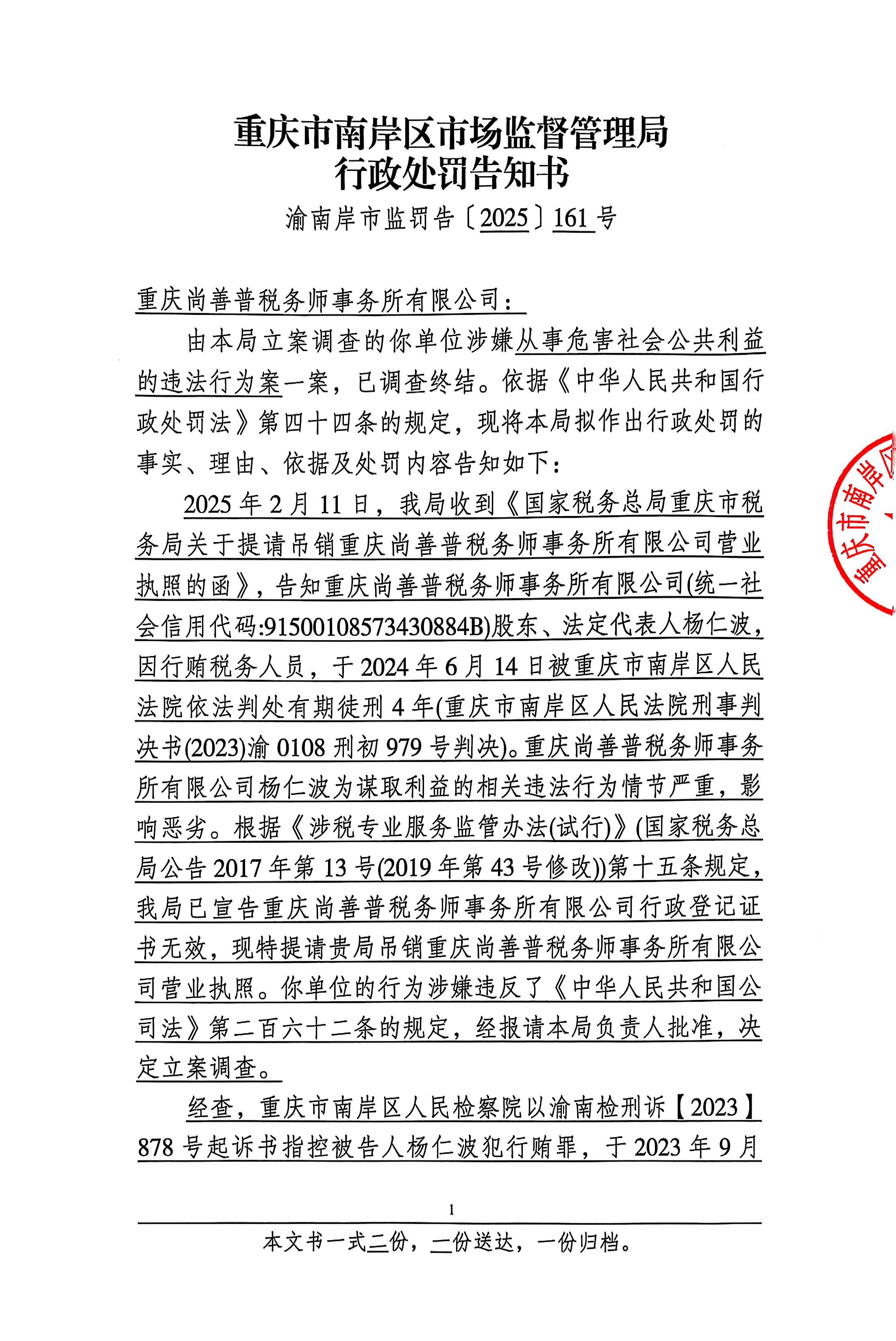 | [ 发文字号 ] | 渝南岸市监罚告【2025】161号 |