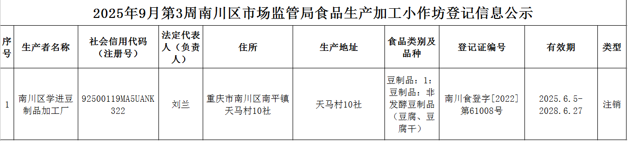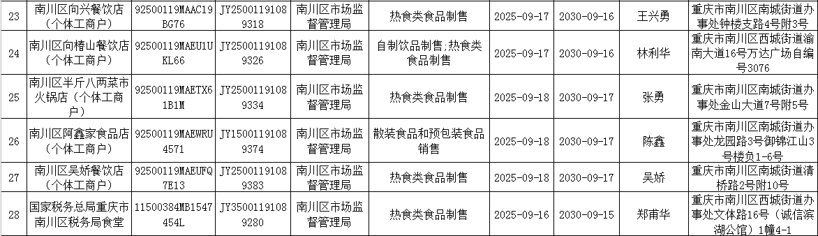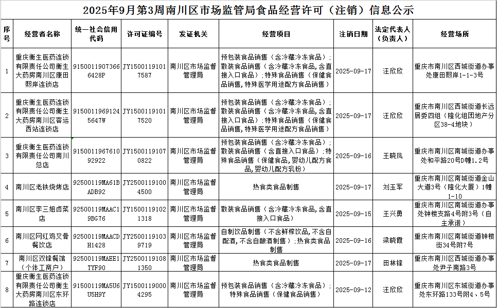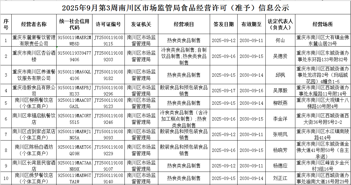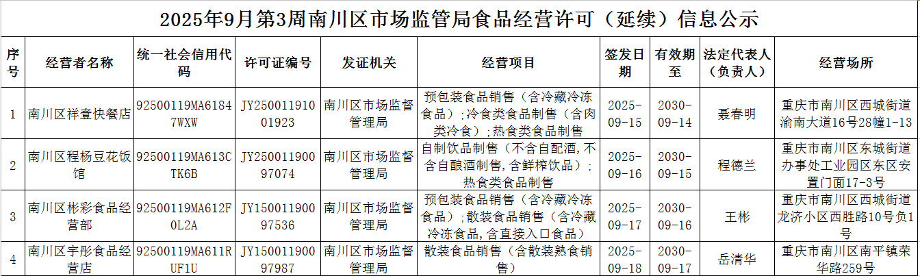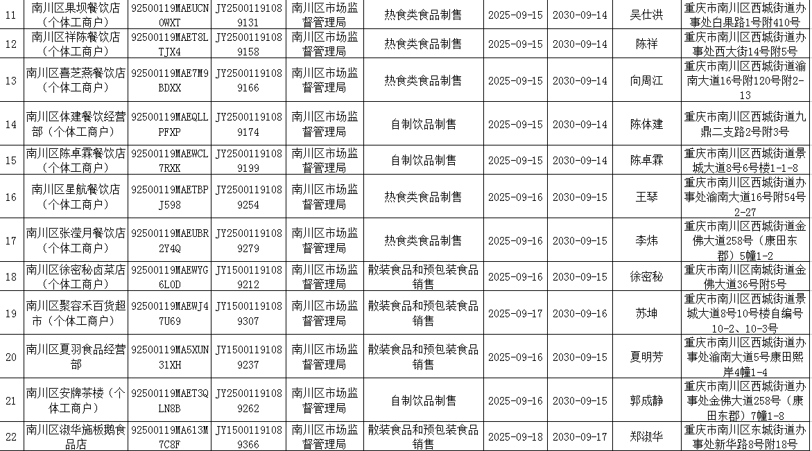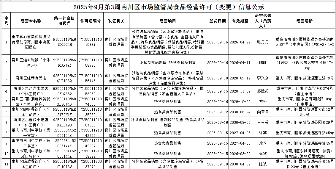 2025年9月第3周南川区市场监管局食品行政审批许可信息