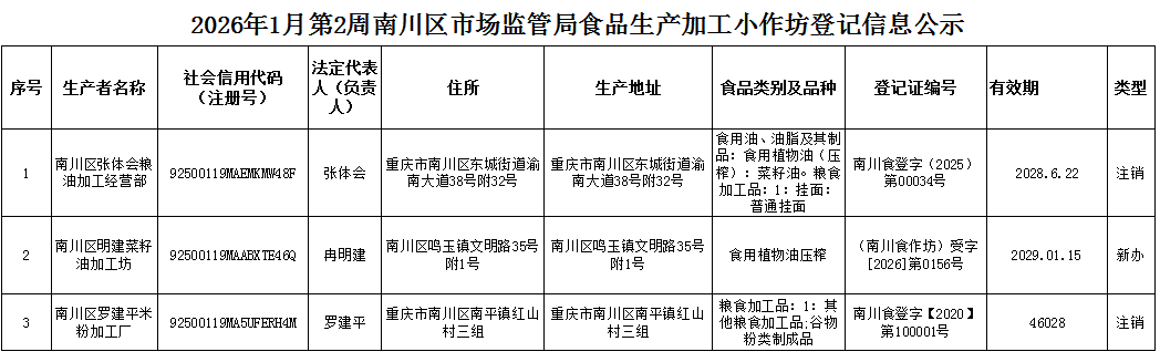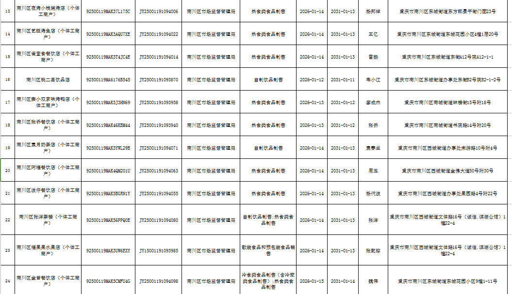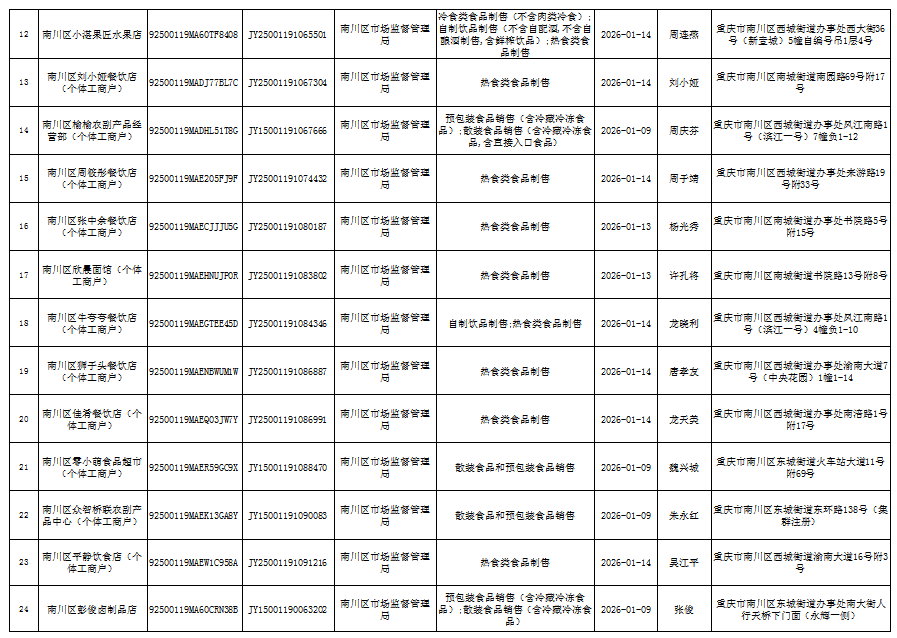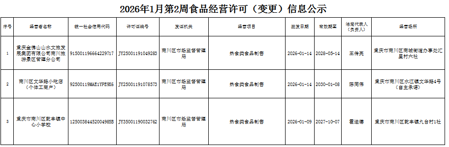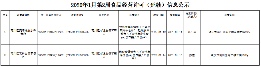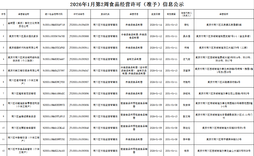 2026年1月第2周南川区市场监管局食品行政审批许可信息