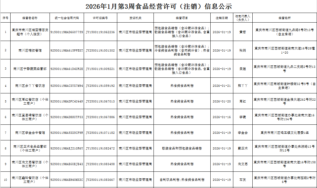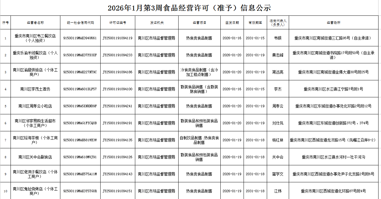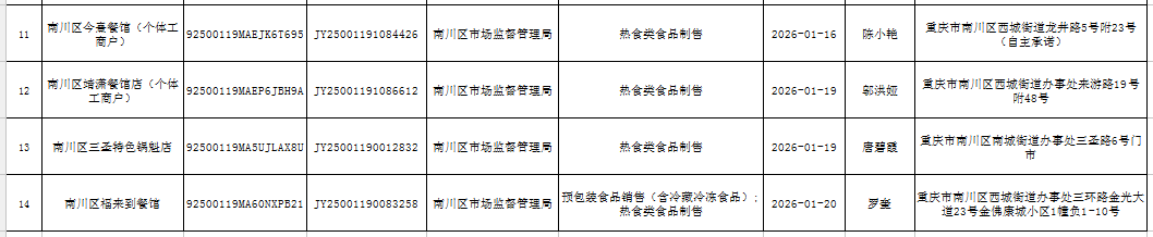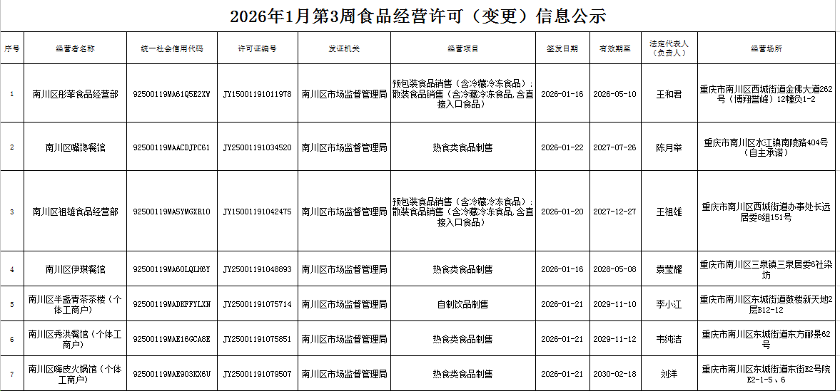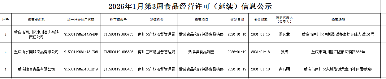2026年1月第3周南川区市场监管局食品行政审批许可信息