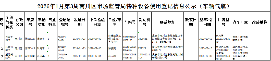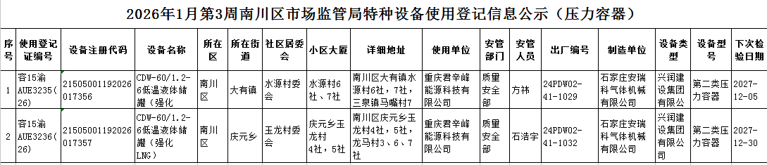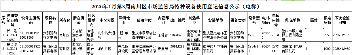 2026年1月第3周南川区市场监管局特种设备使用登记信息