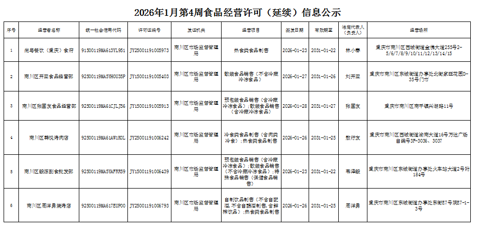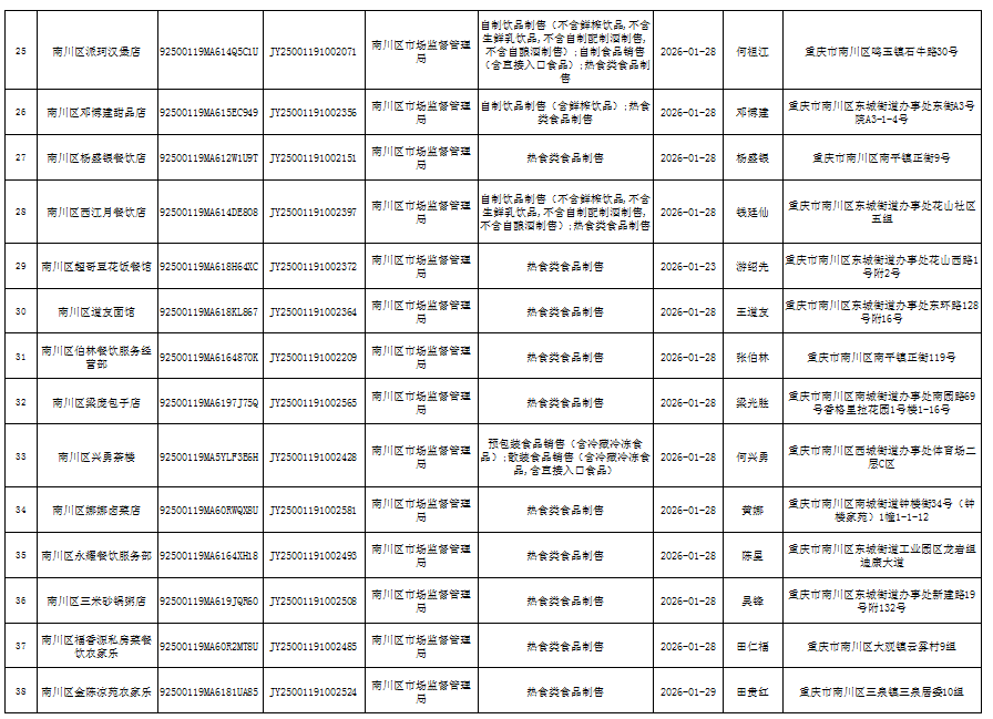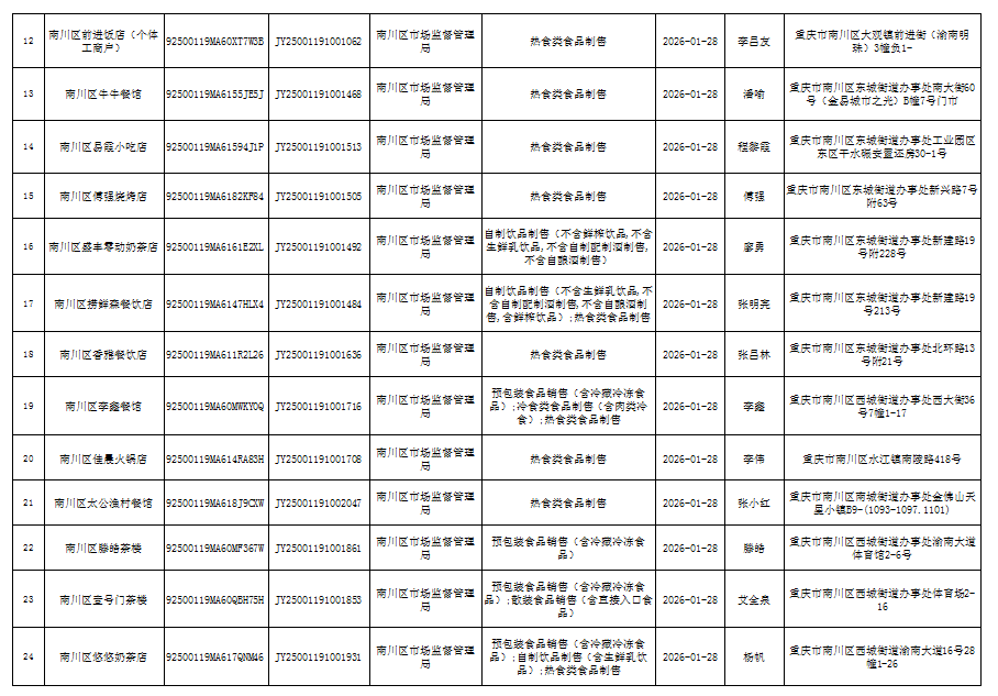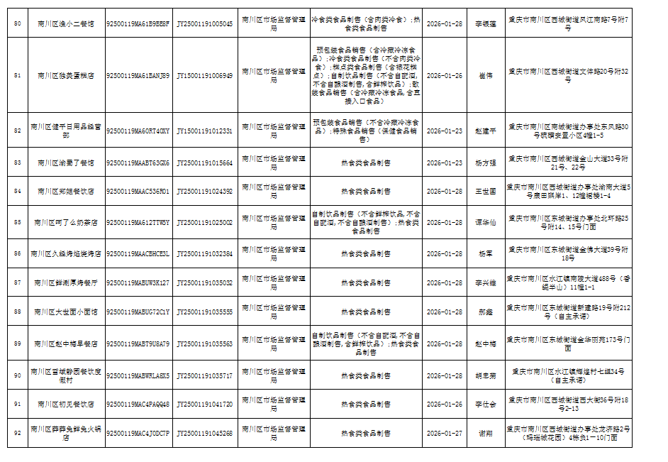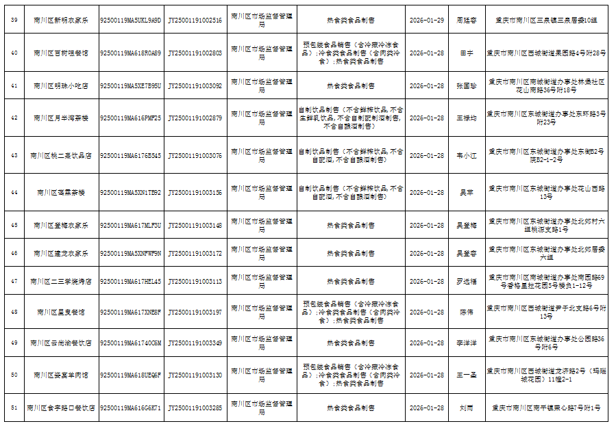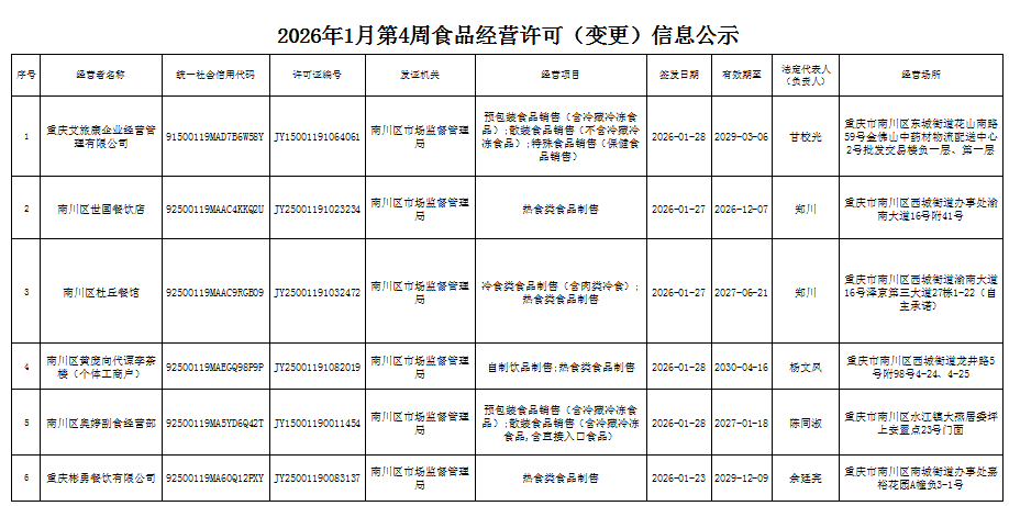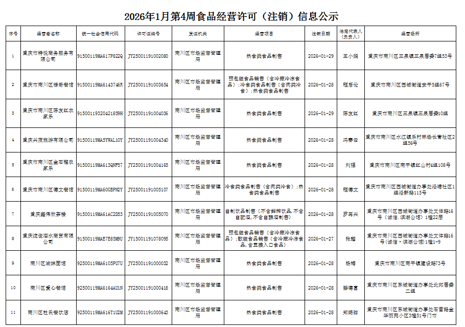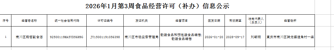 2026年1月第4周南川区市场监管局食品行政审批许可信息