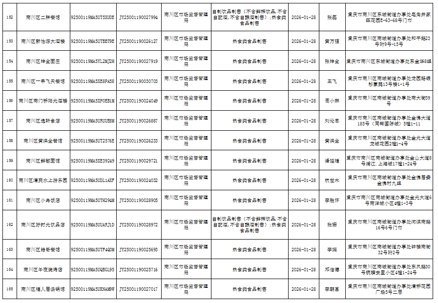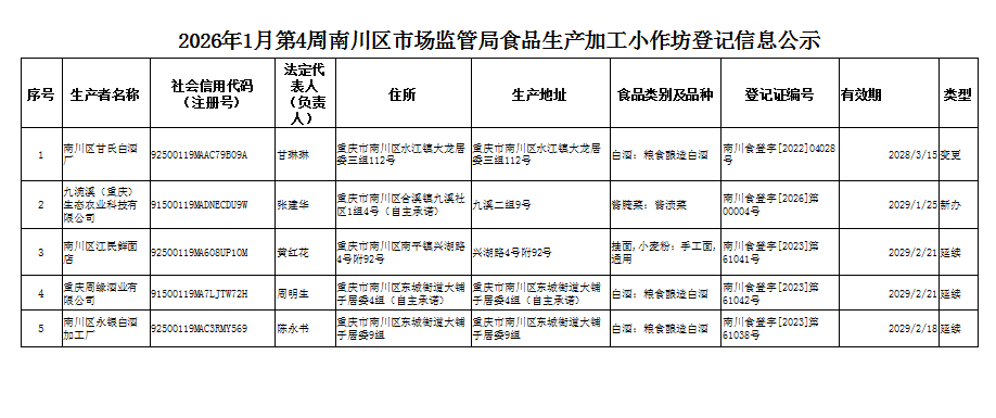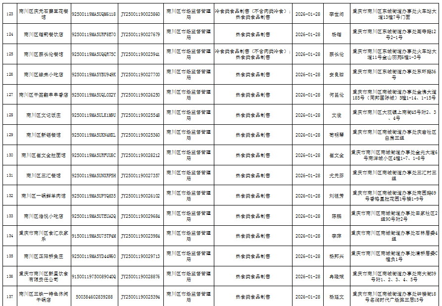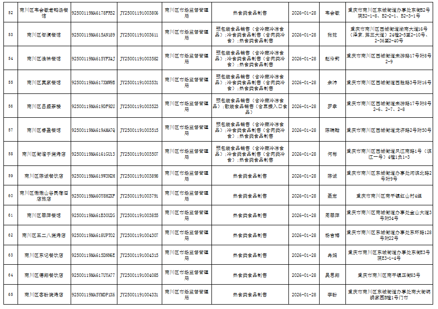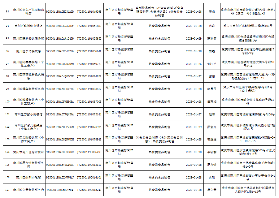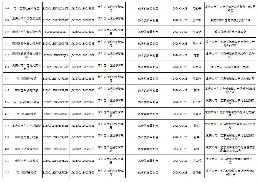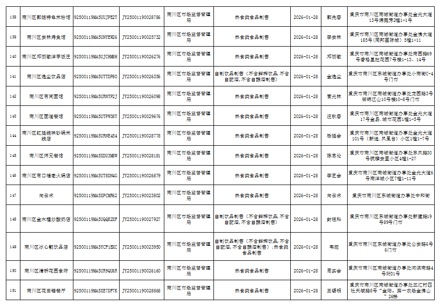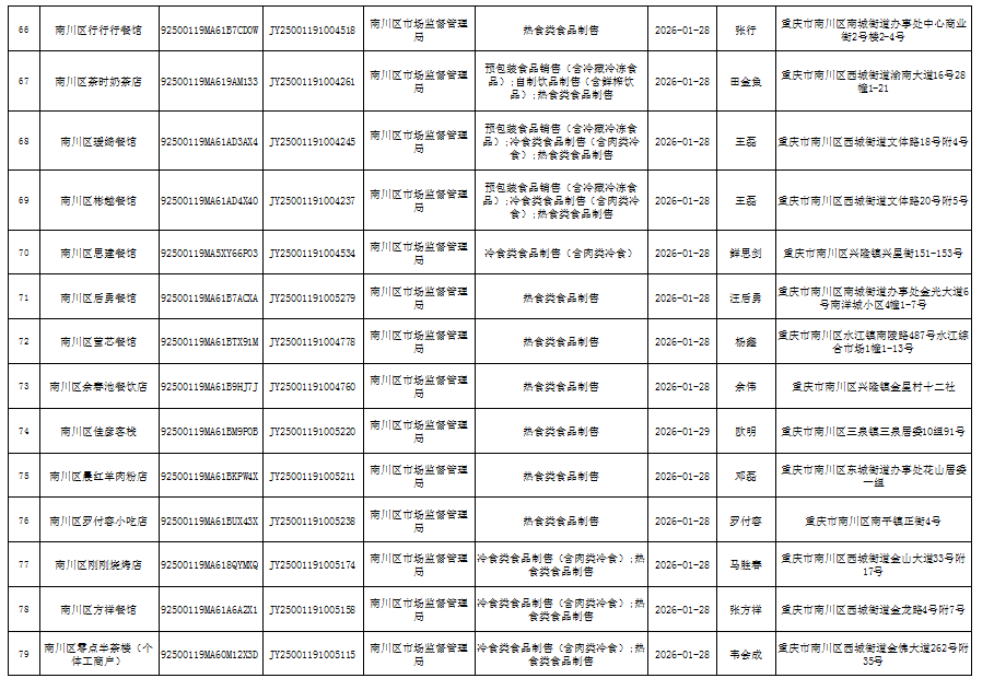 2026年1月第4周南川区市场监管局食品行政审批许可信息