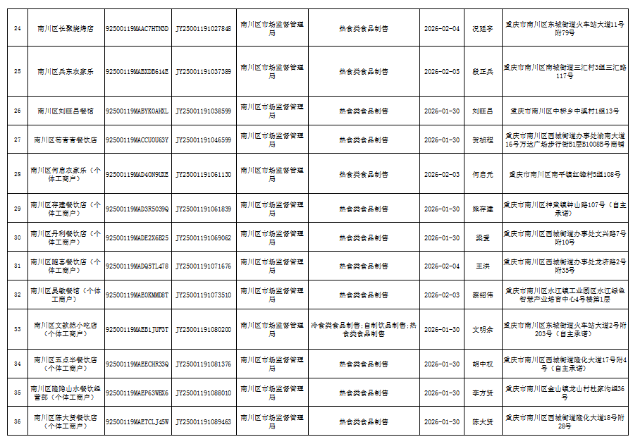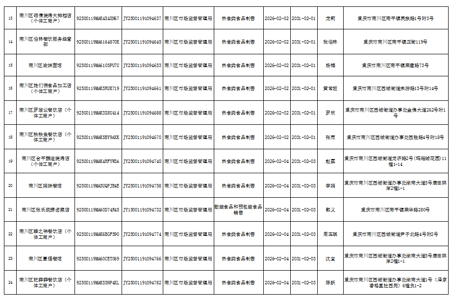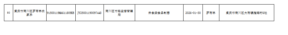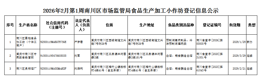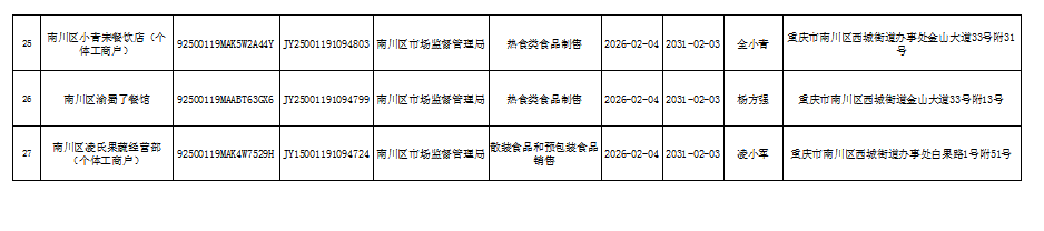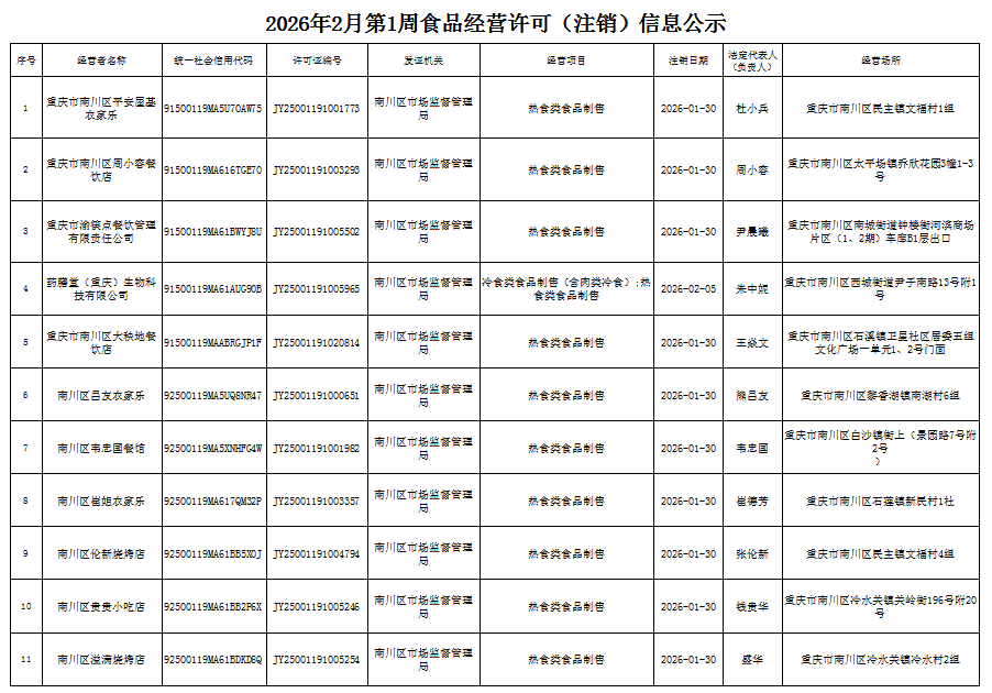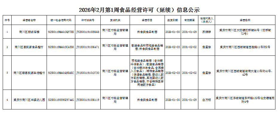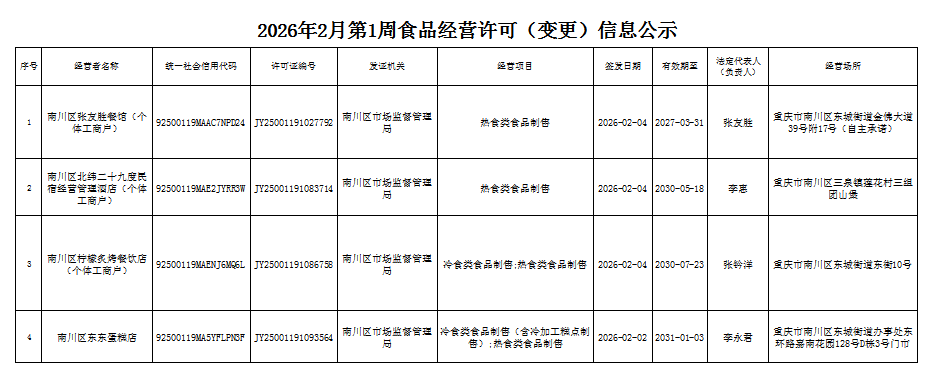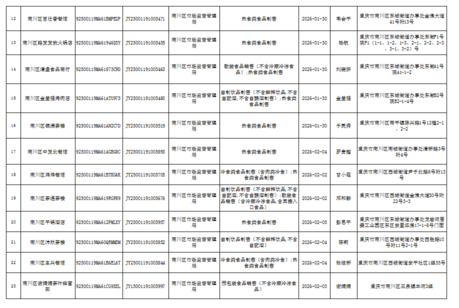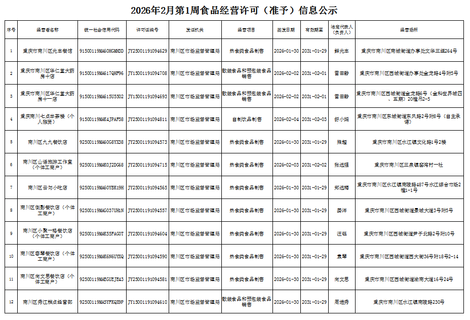 2026年2月第1周南川区市场监管局食品行政审批许可信息