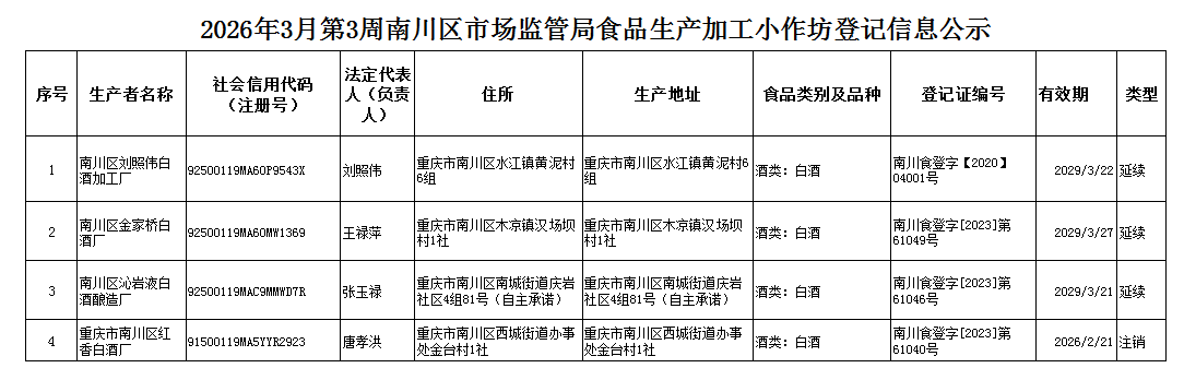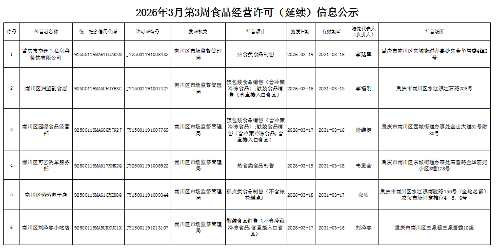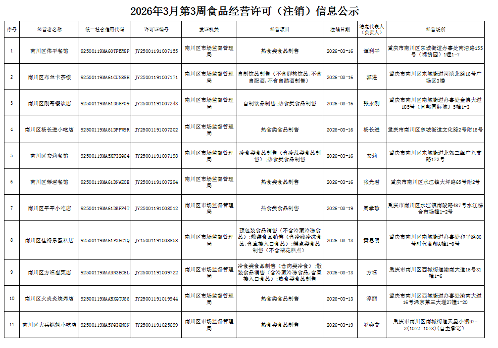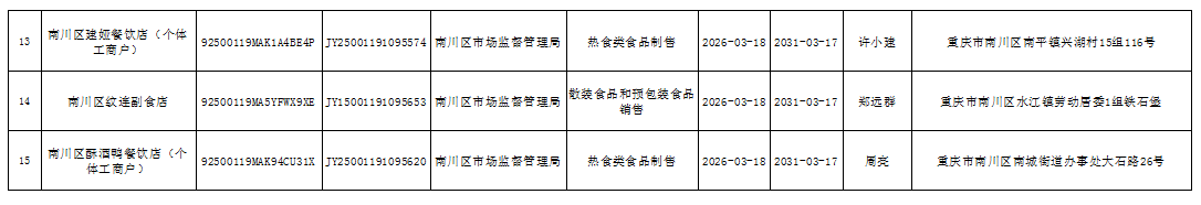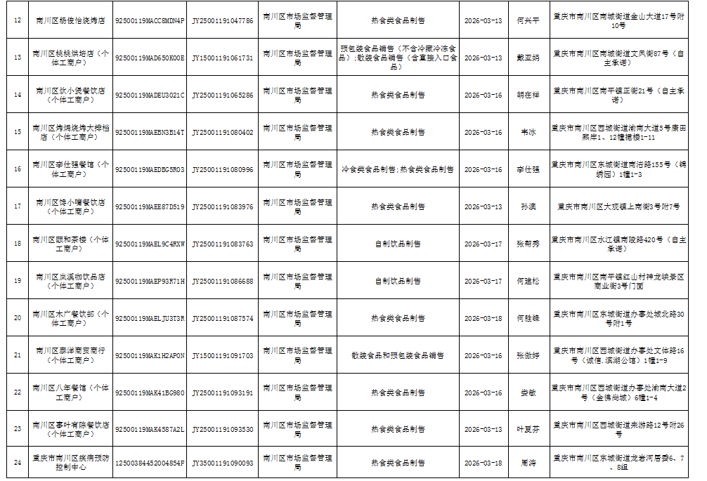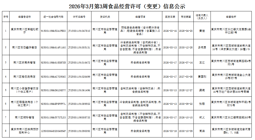 2026年3月第3周南川区市场监管局食品行政审批许可信息