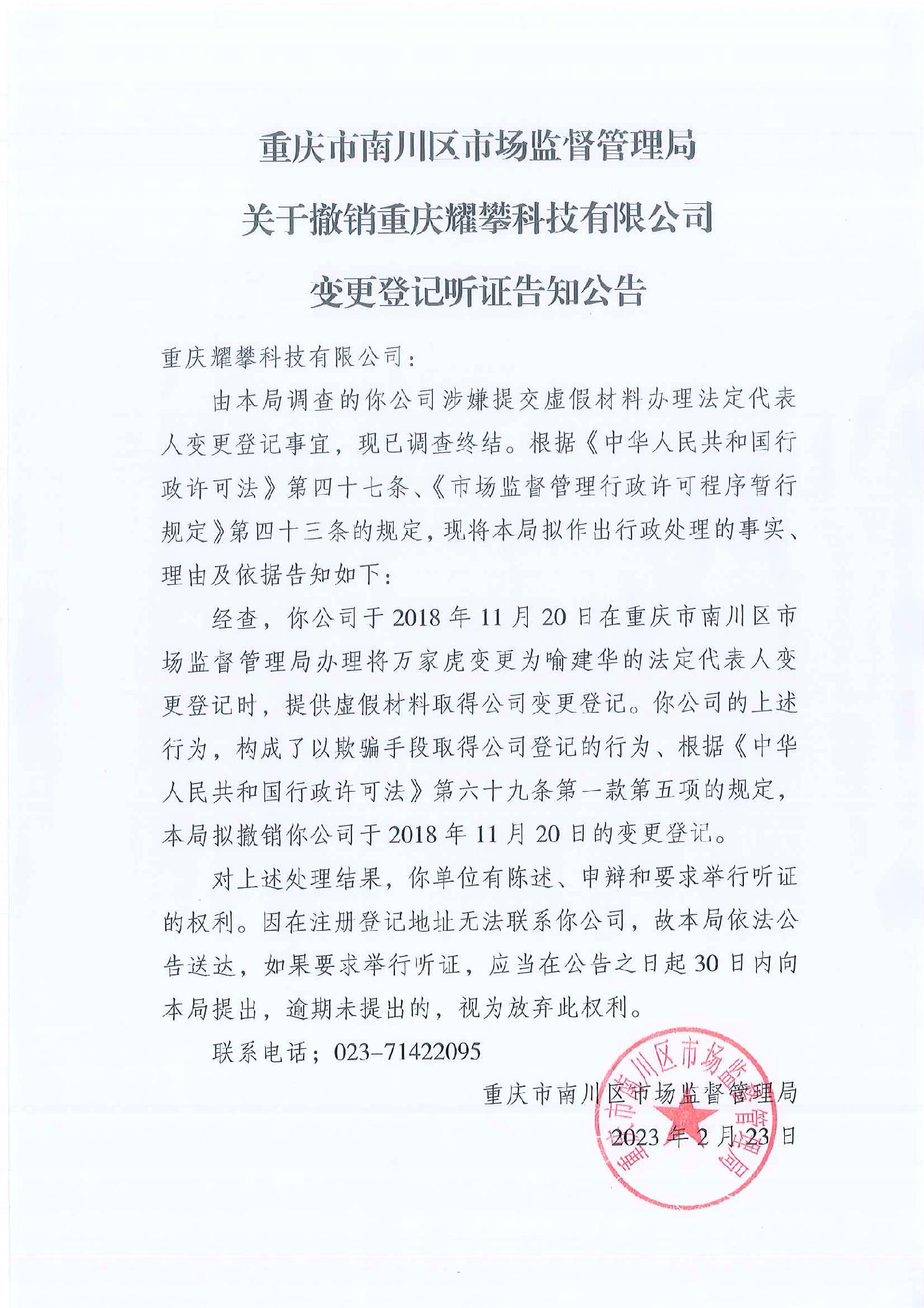 重庆市南川区市场监督管理局关于撤销重庆耀攀科技有限公司变更登记听证告知公告