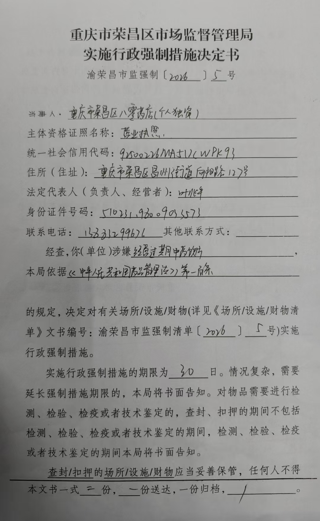 | [ 索引号 ] | 11500000MB16179345/2026-00019 | [ 发文字号 ] | 渝荣昌市监强制〔2026〕5号 |