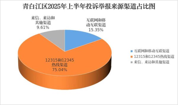 2025年上半年,沙坪坝区、青白江区两地消费者通过互联网和移动互联渠道(含互联网平台、手机APP、公众号、小程序)自行登记投诉举报8054件,占投诉举报总量的37.06%;其中,青白江区1190件,同比下降31.92%;沙坪坝区6864件,同比增长30.52 %。12315和12345热线渠道登记投诉举报12910件,占投诉举报总量的59.4%。其中青白江区5817件,同比增长9.43%;沙坪坝区7093件,同比增长11.32%;来信、来访和其他渠道登记处理投诉举报769件,占投诉举报总量的3.54%;其中青白江区745件,同比增长16.22%;沙坪坝区24件,同比增长60%。(表1)。