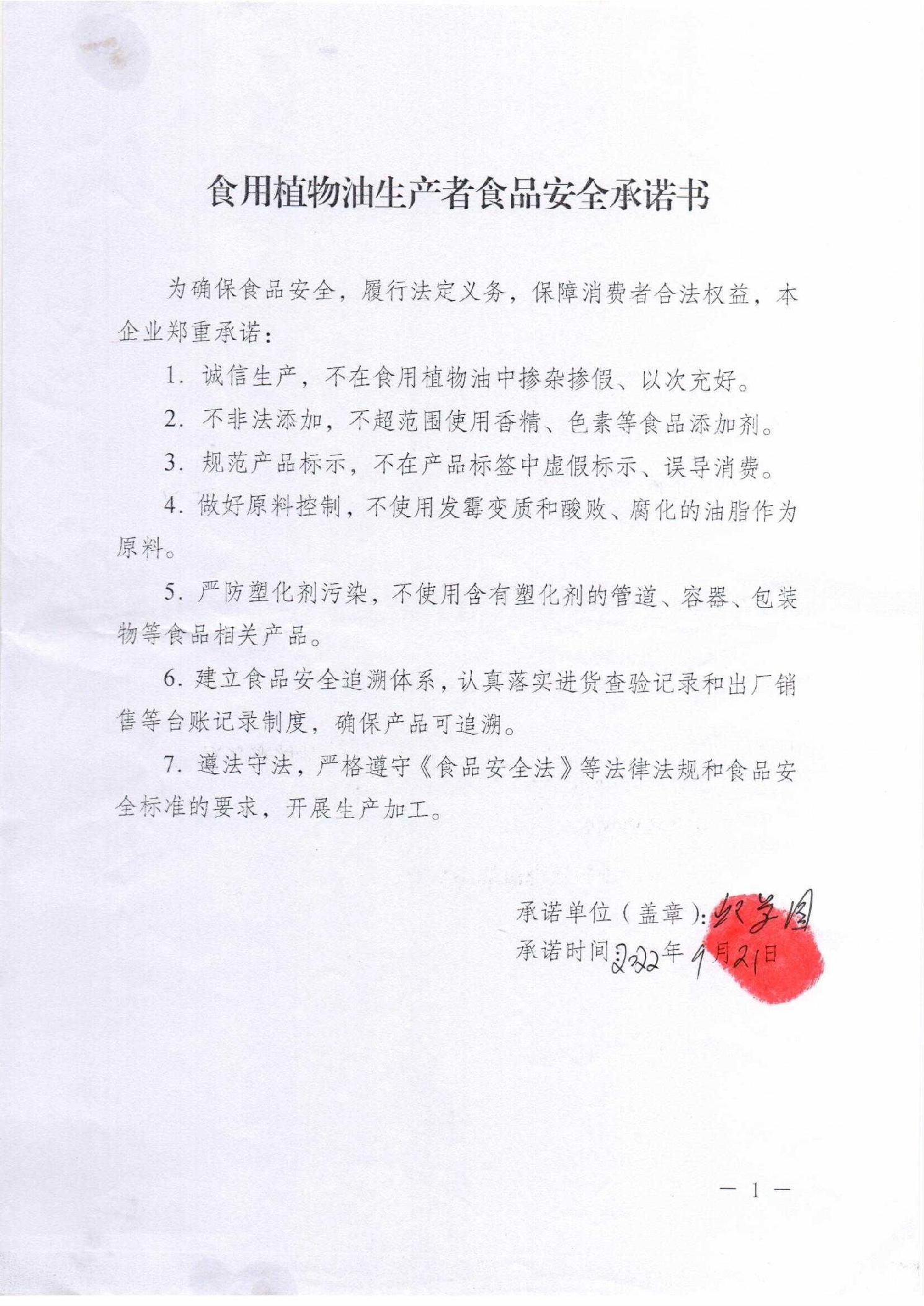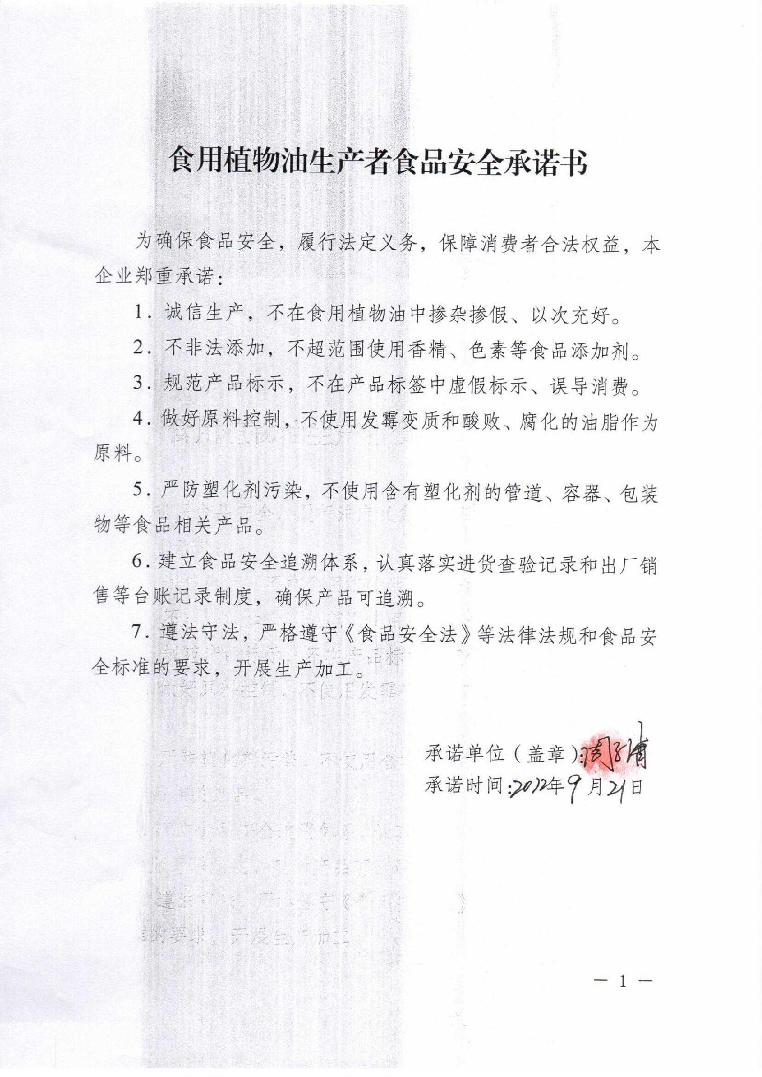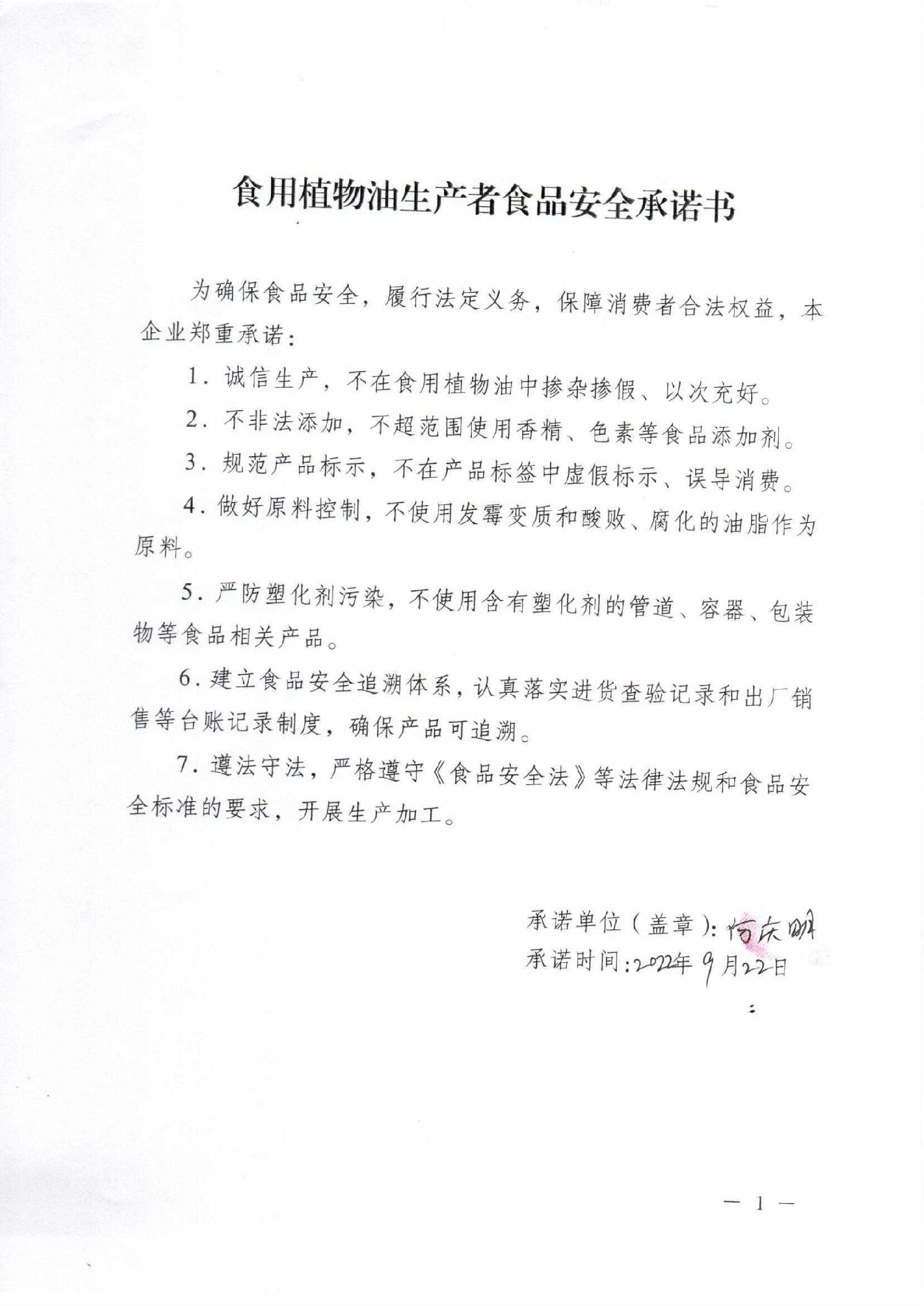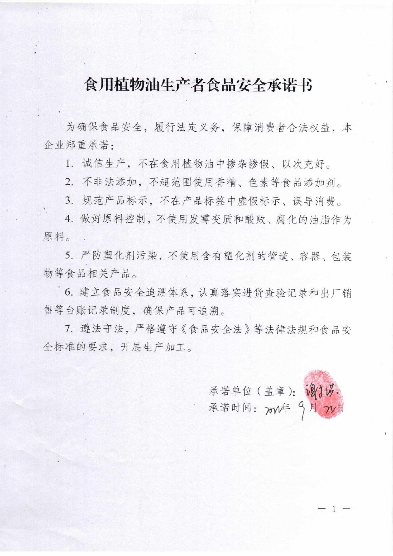 重庆市铜梁区食用植物油生产者食品安全承诺书公示